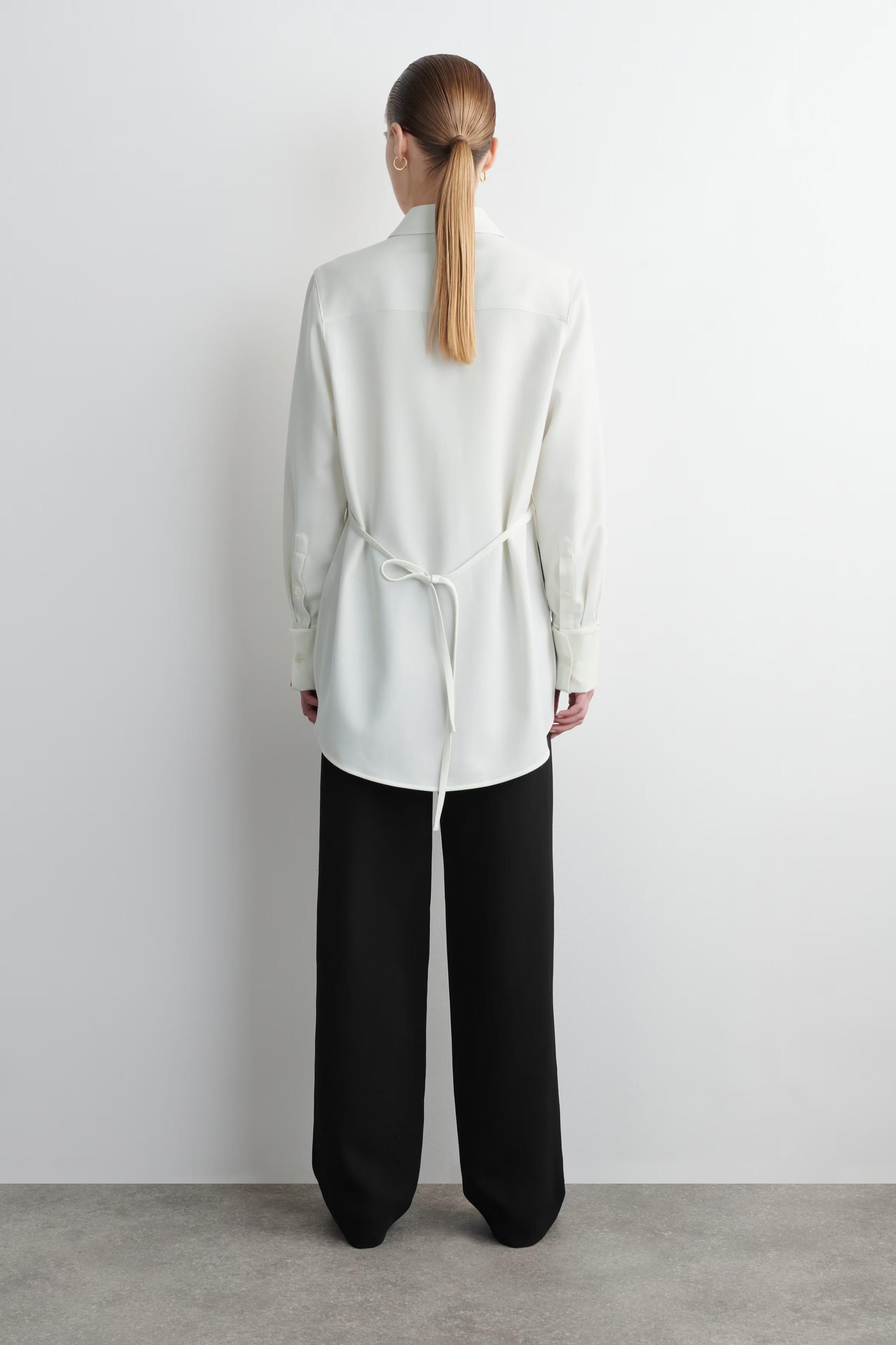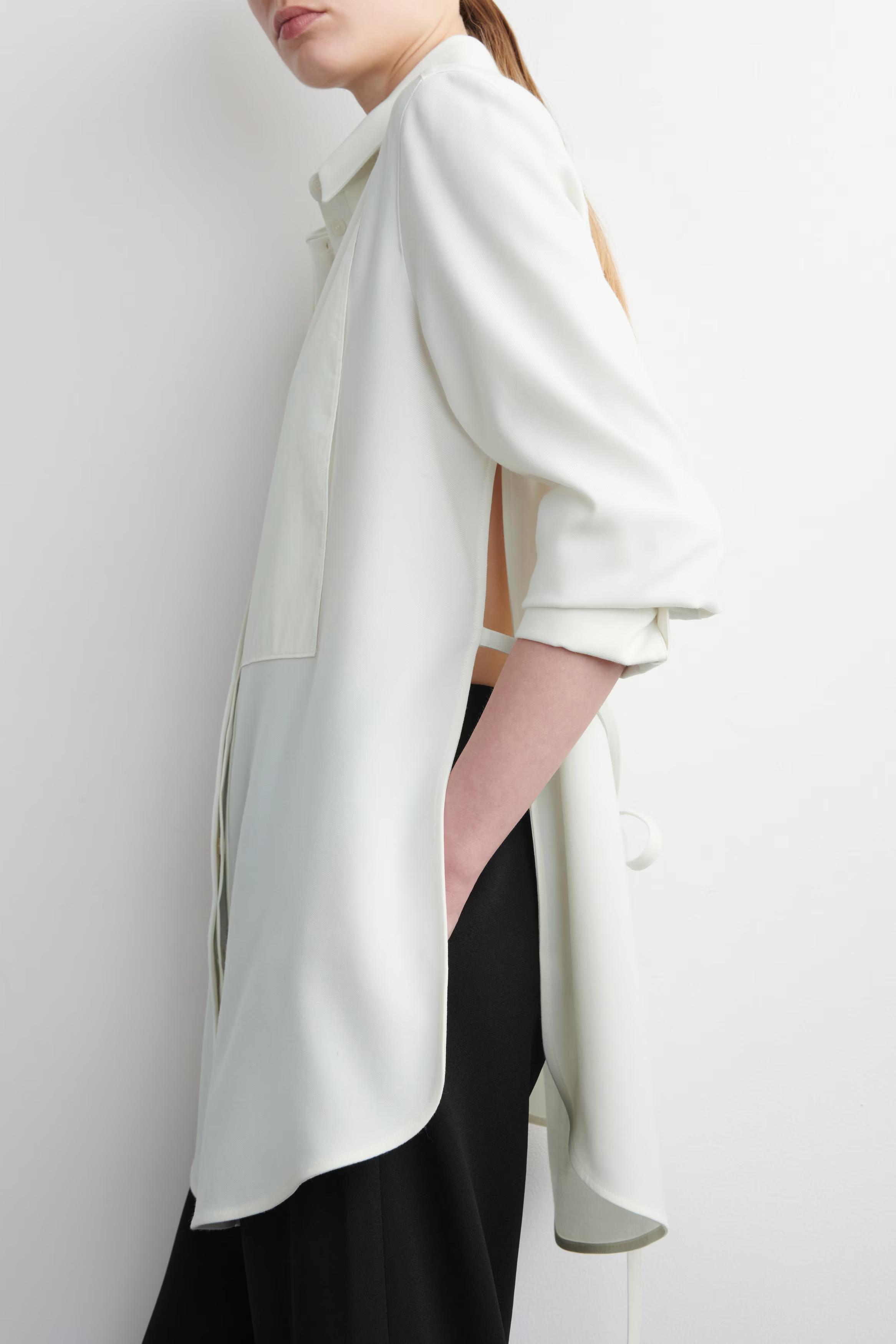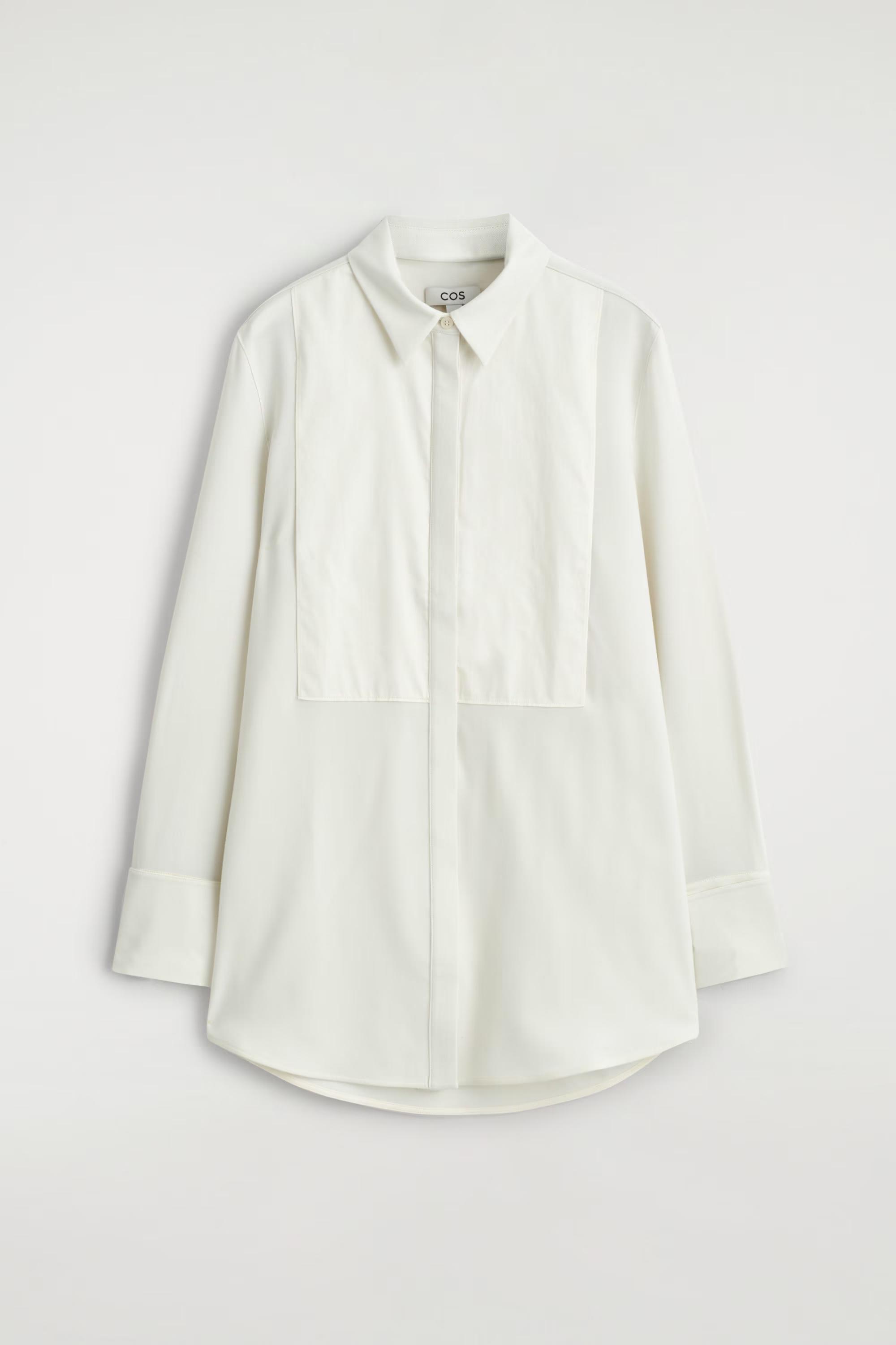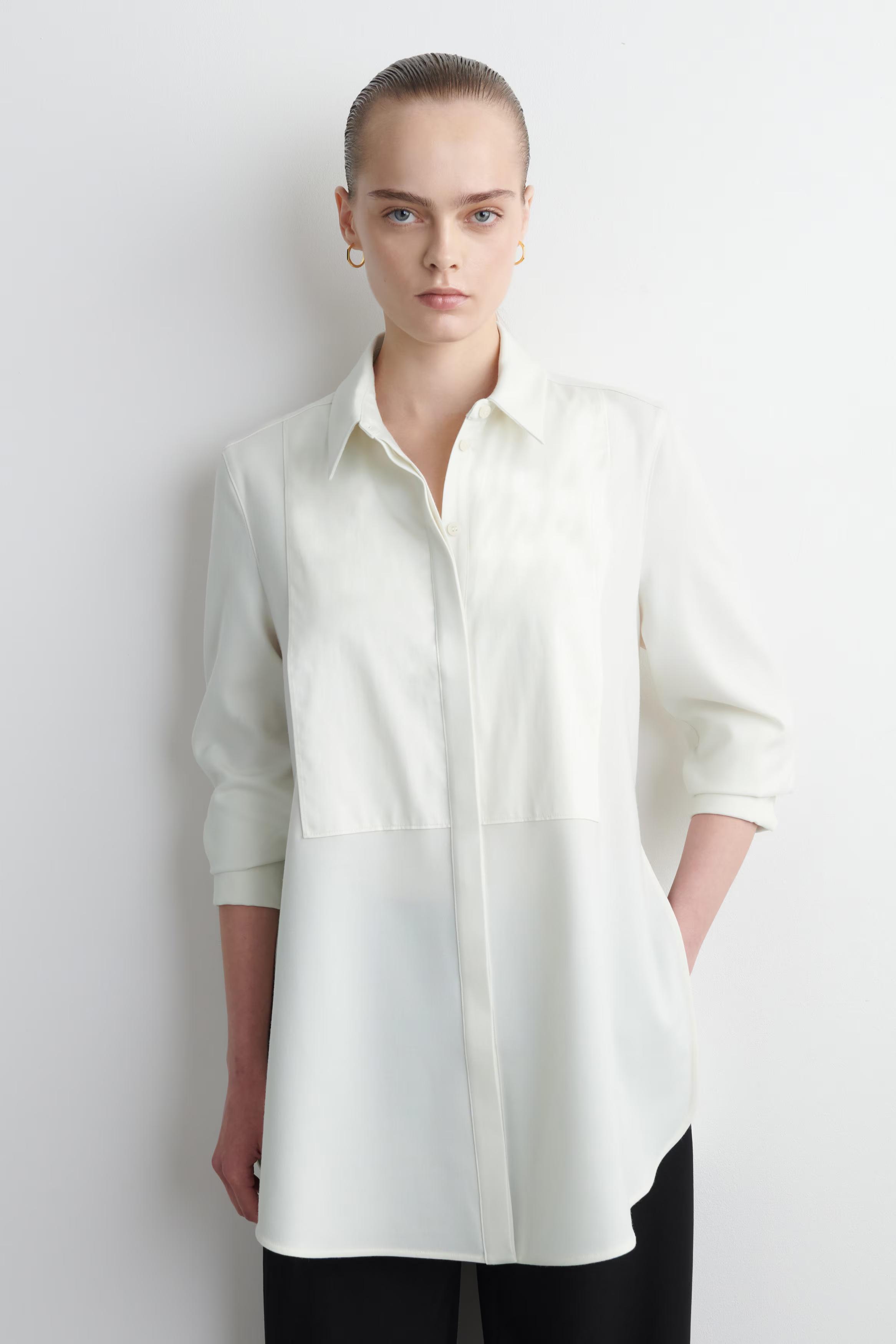 Sartorial codes are renewed with a modern appeal for Autumn Winter 2025. Crafted from a soft wool blend, this refined piece has an elongated, curved hem and a cotton bib-front detail that nods to the classic tuxedo shirt. Define the silhouette with the slender ties at the back.\u0026nbsp;\u0026nbsp;Regular fitButton closureRecycled polyester is polyester made from PET bottles or end-of-life textile waste. The PET bottles or textile waste is mechanically recycled and processed into new yarn\u0026nbsp;Shell: 51% Recycled polyester, 47% RWS wool, 2% Elastane. Front part and lining: 100% Cotton. Excluding trims / Machine wash\u0026nbsp;Back length of size EU 36 is 81.7cm / Model wears a size EU 38