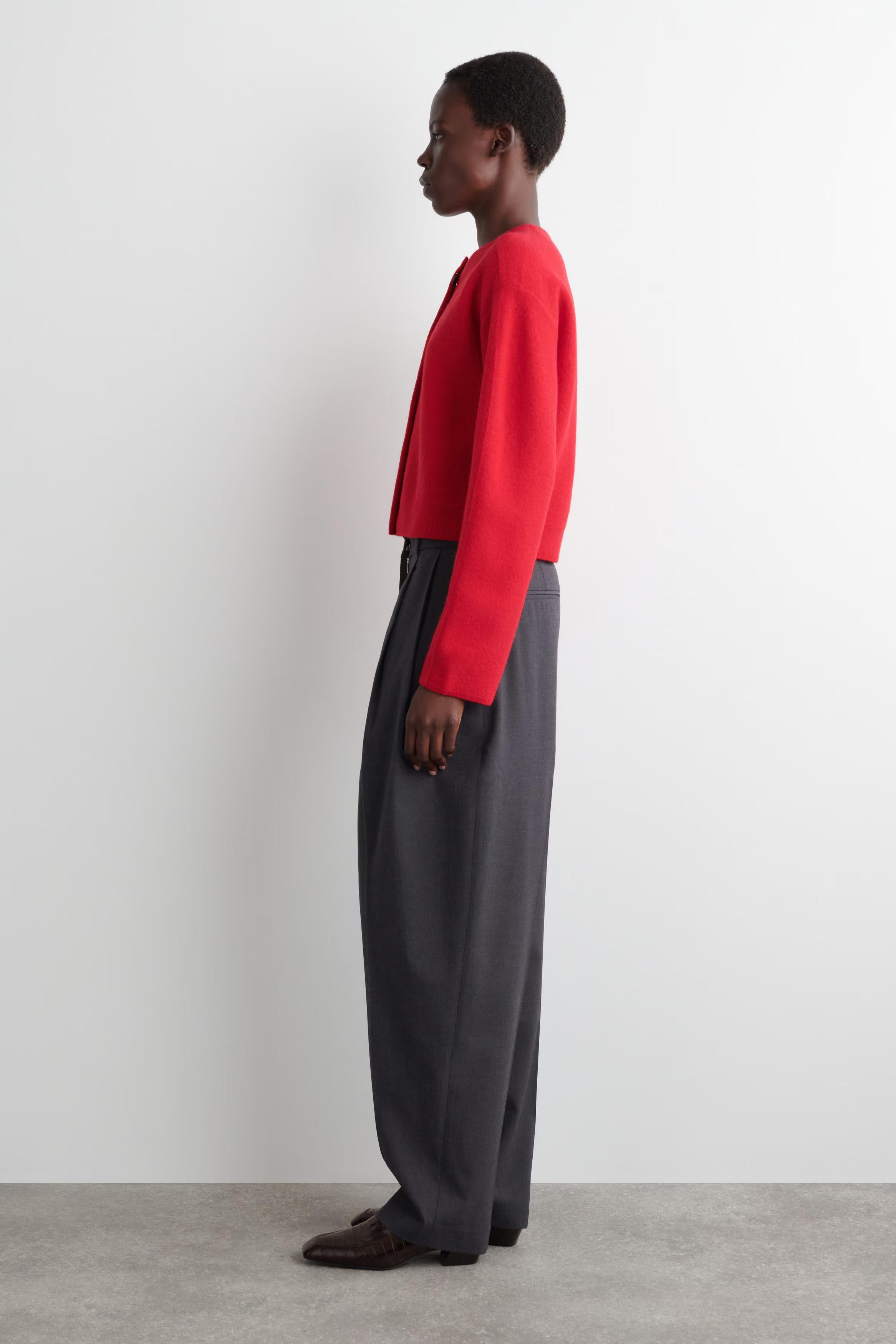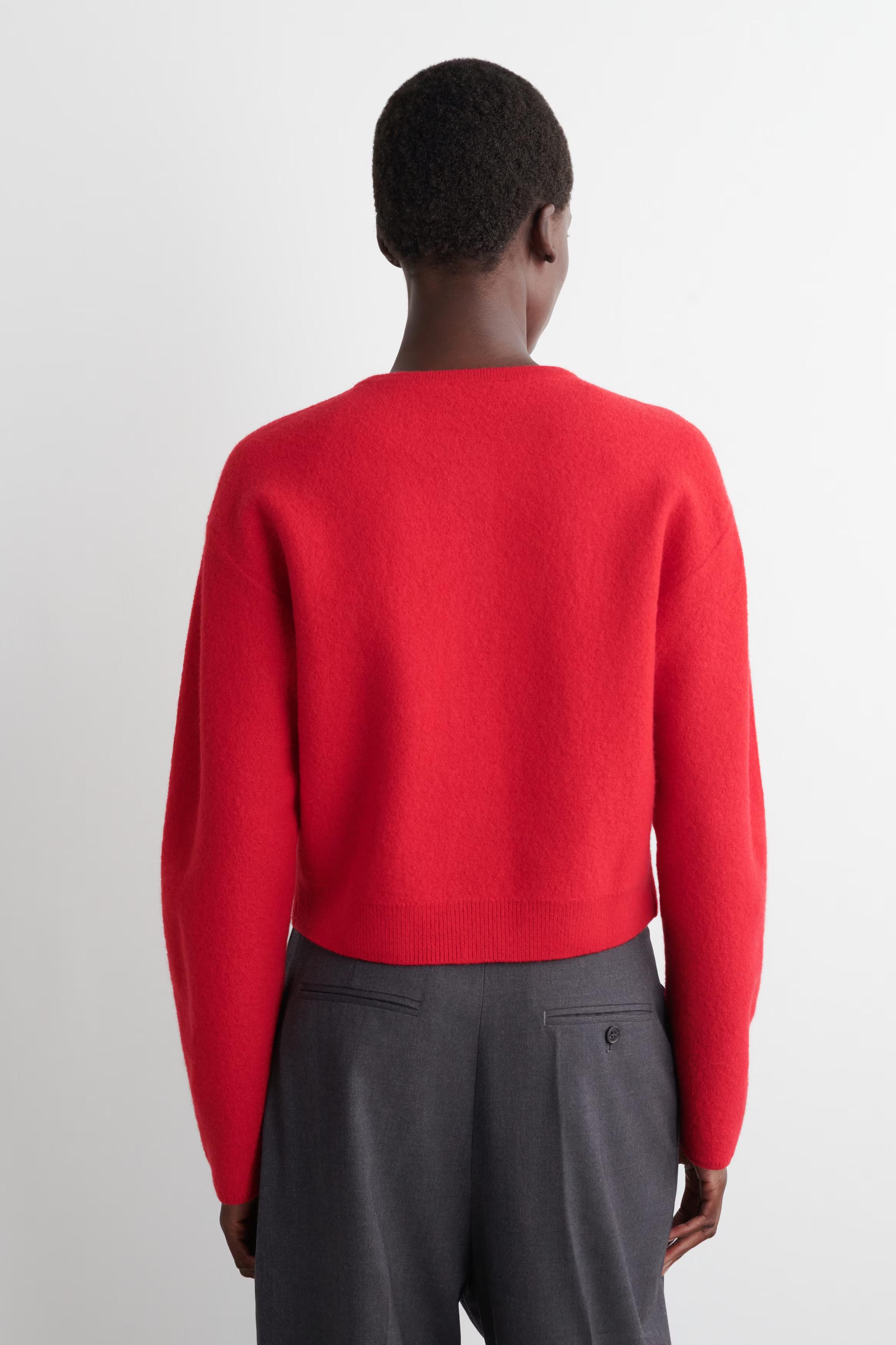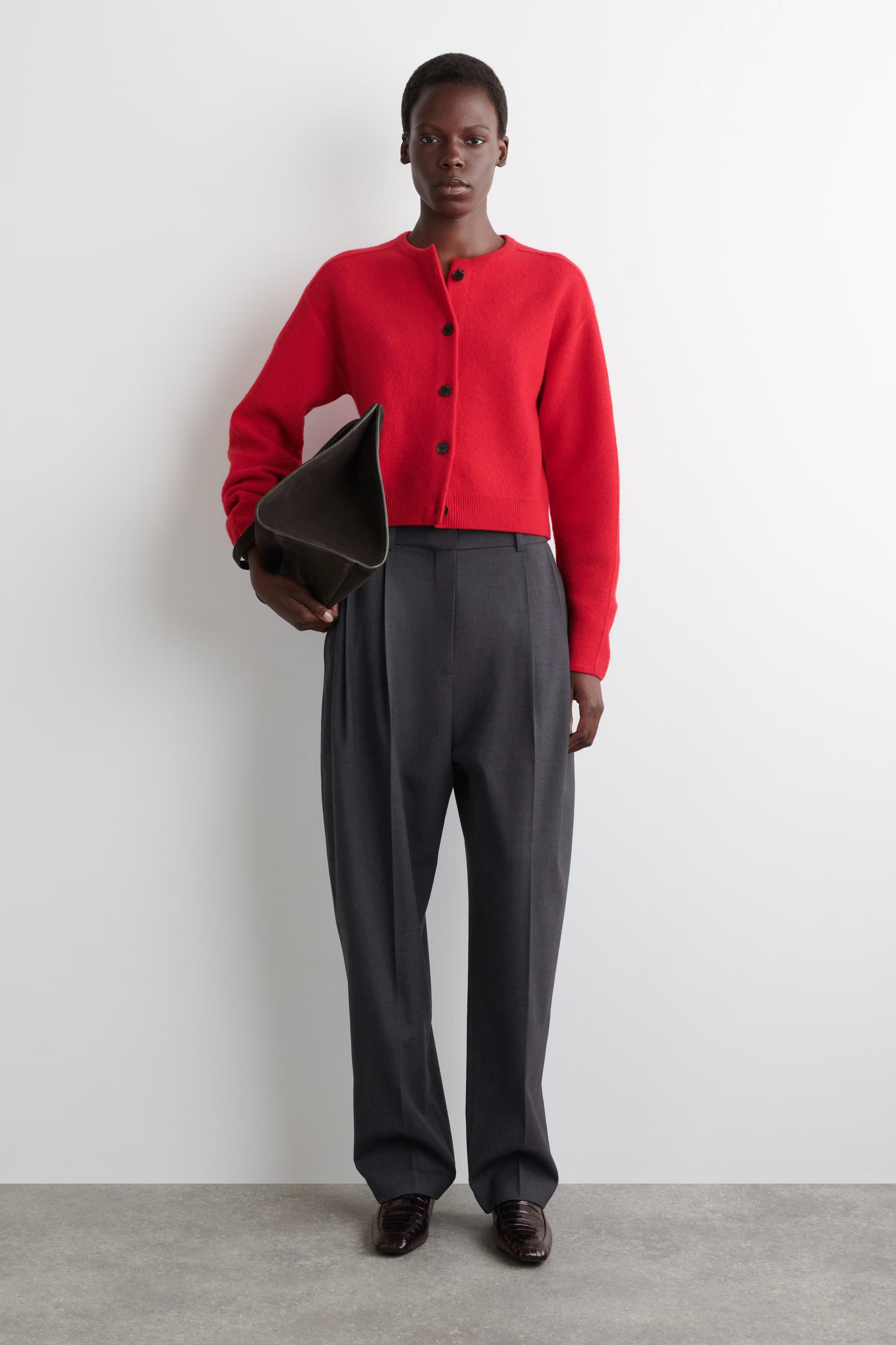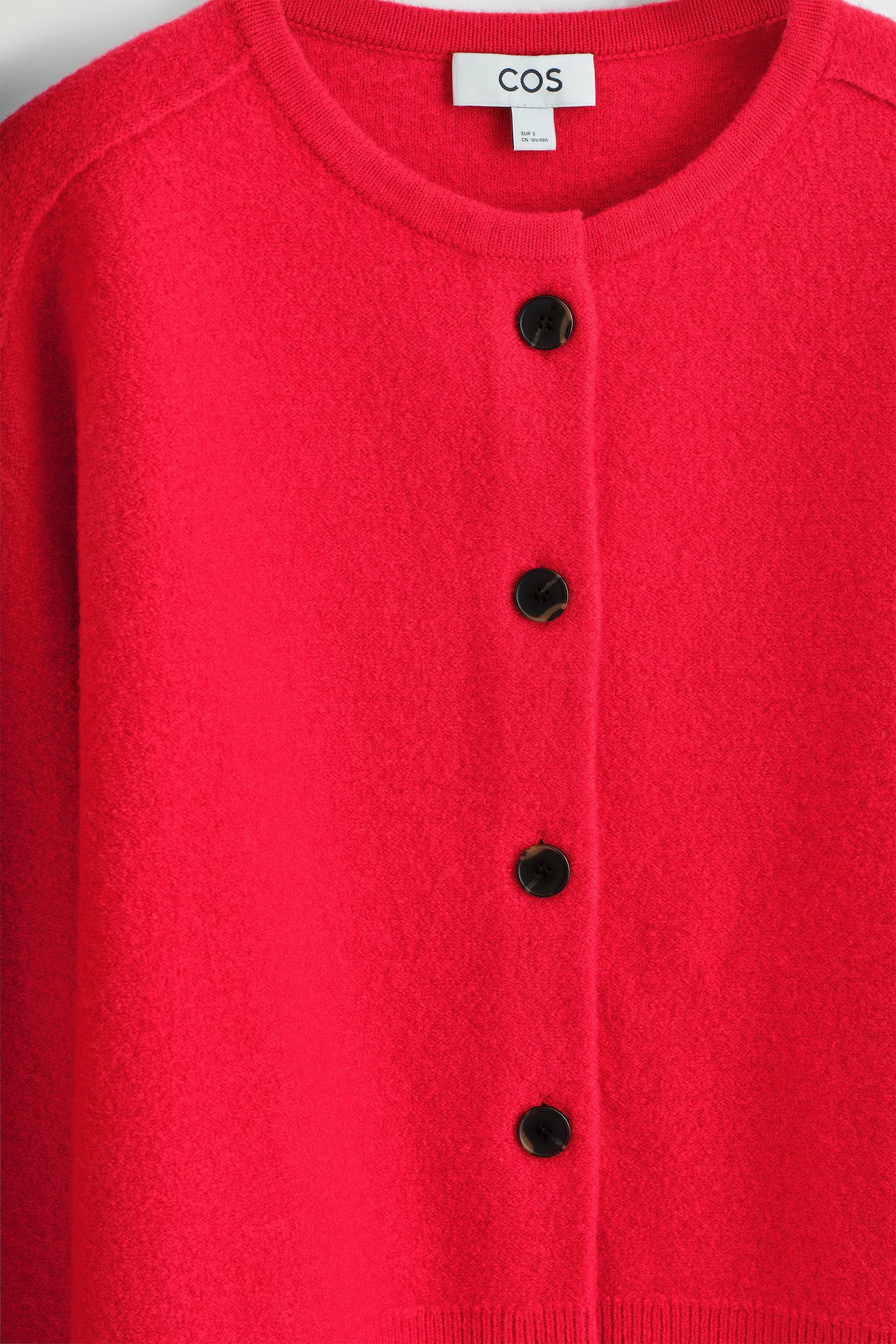 Refined silhouettes and luxuriously tactile yarns define the COS knitwear collection. Rendered in classic black, this crew-neck cardigan is made from premium merino wool that's boiled for texture and designed in a rounded shape with overlapping seams at the shoulders.\u0026nbsp;Regular fitButton closureThis product contains Responsible Wool Standard TE-00047206 (RWS) wool fibre from farms certified to animal welfare and land-management requirements\u0026nbsp;Shell: 100% Merino wool. Excluding trims / Dry clean\u0026nbsp;Back length of size S is 50cm / Model wears a size S