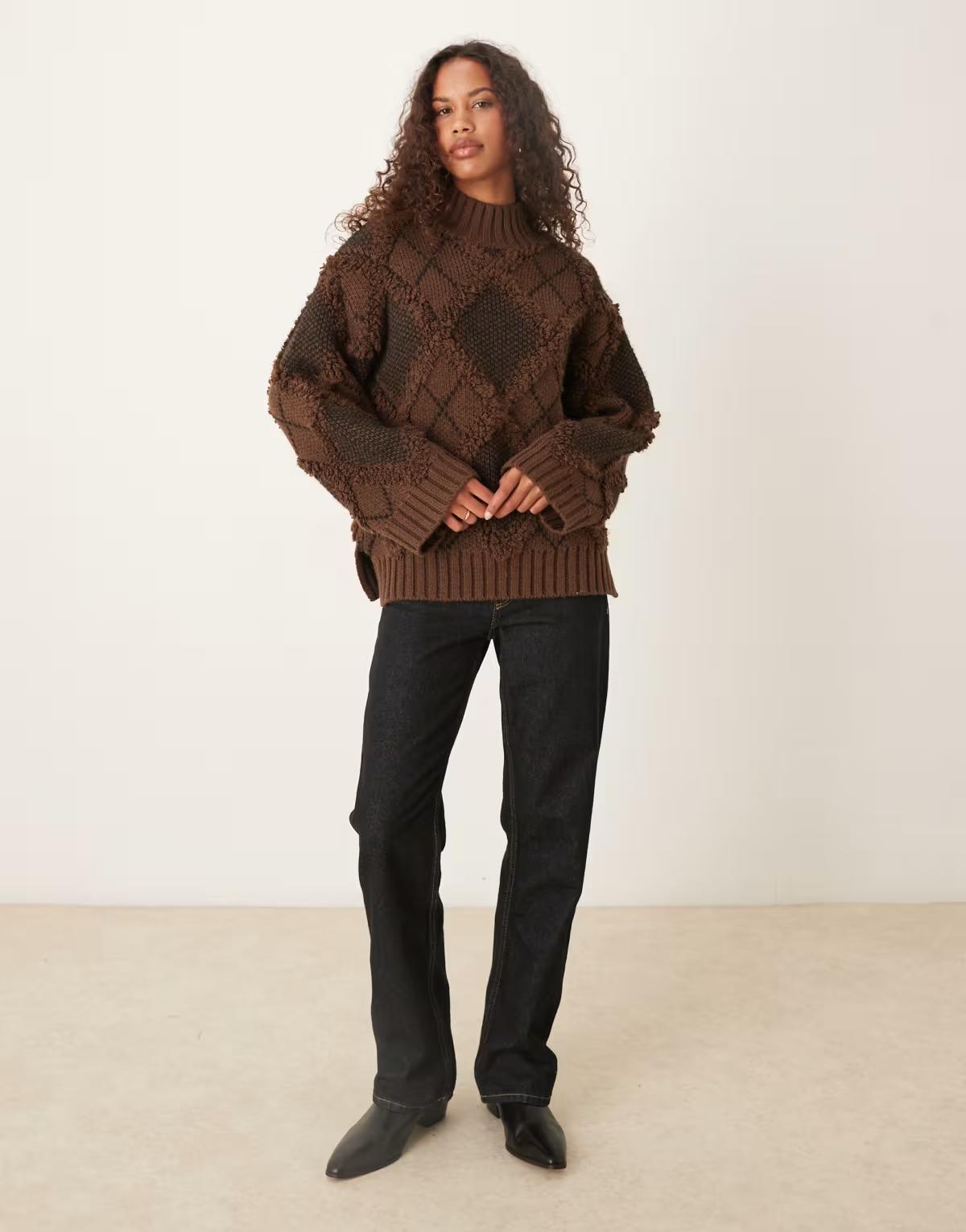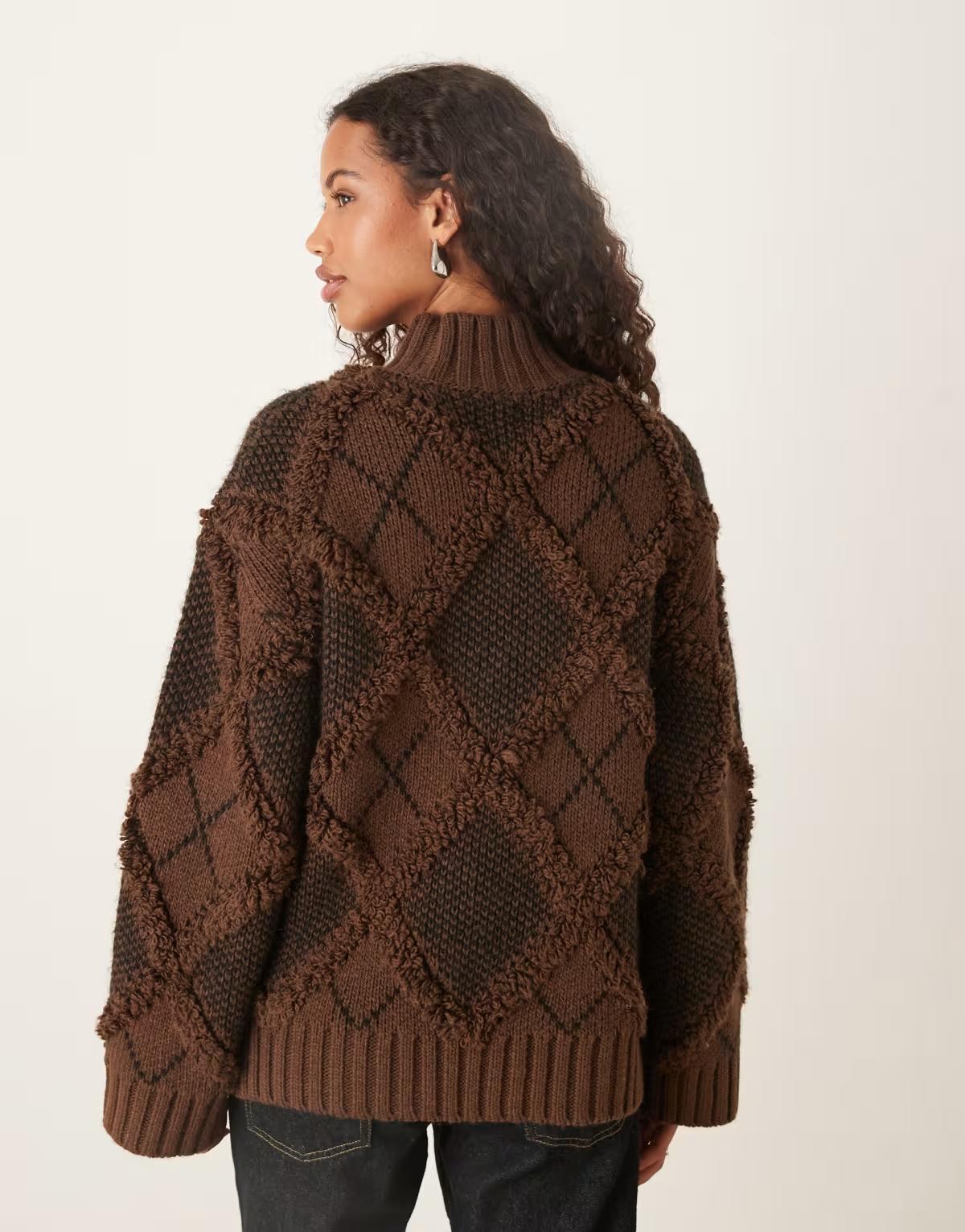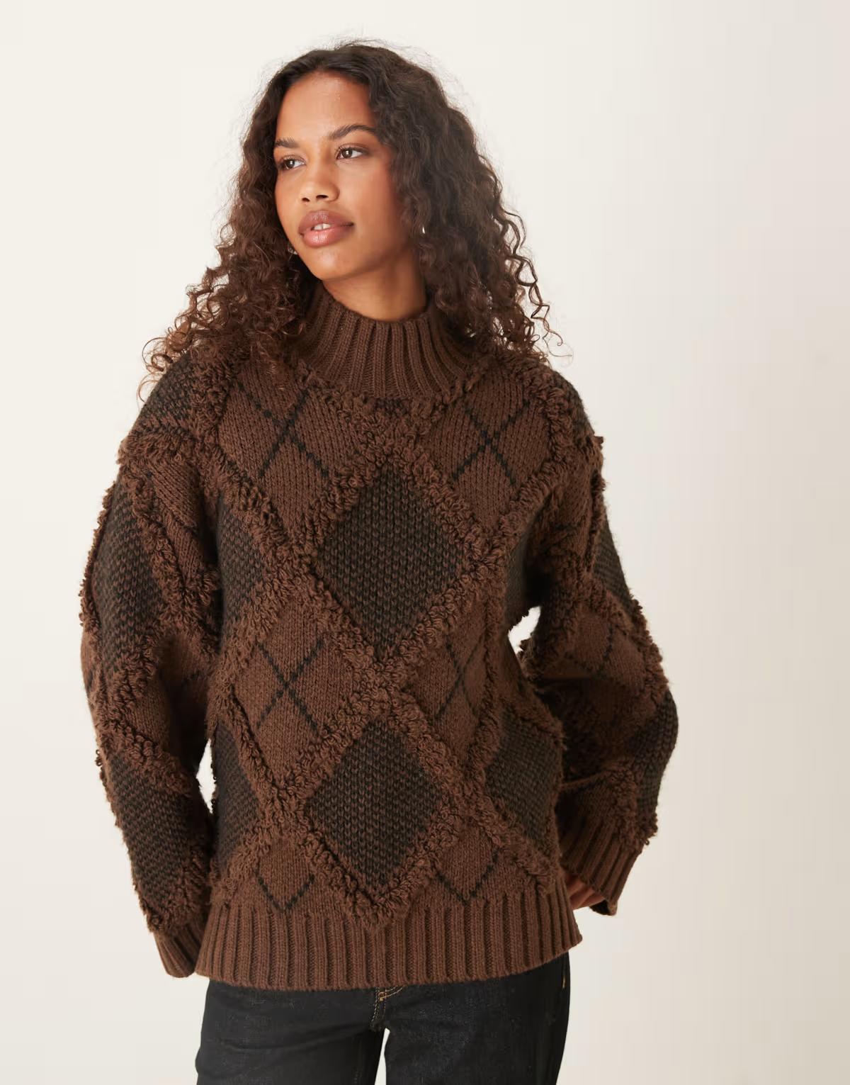 ASOS DESIGN fringed check oversized jumper in chocolate