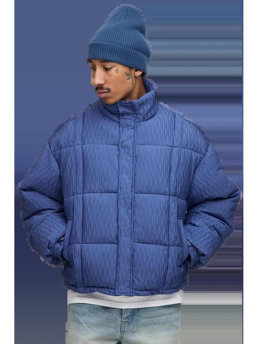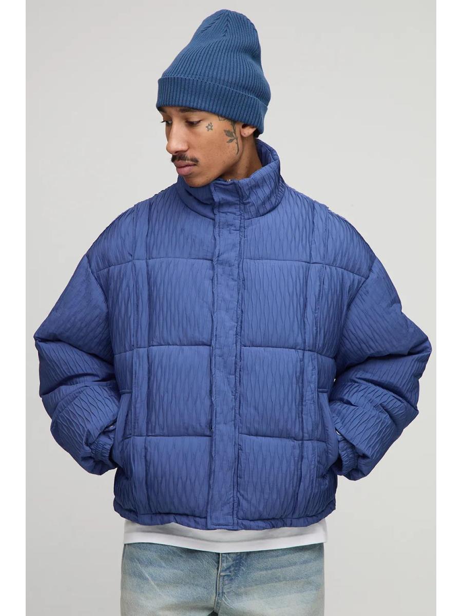 Boxy Fit Textured Pintuck Funnel Neck Puffer Jacket
