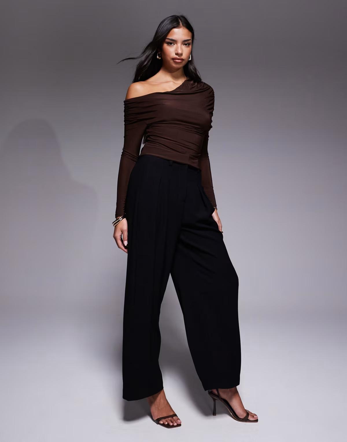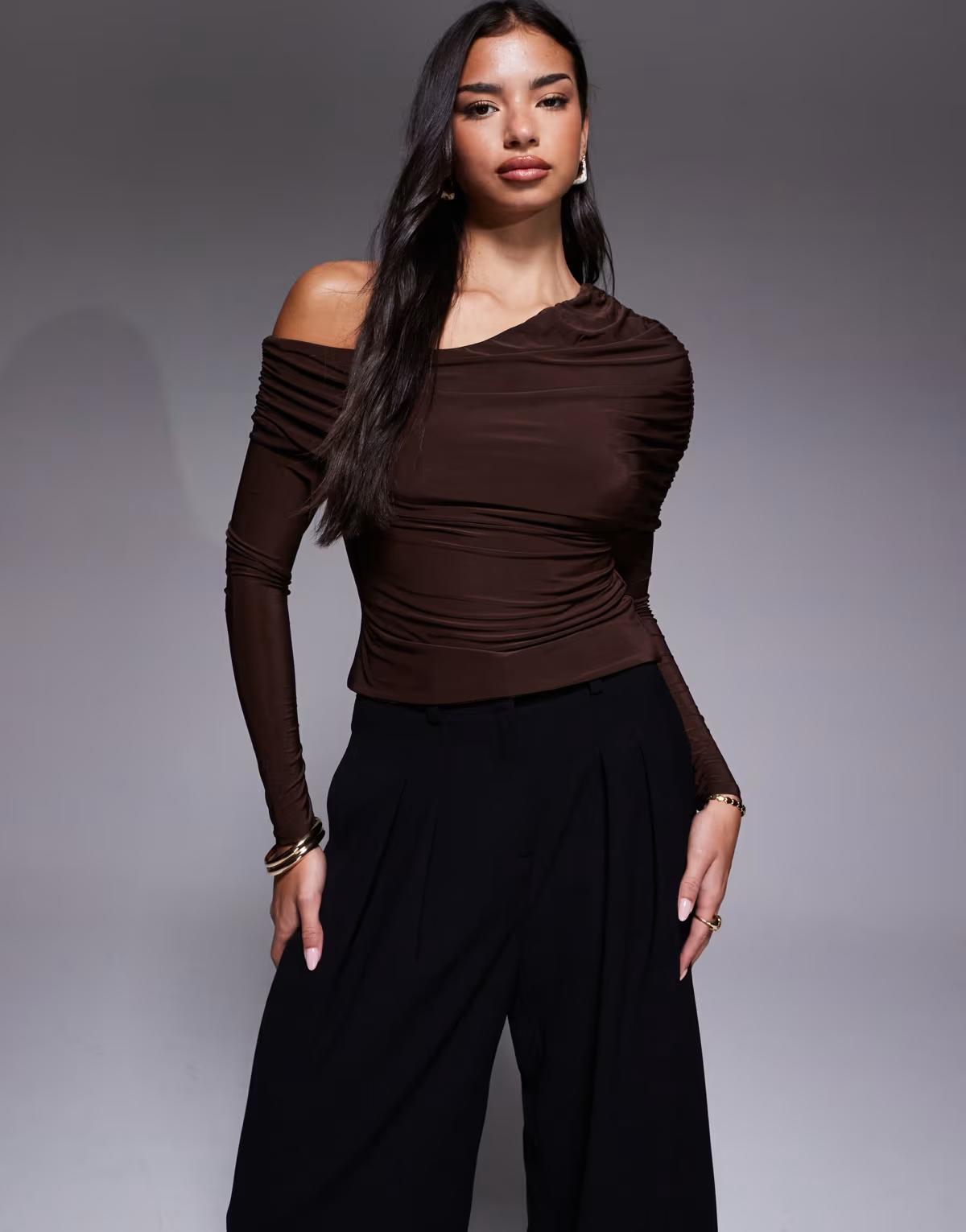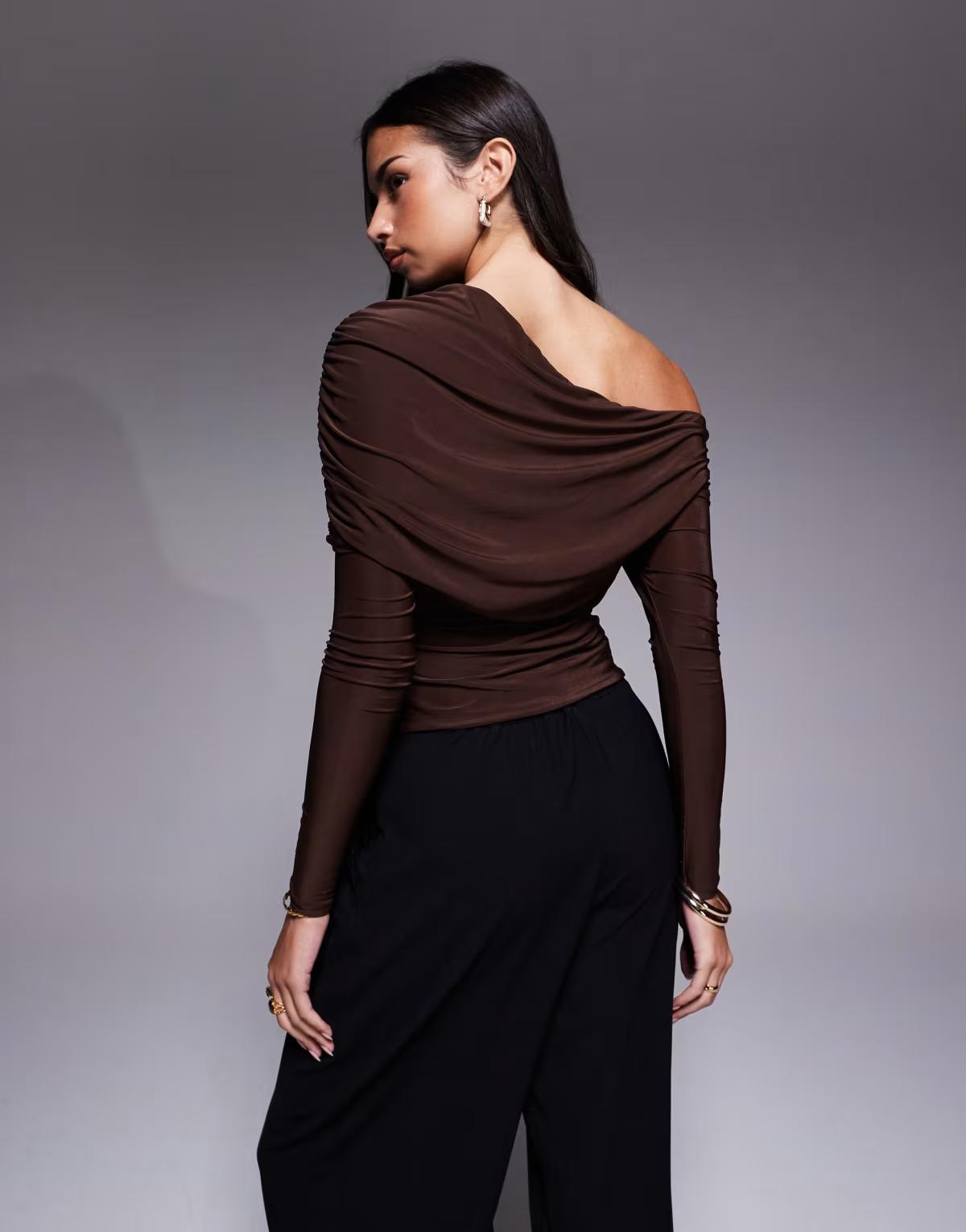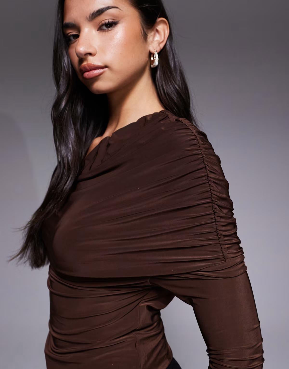 ASOS DESIGN slinky asymmetric cape shoulder long sleeve top in chocolate