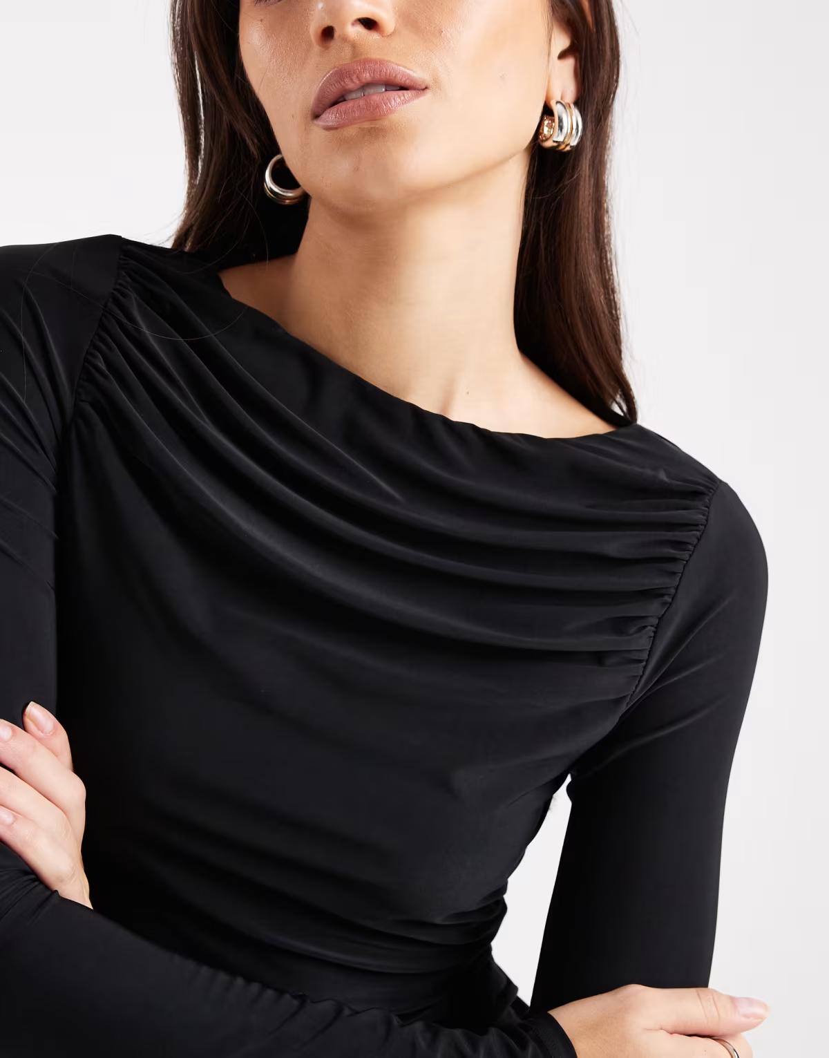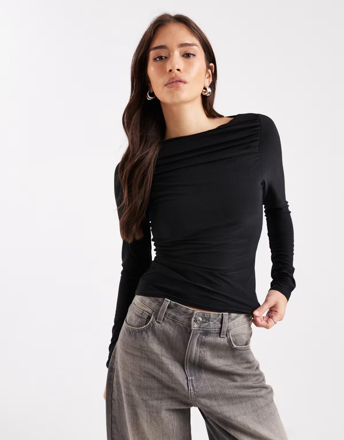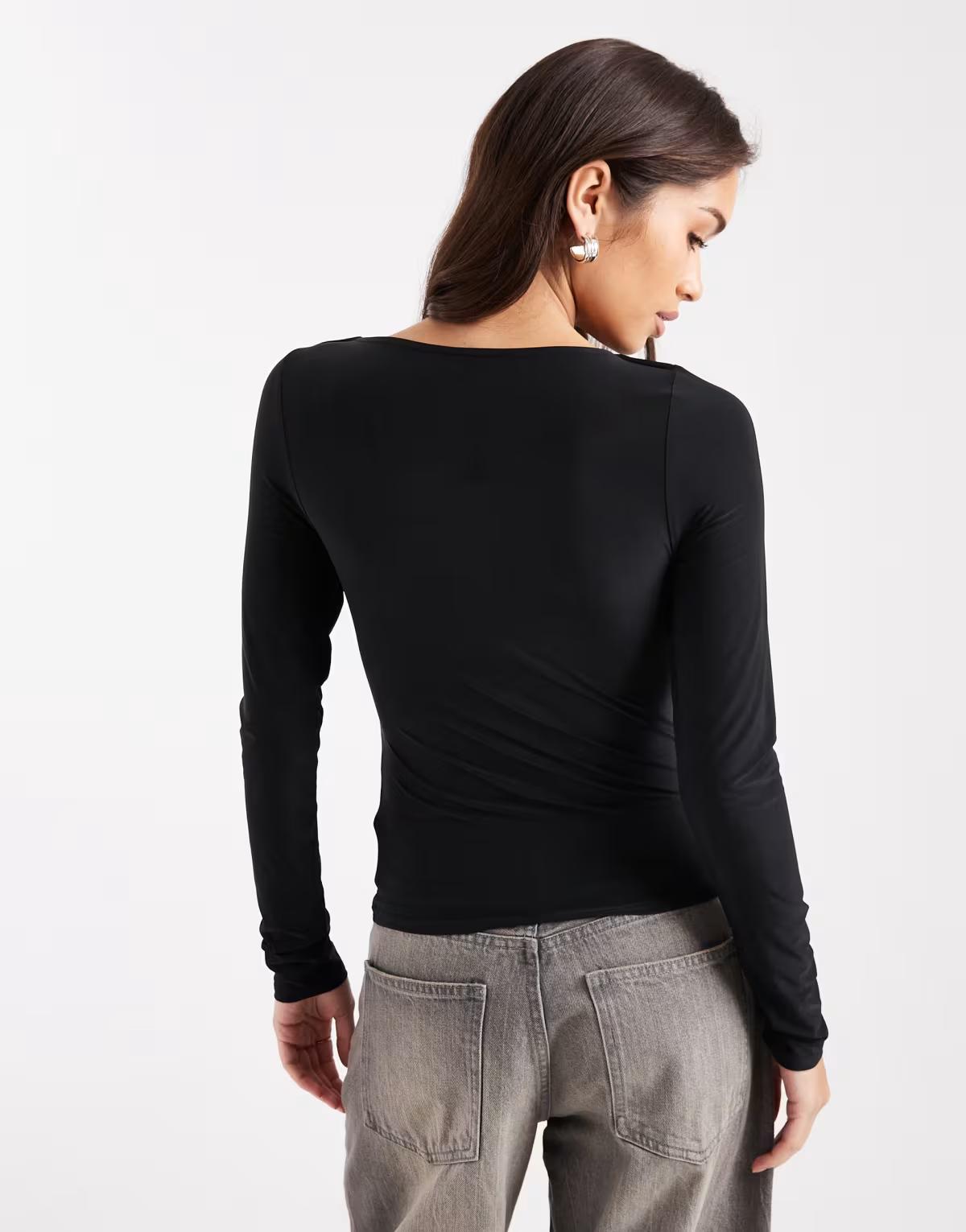 ASOS DESIGN long sleeve ruched slinky top with scoop back in black