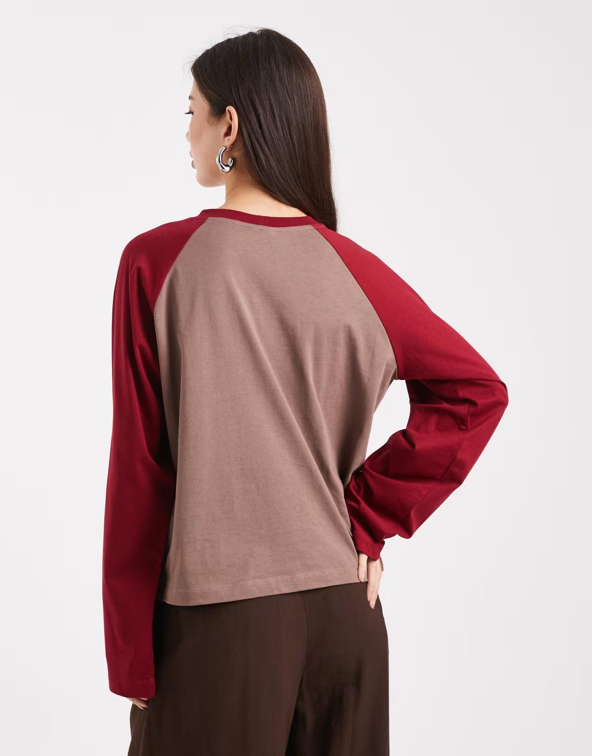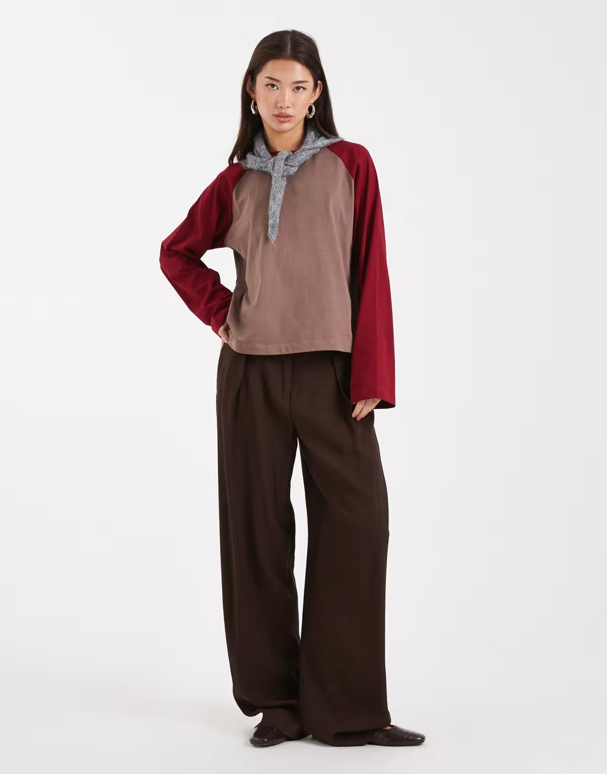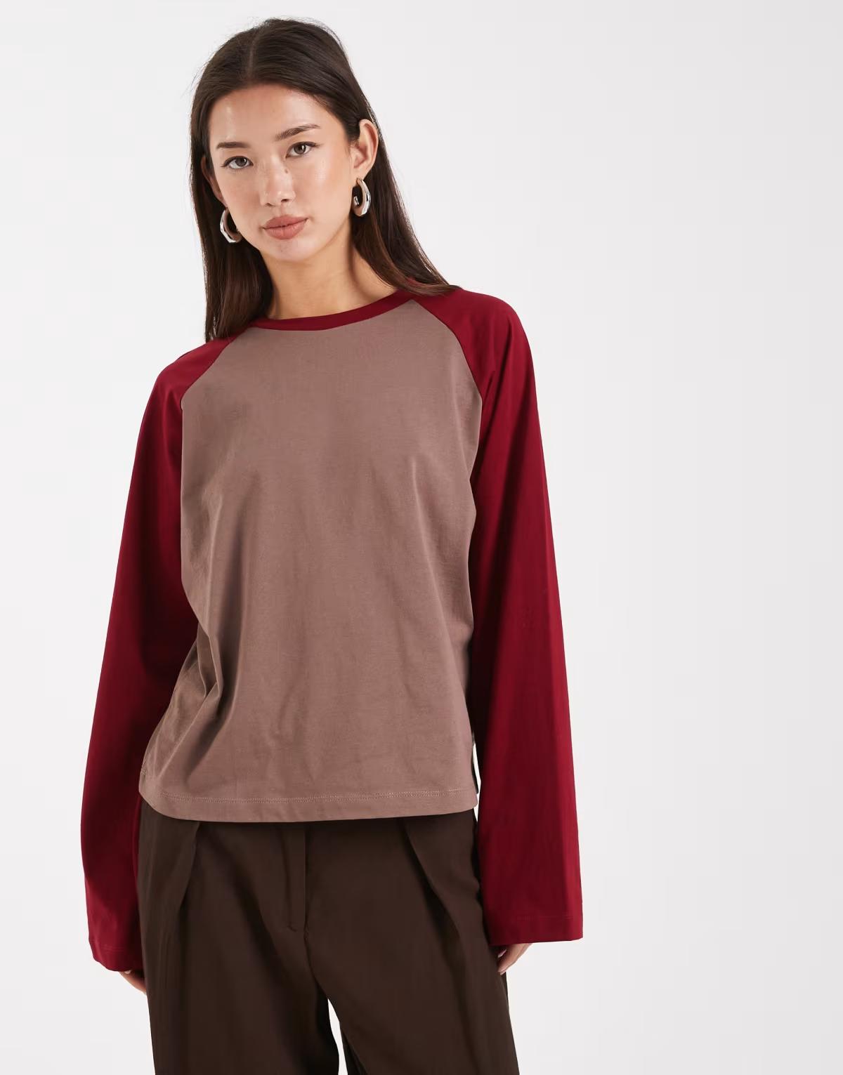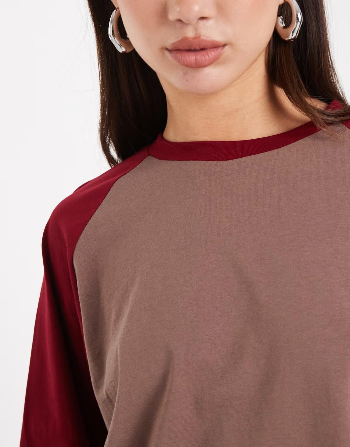 COLLUSION raglan long sleeve boxy t-shirt in chocolate and burgundy