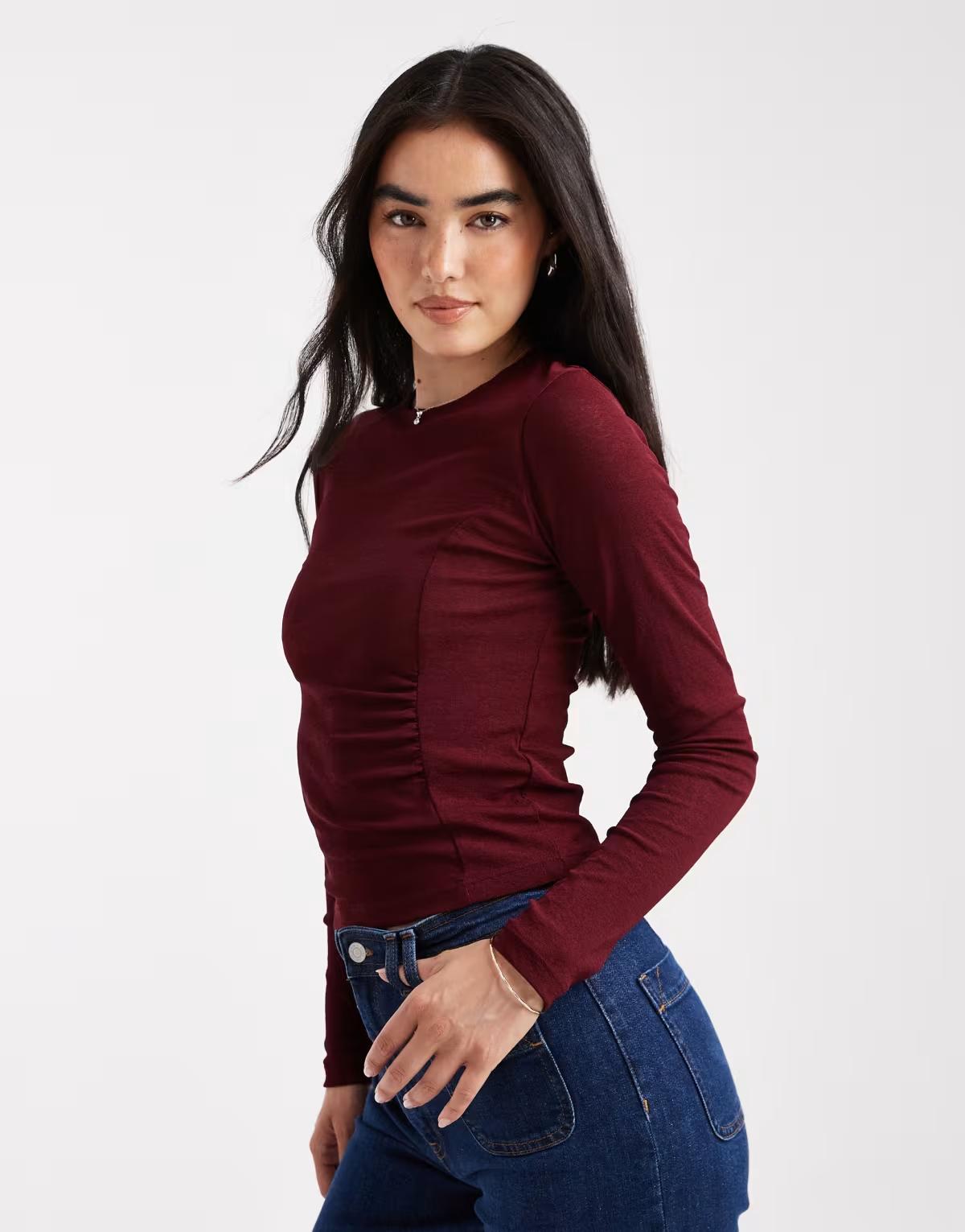 ASOS DESIGN textured mesh long sleeve top with side ruching detail in dark berry