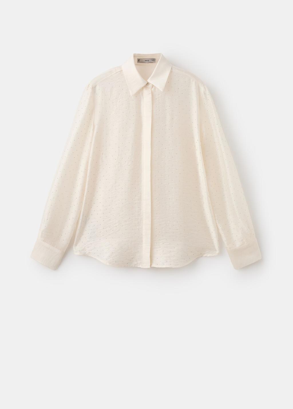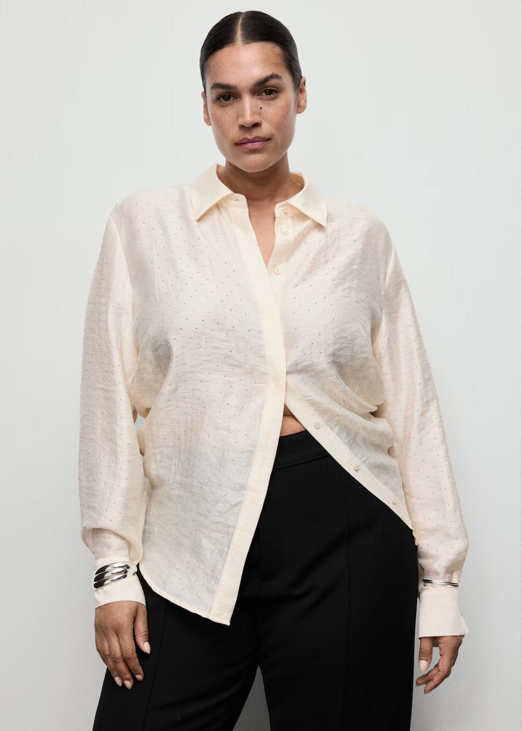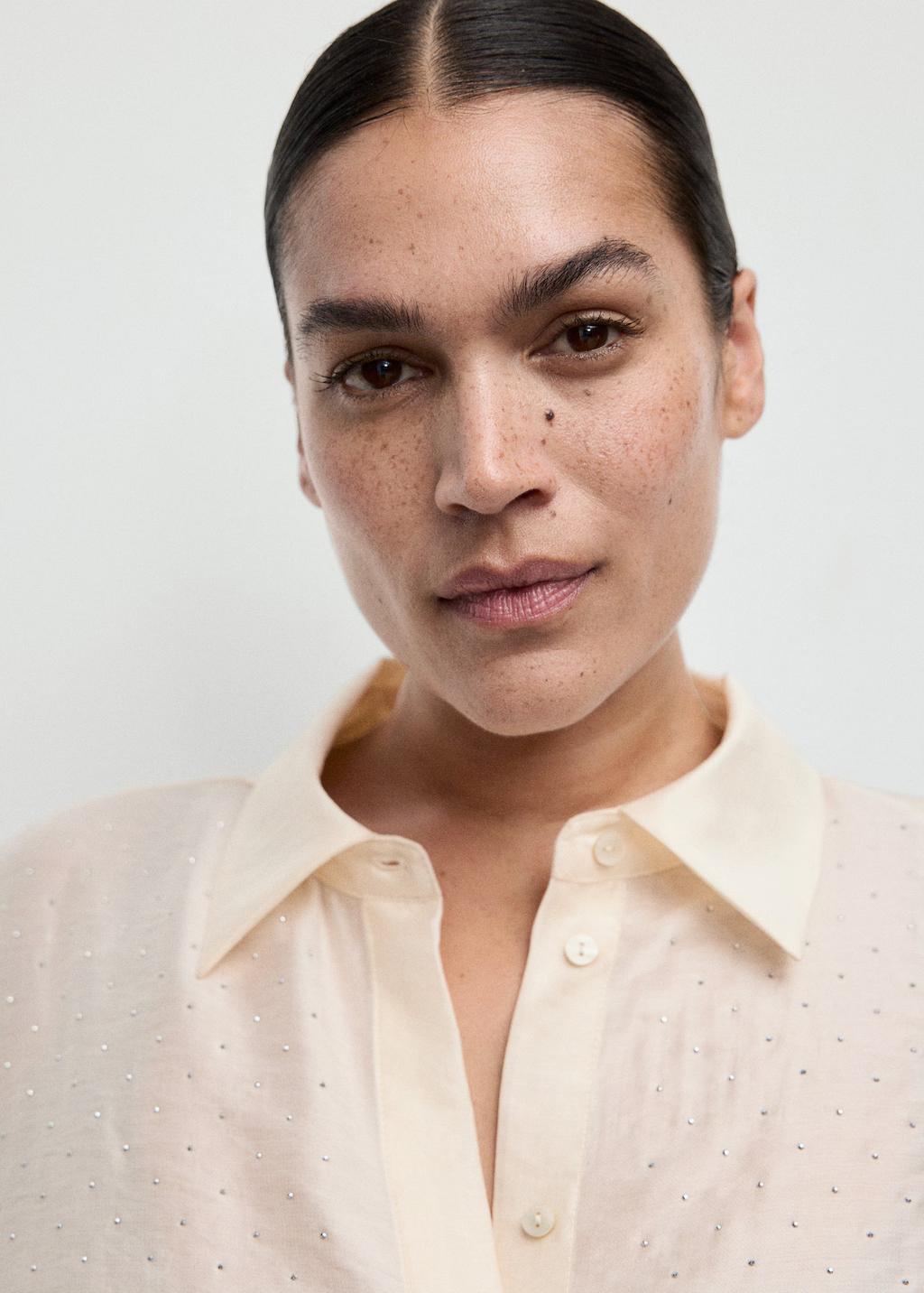 Confeccionada en tejido satinado, esta prenda presenta un diseño recto con detalles de strass. Incluye cuello camisero y manga larga con puños abotonados. El cierre delantero de botones oculto completa su estilo. Disponible en tallas Plus