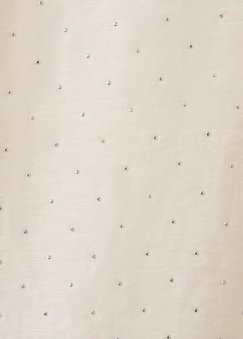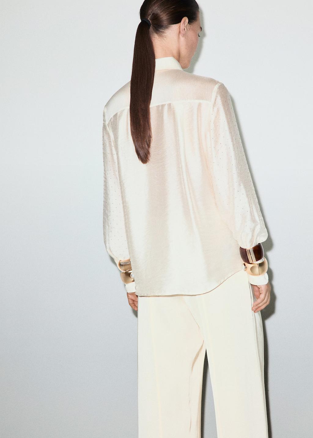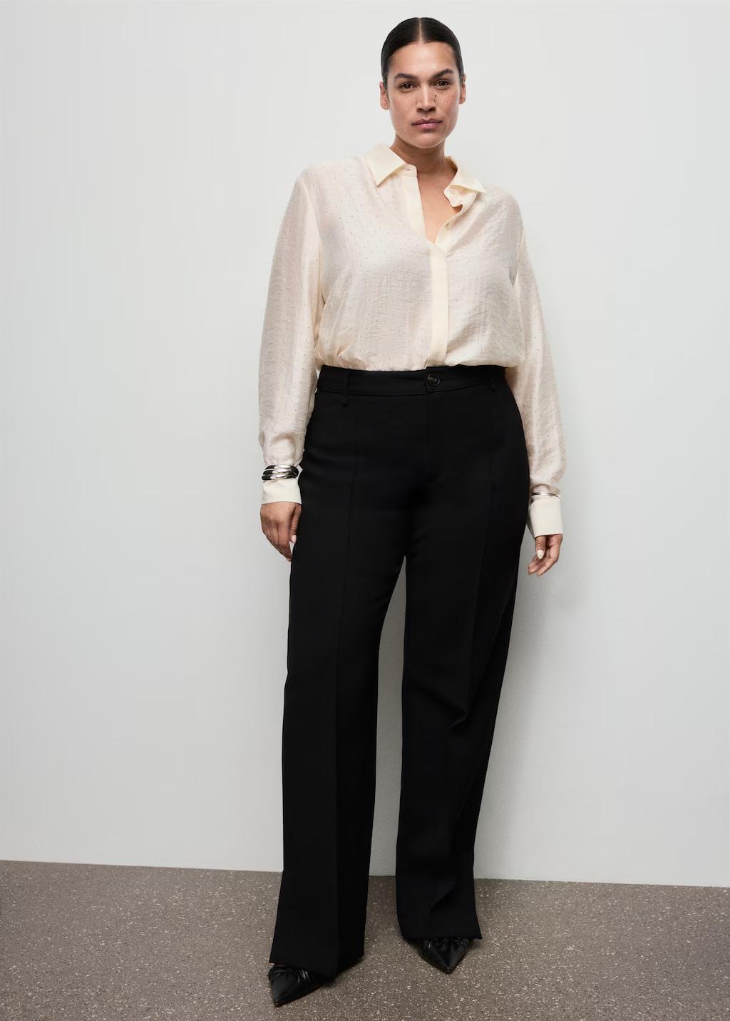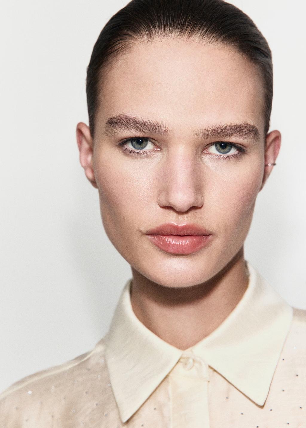 Confeccionada en tejido satinado, esta prenda presenta un diseño recto con detalles de strass. Incluye cuello camisero y manga larga con puños abotonados. El cierre delantero de botones oculto completa su estilo. Disponible en tallas Plus