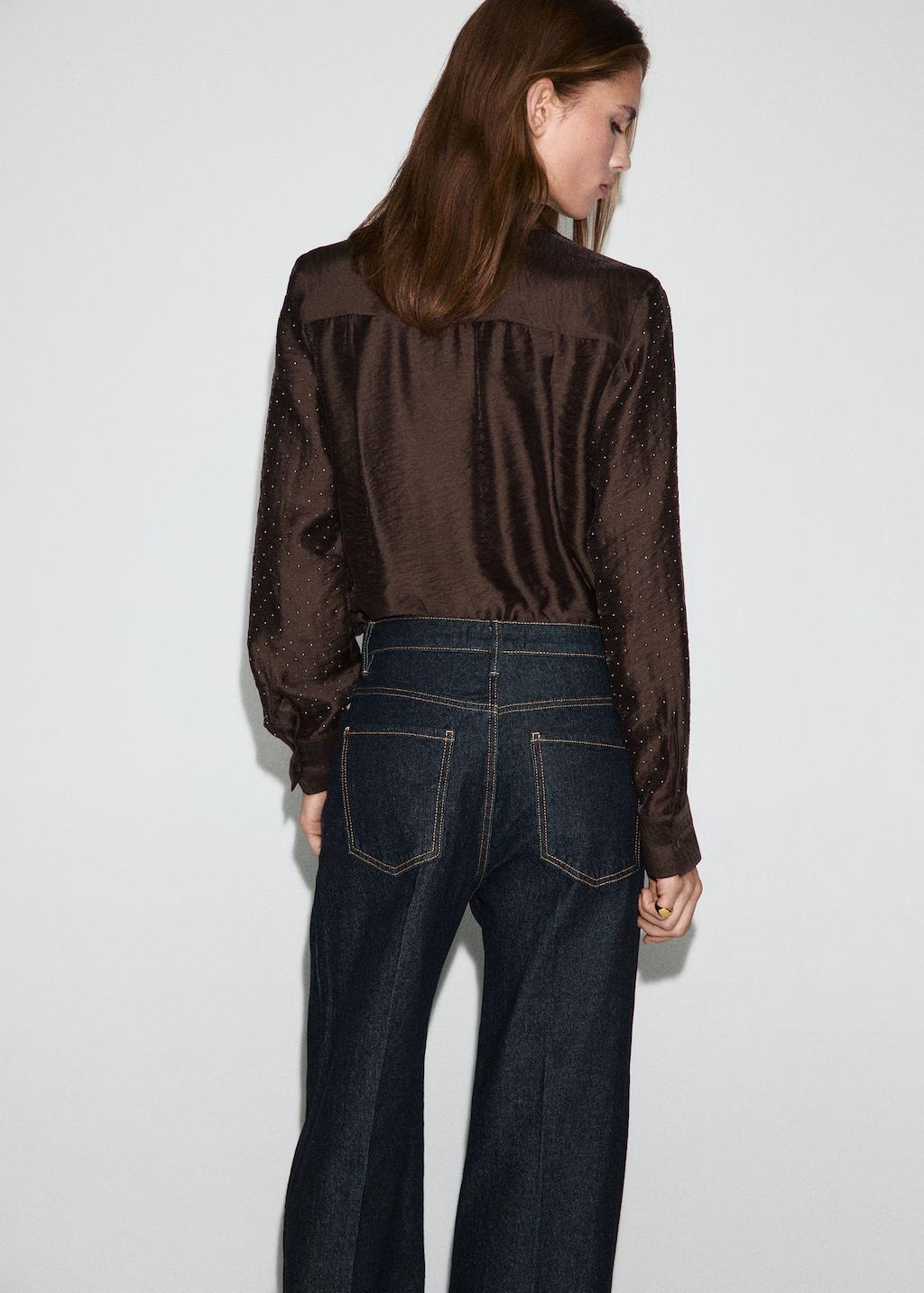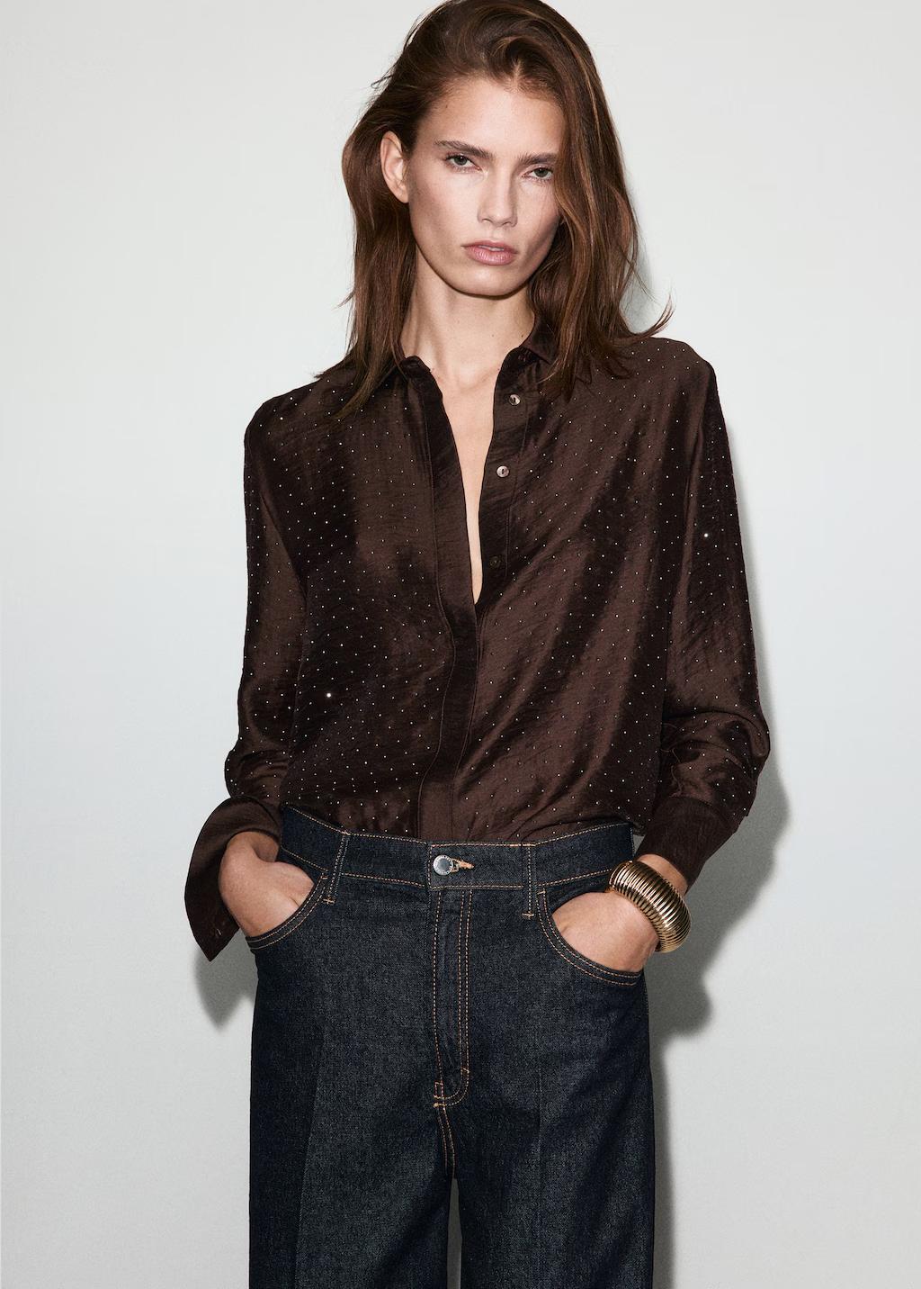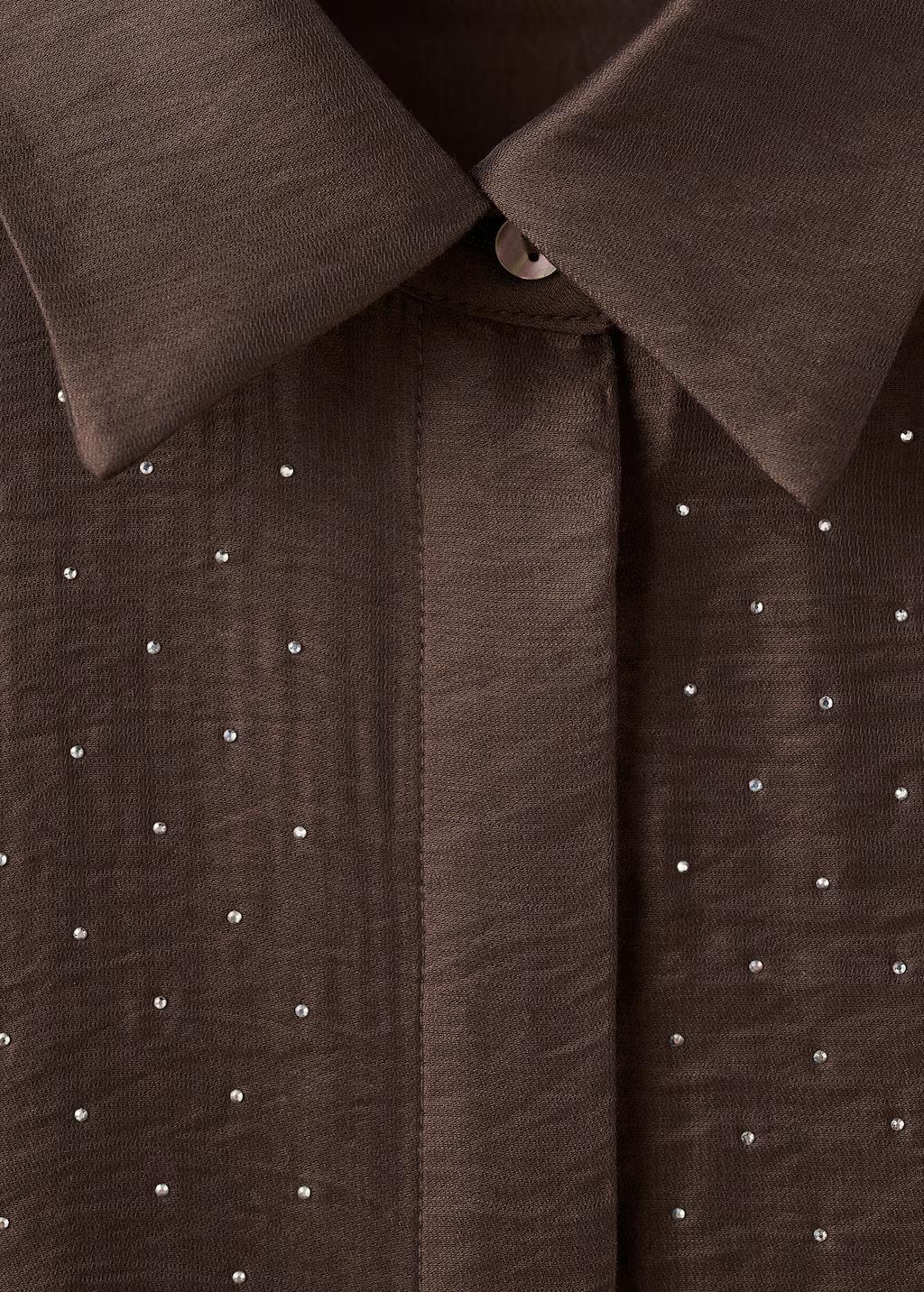 Confeccionada en tejido satinado, esta prenda presenta un diseño recto con detalles de strass. Incluye cuello camisero y manga larga con puños abotonados. El cierre delantero de botones oculto completa su estilo. Disponible en tallas Plus