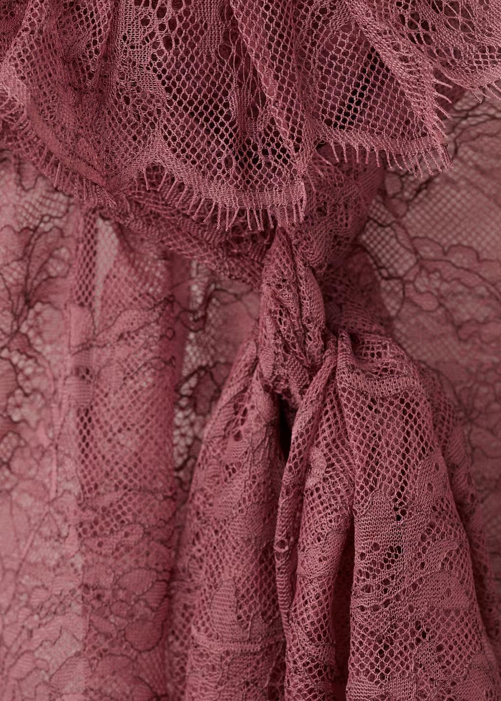 Confeccionada en tejido de encaje, esta prenda presenta un diseño recto con cuello gorguera y manga larga con volante en los puños. Incluye un lazo en el cuello y cierre de cremallera posterior. Lleva forro interior