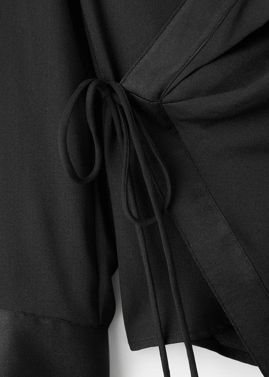 Confeccionada en tejido satinado, esta prenda presenta un diseño recto con cuello camisero cruzado. Las mangas largas tienen puños abotonados y el cierre es mediante lazo. Disponible en talla Plus