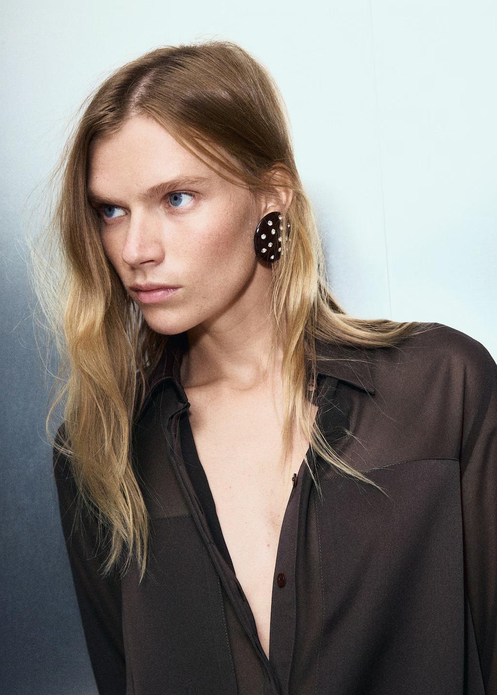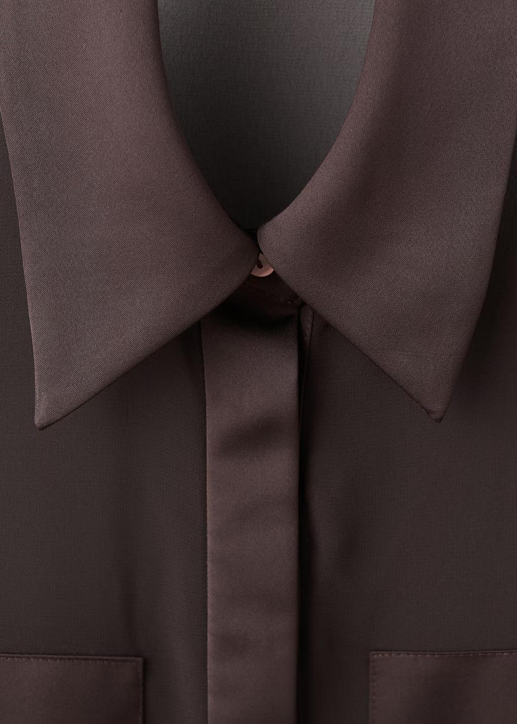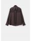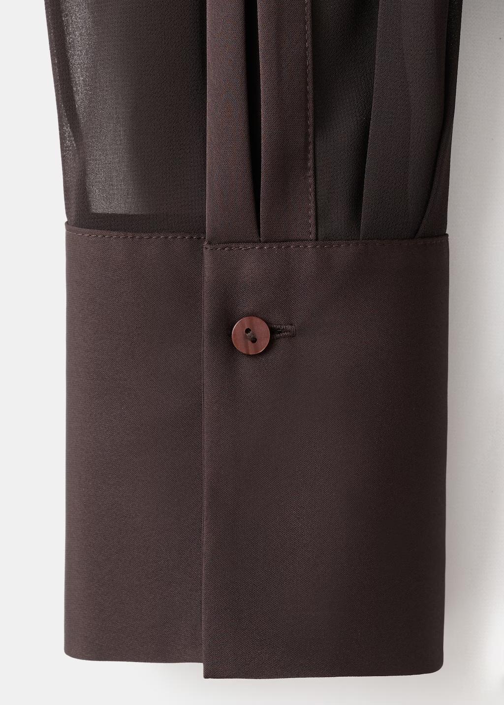 Confeccionada en tejido semitransparente, esta prenda presenta un diseño recto con cuello camisero y manga larga con puños abotonados. Los parches decorativos añaden un toque distintivo. El cierre es mediante botones delanteros ocultos