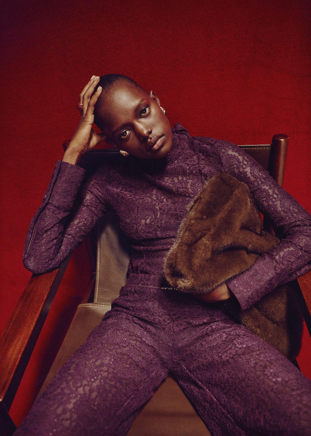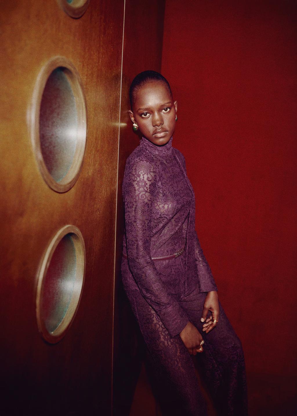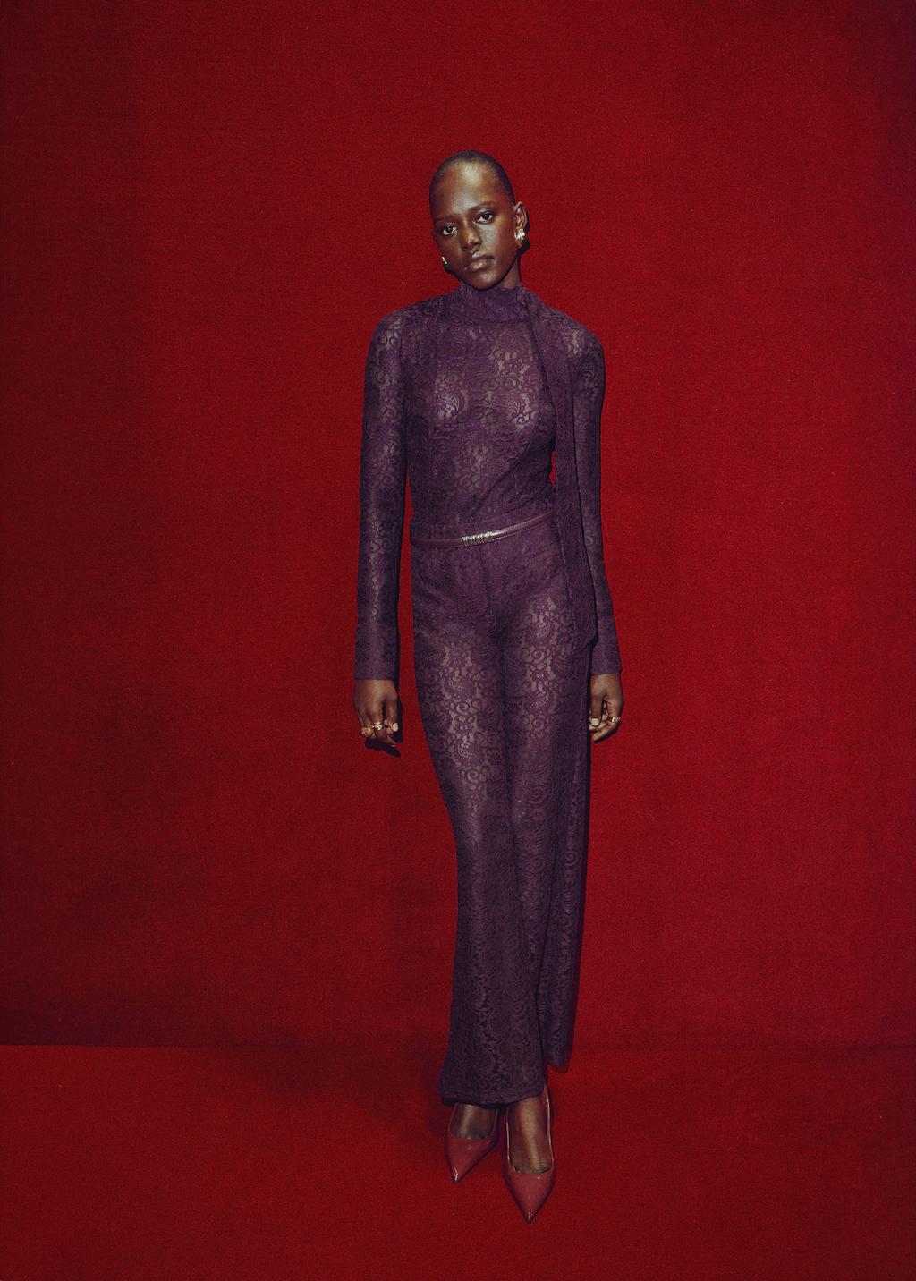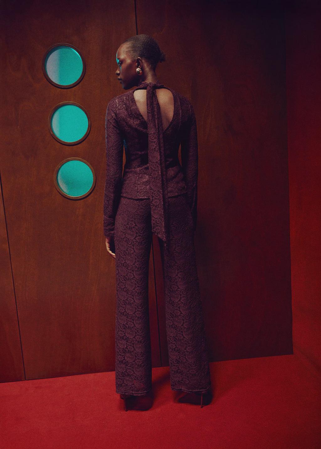 Confeccionada en tejido de encaje, esta prenda presenta un diseño recto con cuello alto adornado con un fular. Las mangas largas tienen puños abotonados y la espalda cuenta con un escote elegante. Cuenta con un pantalón a conjunto