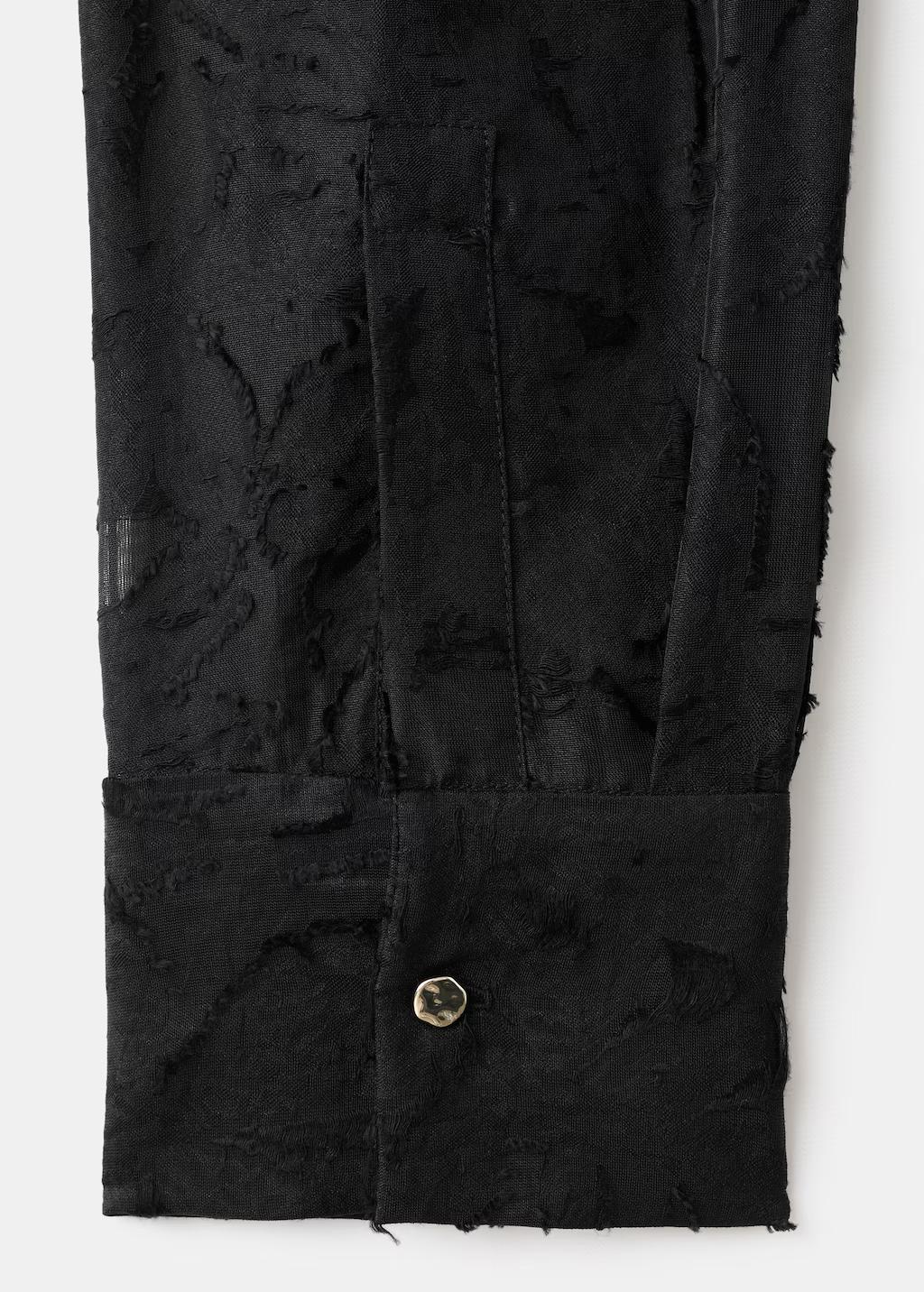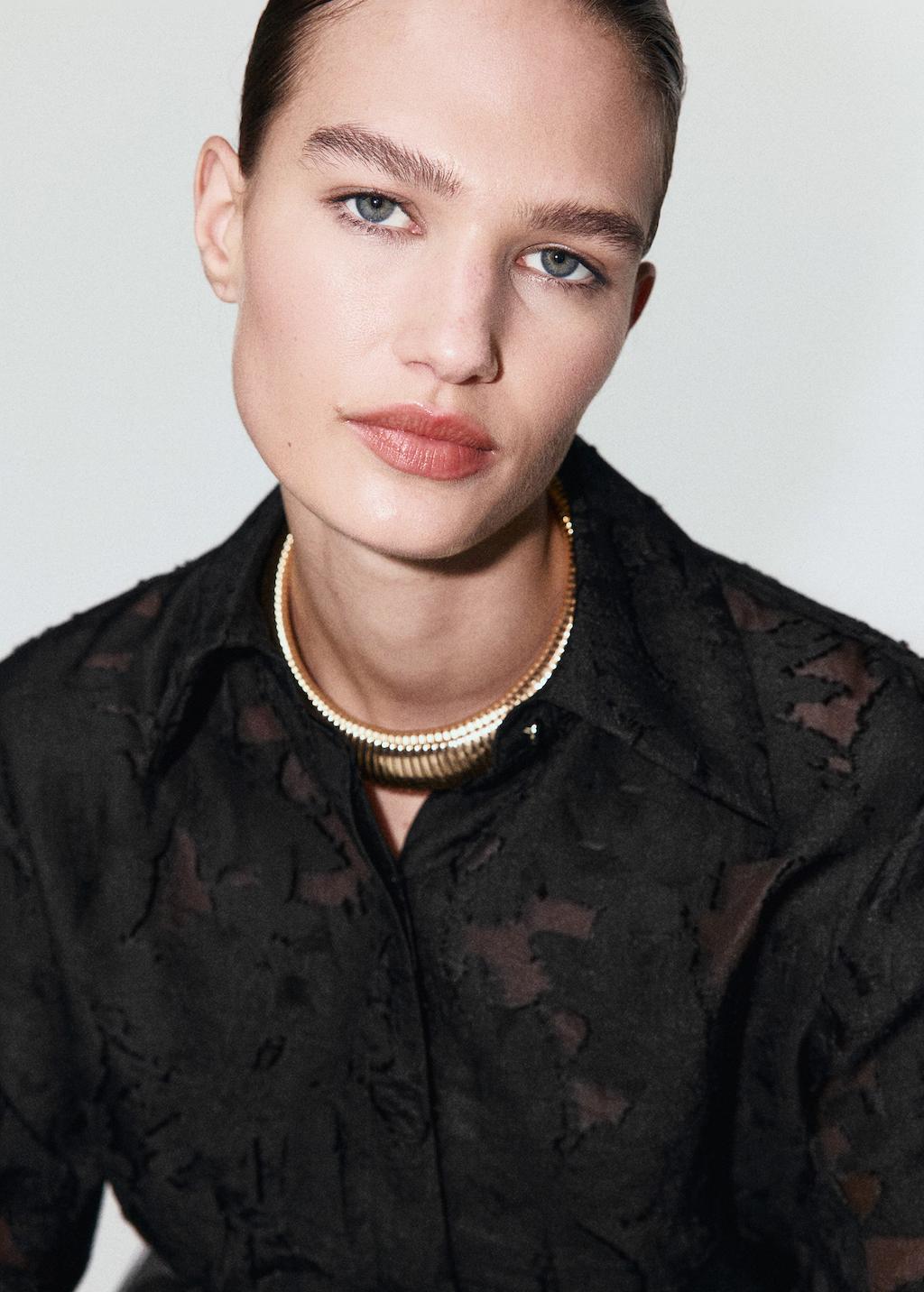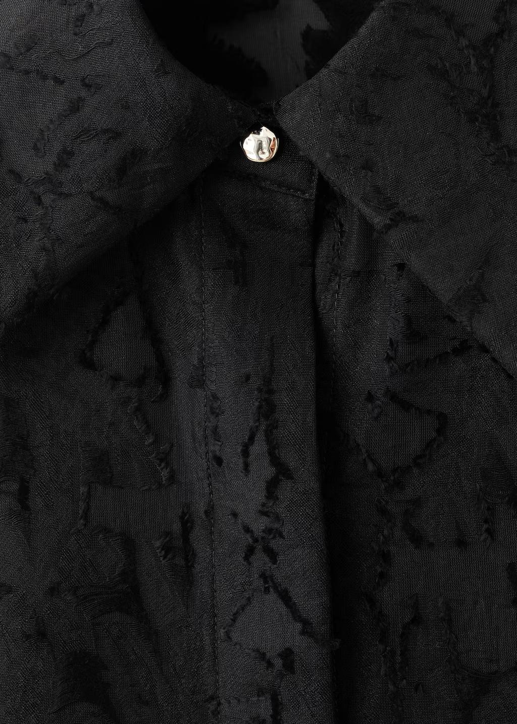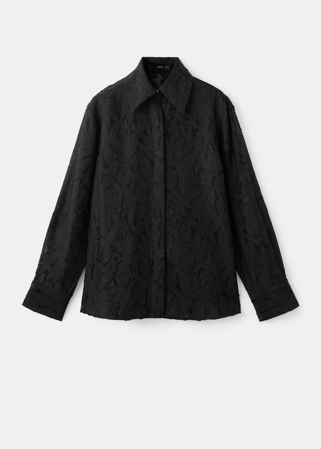 Tejido con textura. Diseño oversize. Cuello camisero. Manga larga con puños abotonados. Cierre delantero de botones oculto. Esta prenda pertenece a nuestra colección de fiesta y evento, diseñada para elevar tus looks en ocasiones especiales