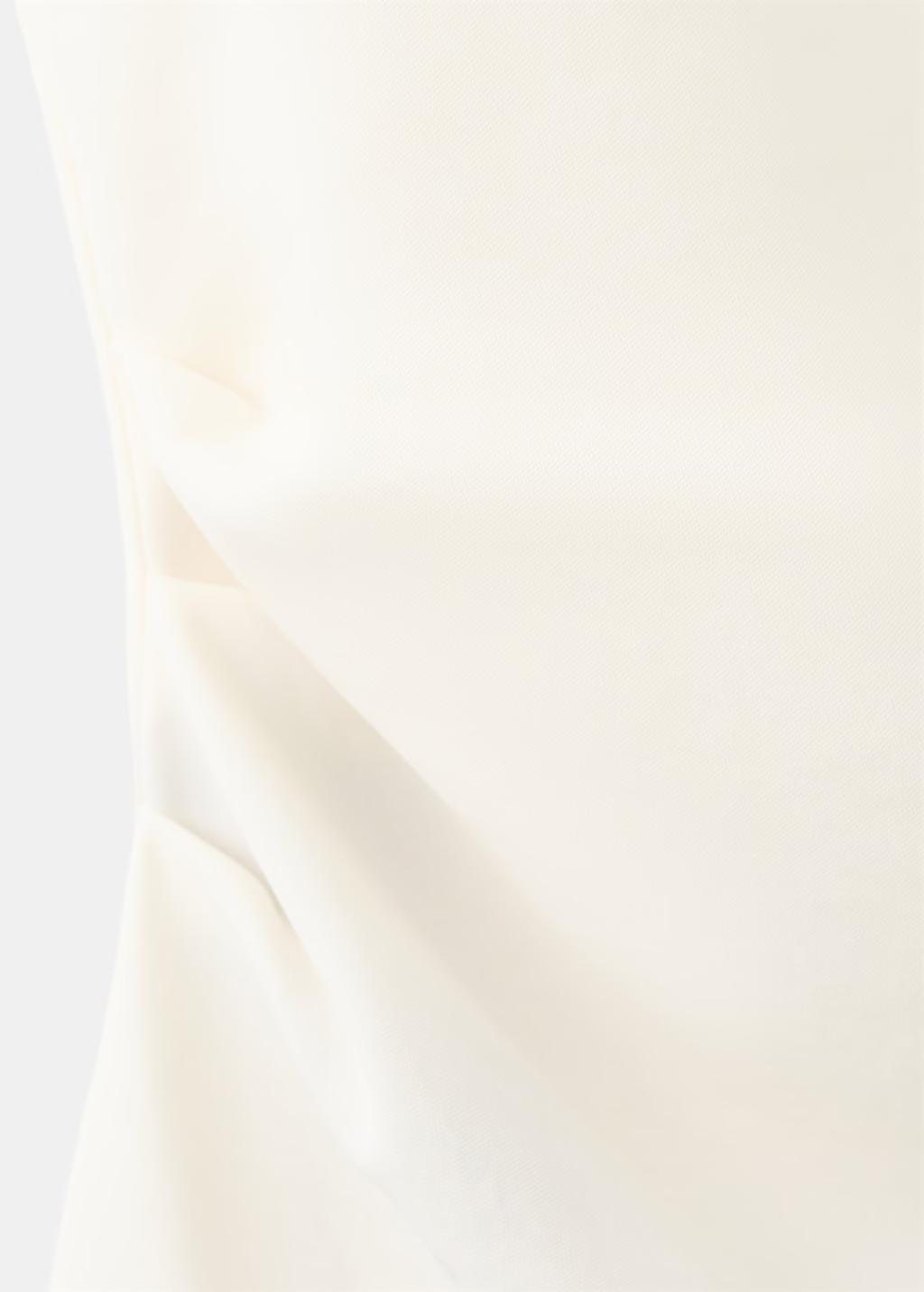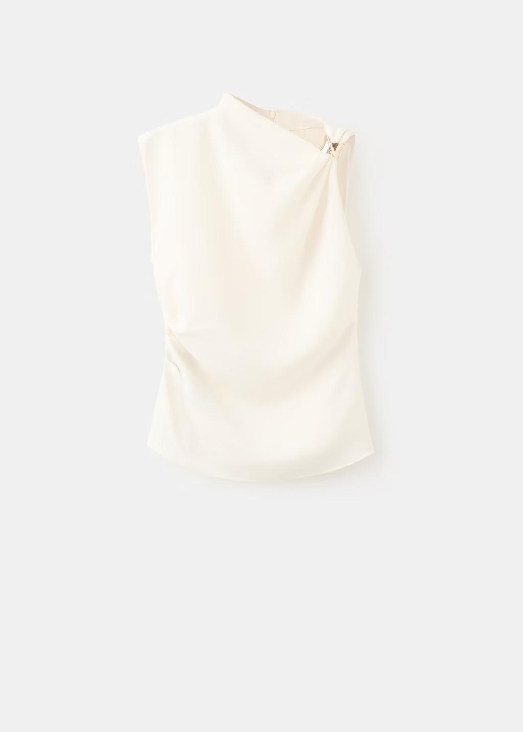Con diseño entallado, esta prenda presenta un cuello redondo y mangas asimétricas. El tirante incluye un detalle metálico, mientras que el fruncido lateral añade textura. Cierre de cremallera en la parte posterior