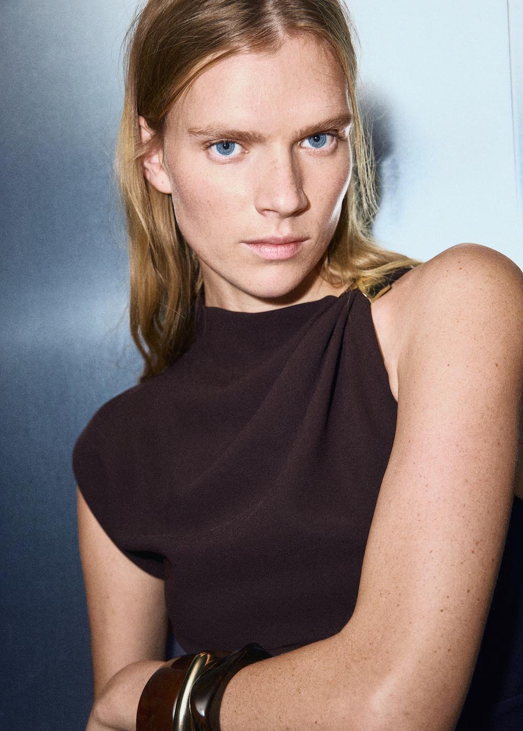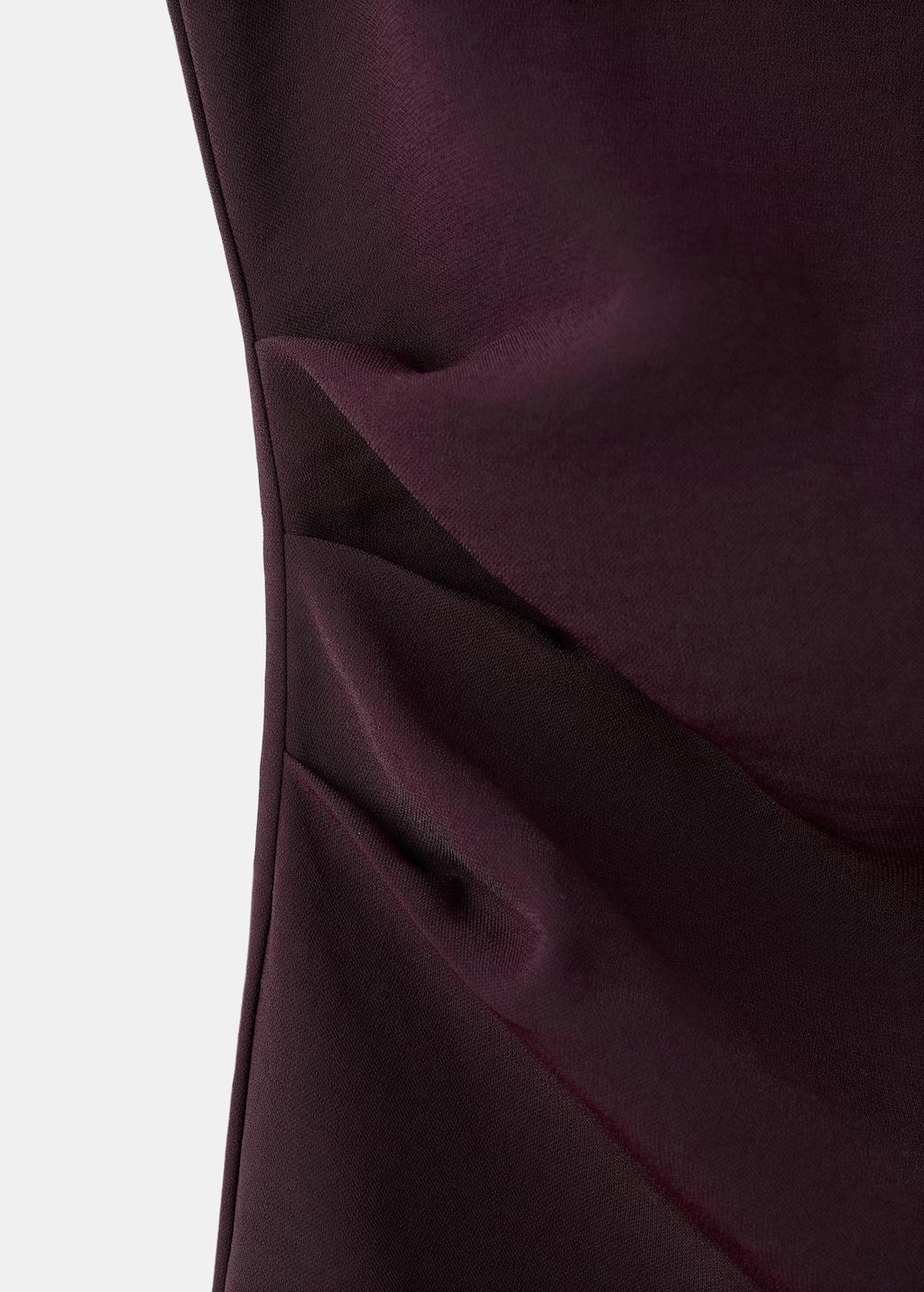 Con diseño entallado, esta prenda presenta un cuello redondo y mangas asimétricas. El tirante incluye un detalle metálico, mientras que el fruncido lateral añade textura. Cierre de cremallera en la parte posterior