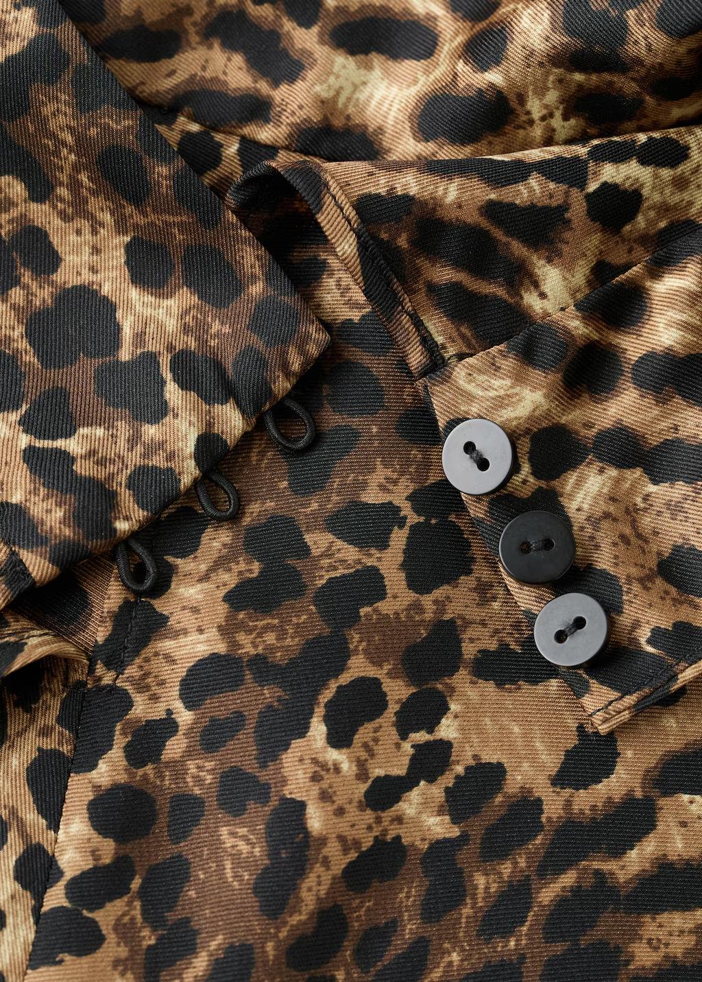 Confeccionada en tejido satinado, esta prenda presenta un diseño recto con estampado de leopardo, cuello alto y manga corta. Se cierra mediante botones en la parte posterior. Cuenta con una falda a conjunto
