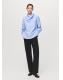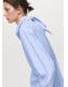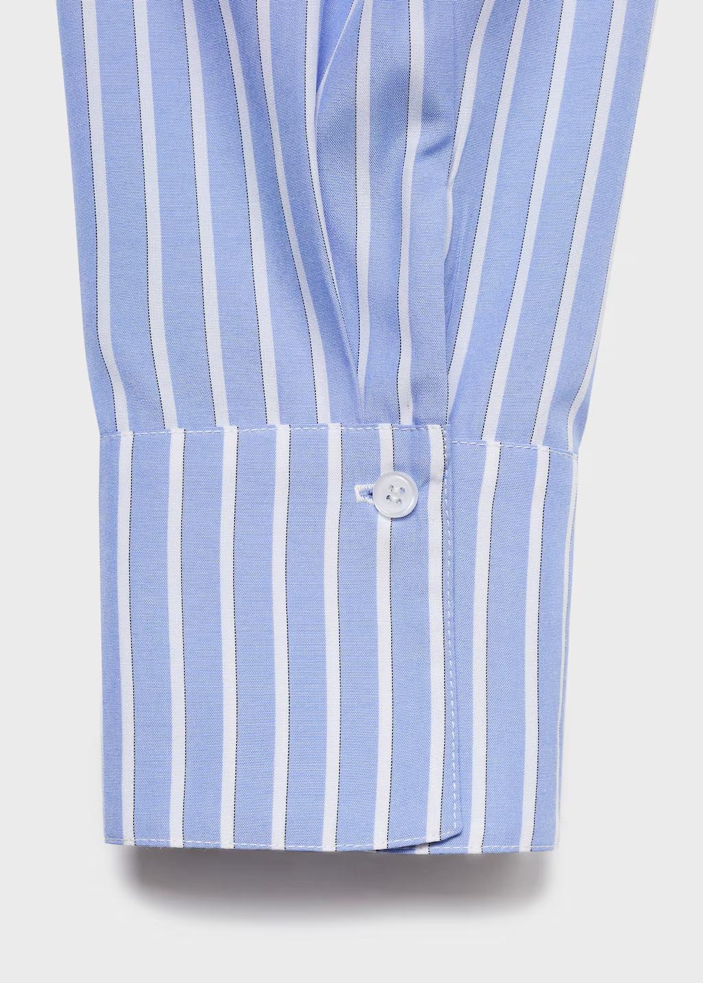 Con diseño recto y de rayas, esta prenda presenta un cuello redondo adornado con un pañuelo. Tiene manga larga con puños abotonados y cierre de botón en el cuello