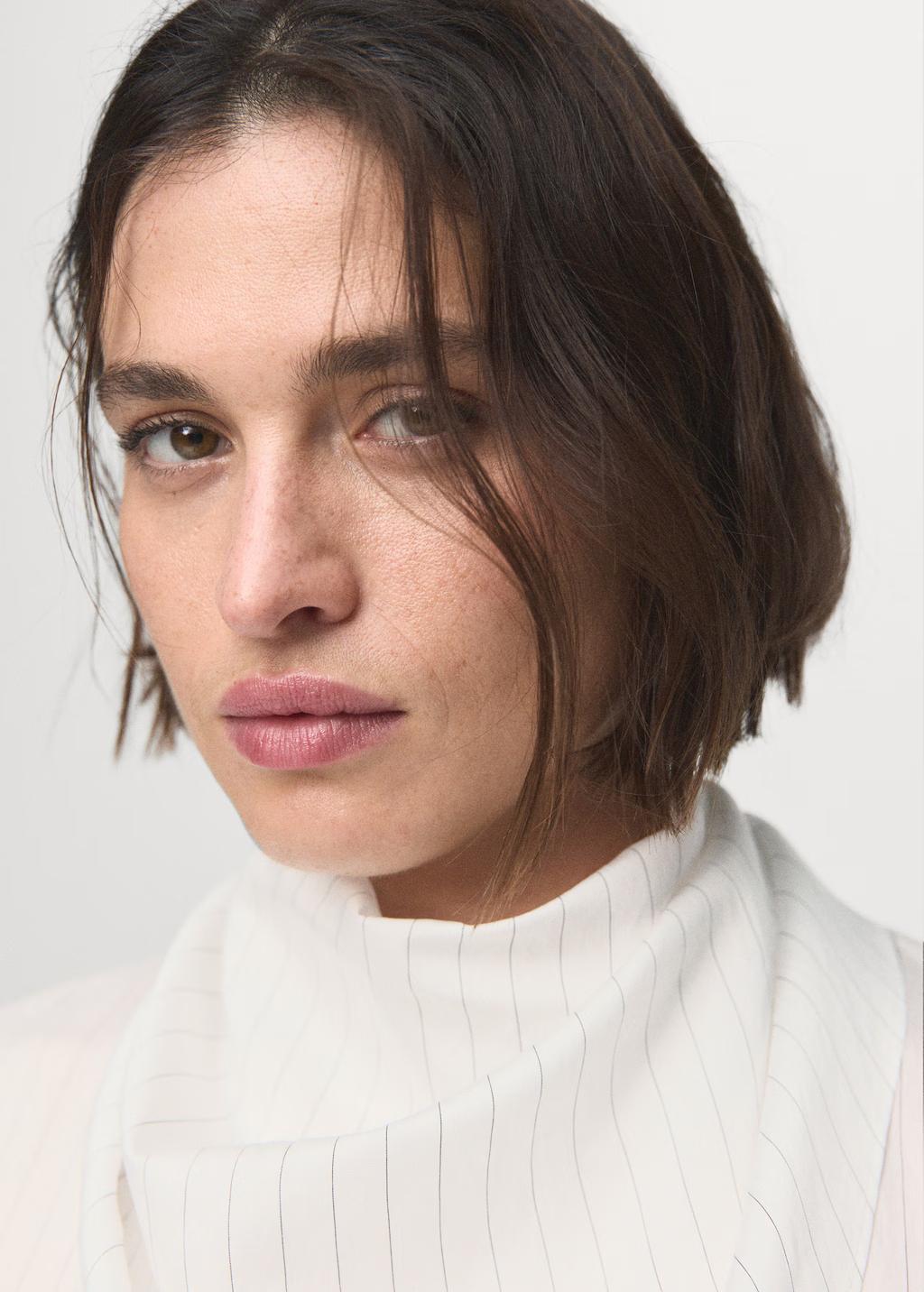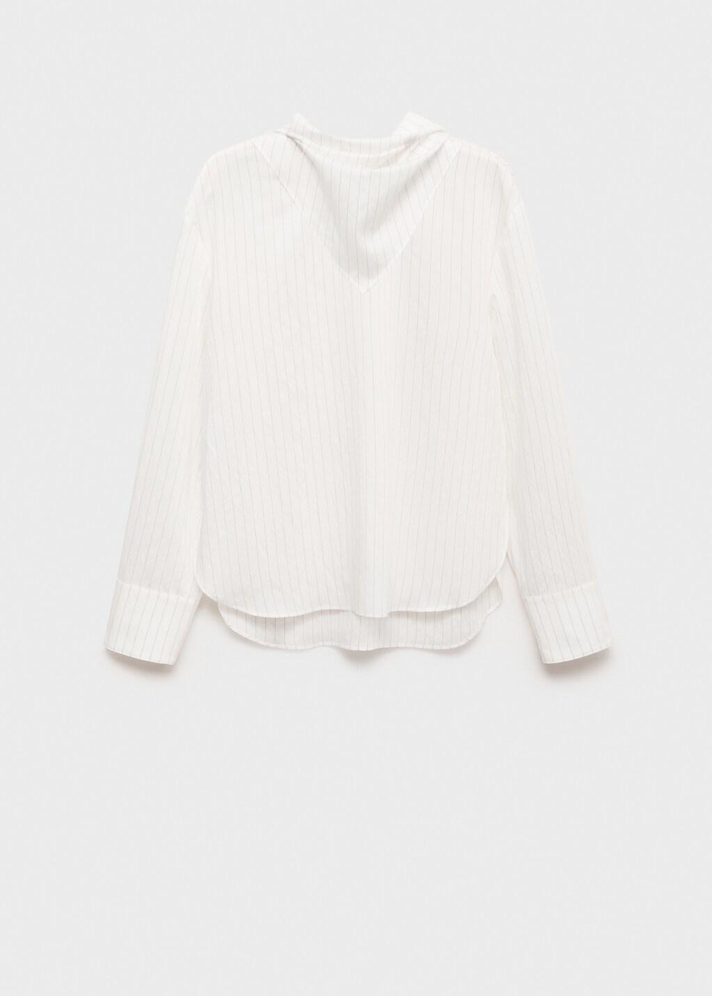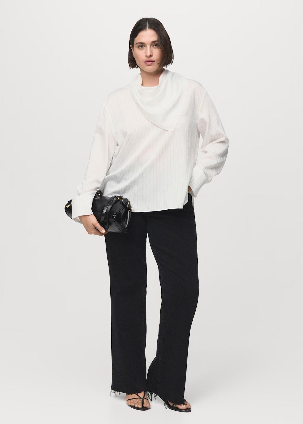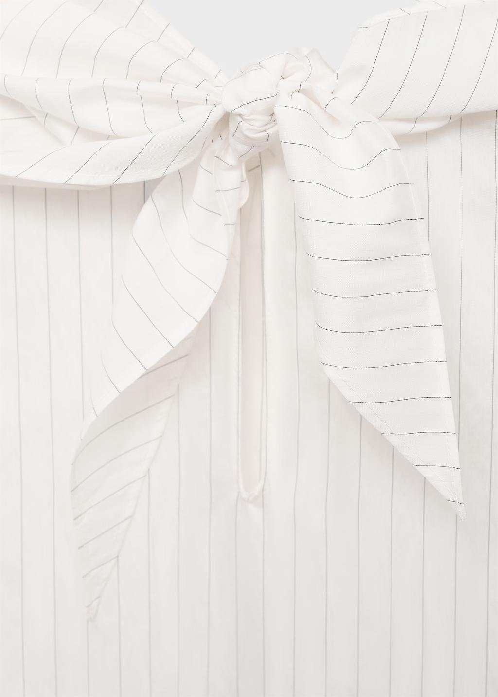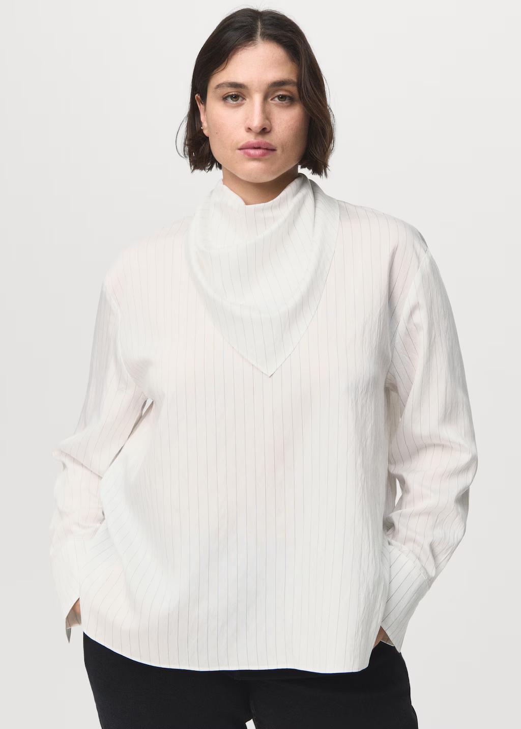 Con diseño recto y de rayas, esta prenda presenta un cuello redondo y manga larga. Incluye un pañuelo en el cuello y cierre de botón en la parte posterior. Disponible en tallas Plus
