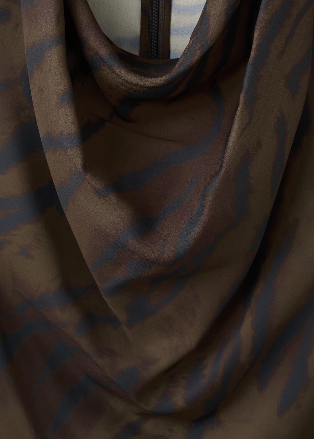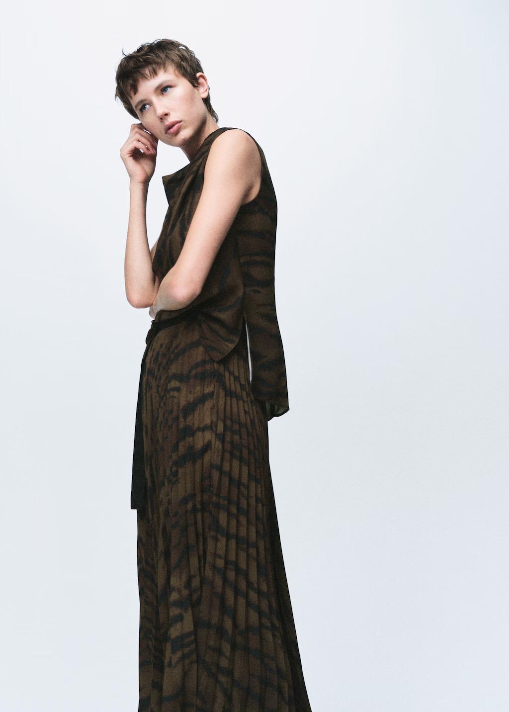 Diseño recto. Estampado animal print. Cuello drapeado. Tirantes anchos. Bajo con dos aberturas laterales. Cierre de cremallera en la parte posterior