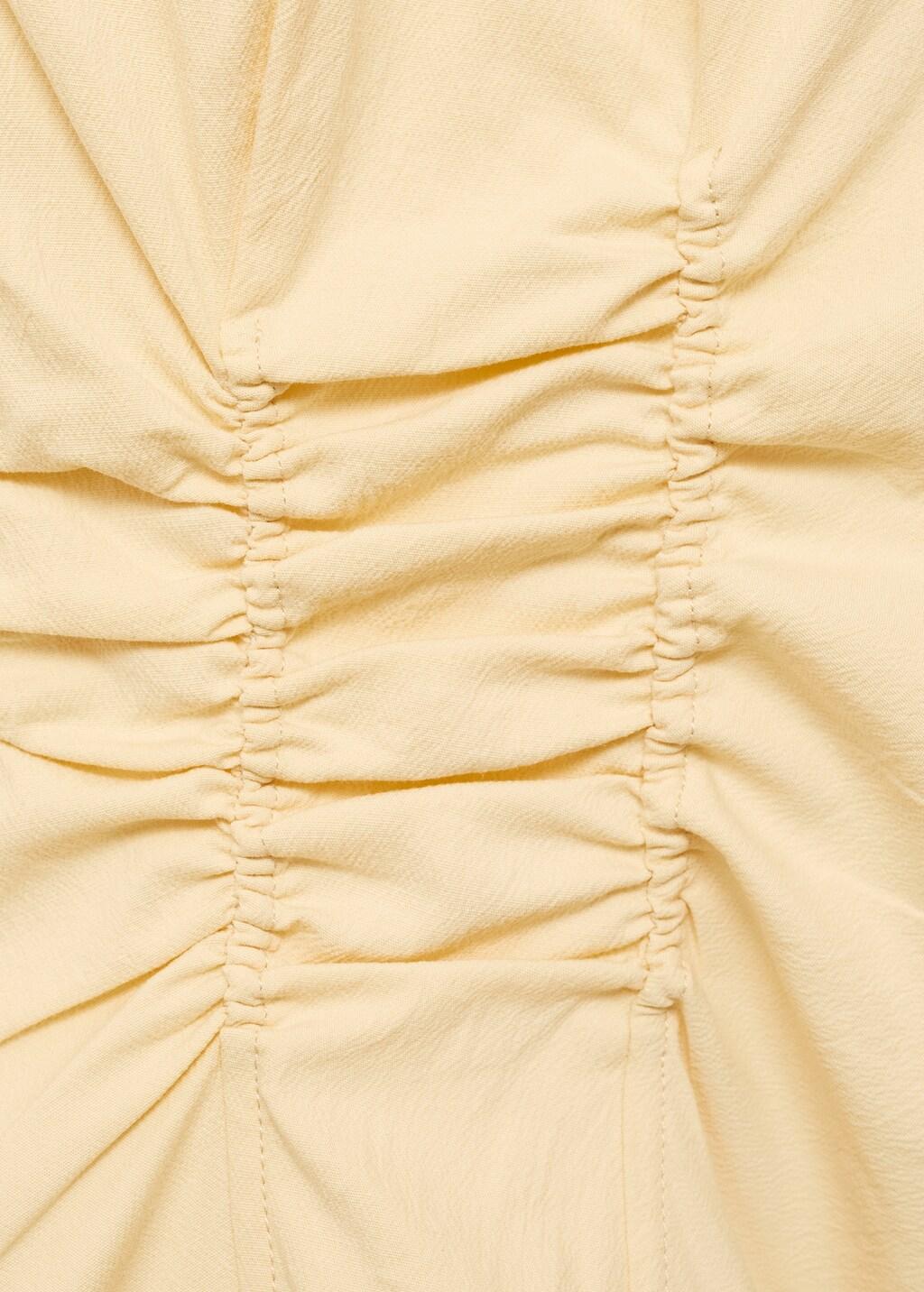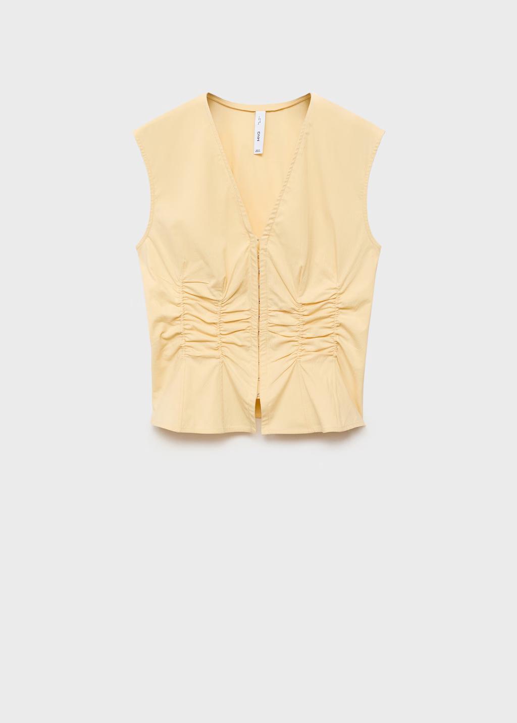 Confeccionada en tejido popelín de algodón, esta prenda presenta un diseño recto con cuello de pico y tirantes anchos. Incorpora detalles fruncidos y cierre de ganchos en la parte delantera