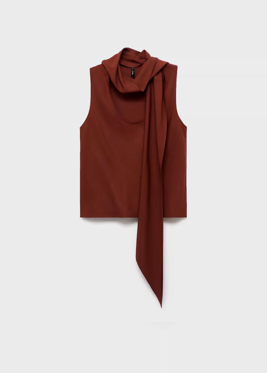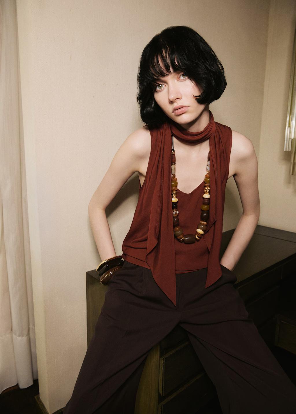 Con un diseño recto y liso, esta prenda presenta un cuello escotado con adorno de fular en el cuello y tirantes anchos