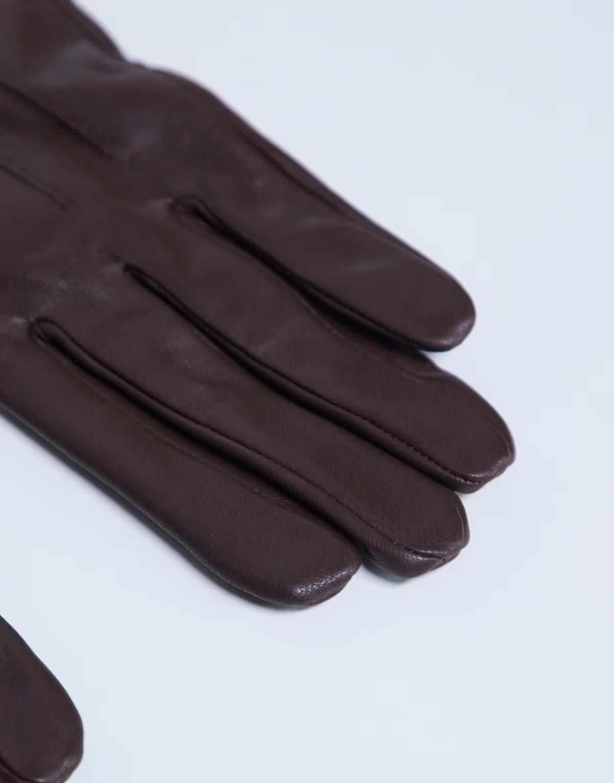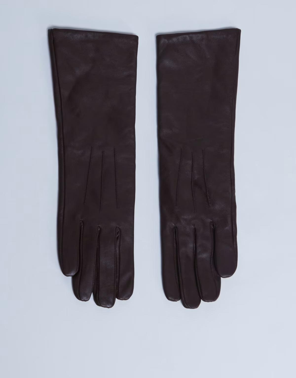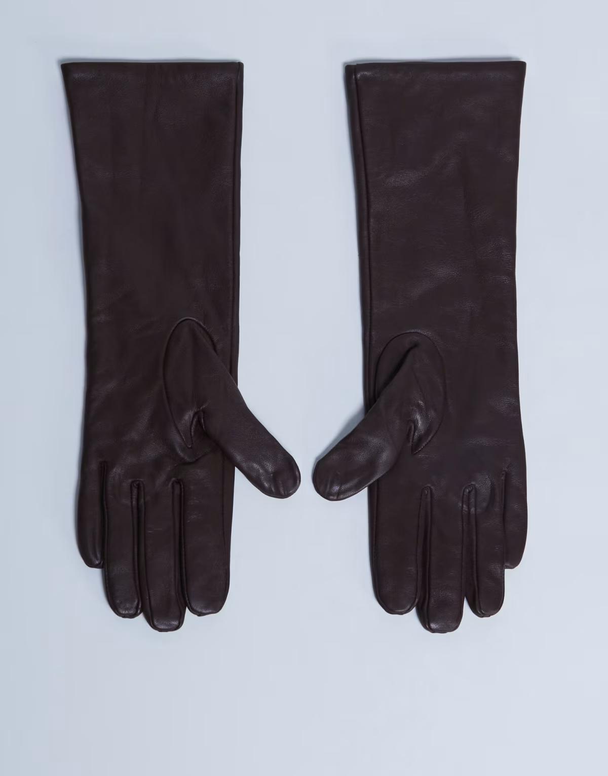 These gloves feature a smooth, matte outer with a soft-touch underlay. They are designed in chocolate brown and have elongated cuffs.