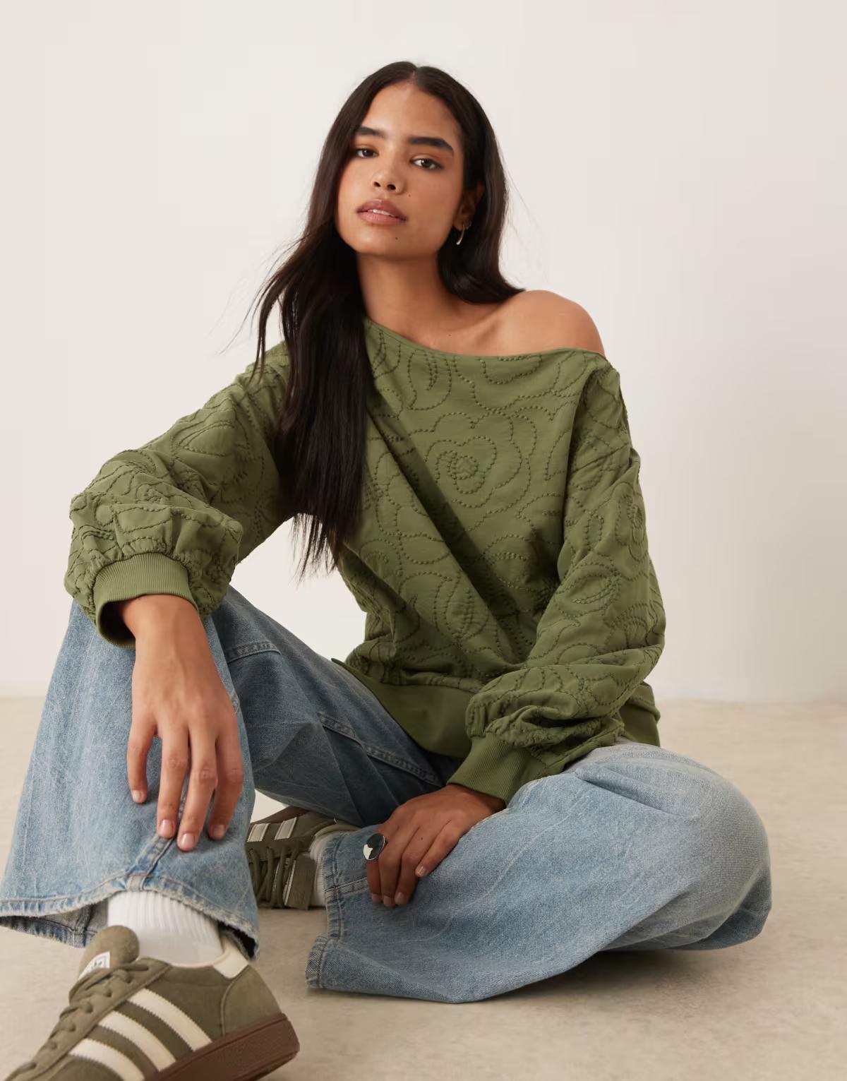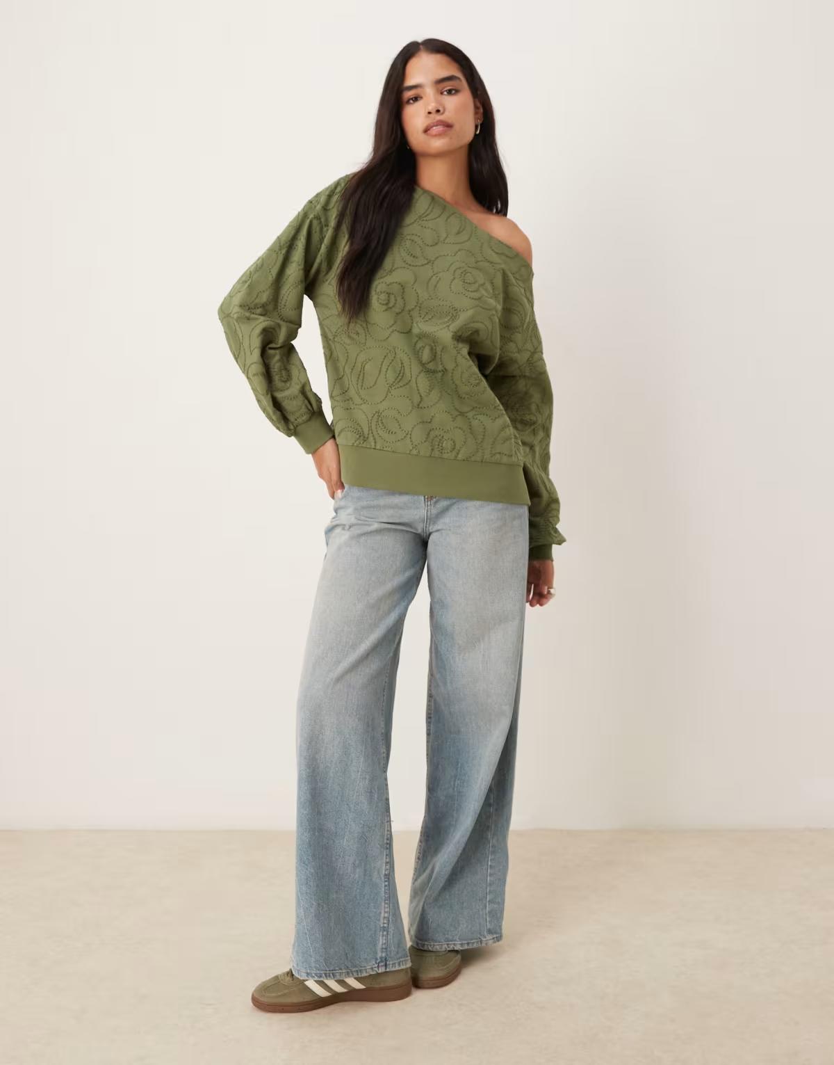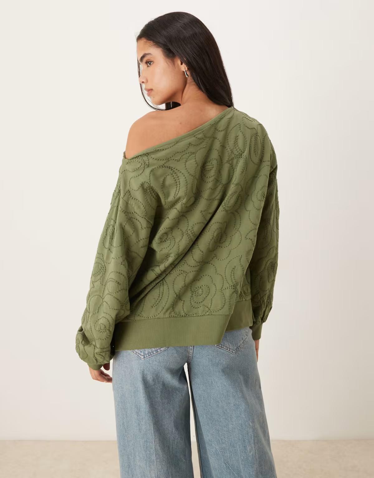 ASOS DESIGN off shoulder sweatshirt with embroidery detail in washed khaki