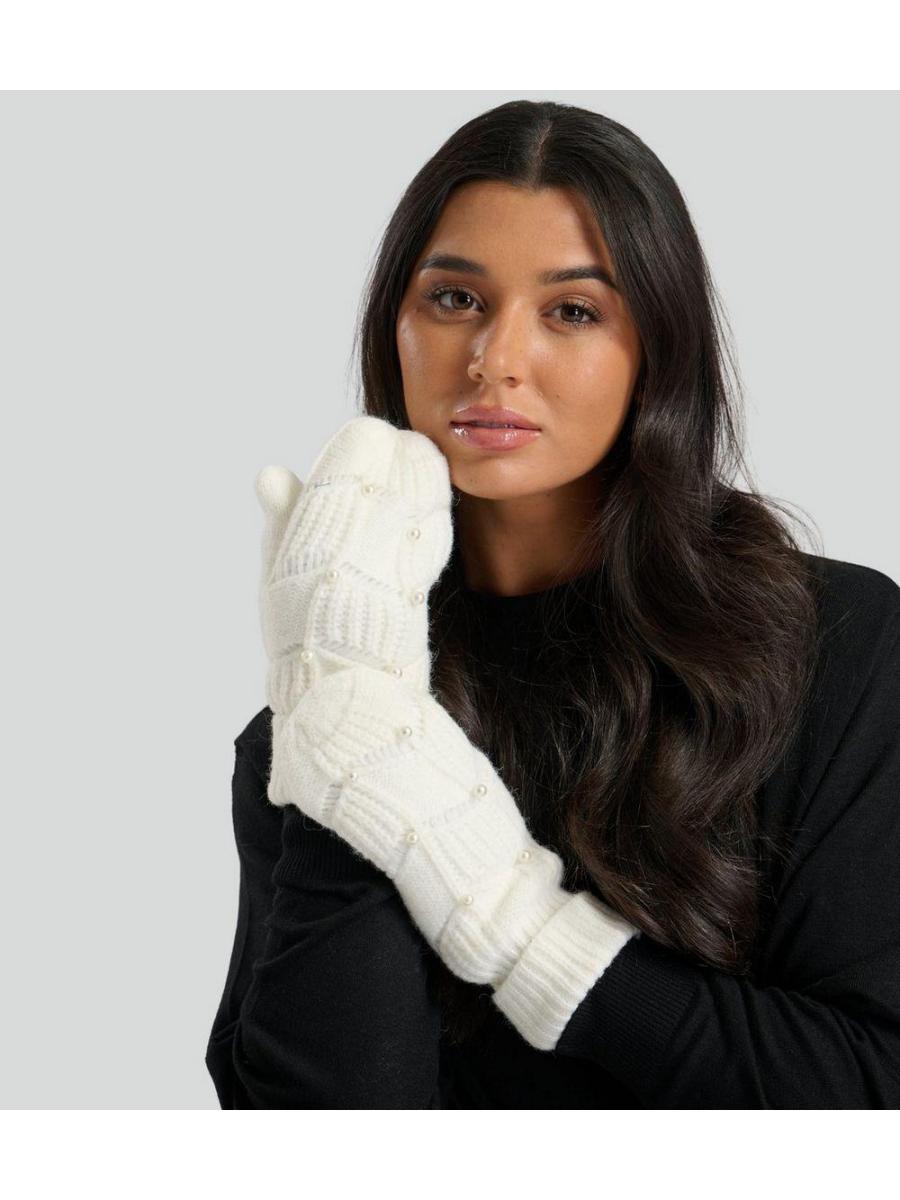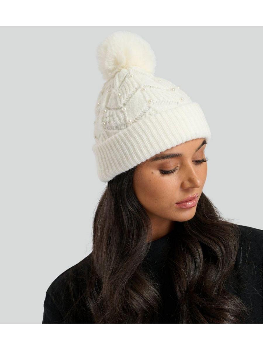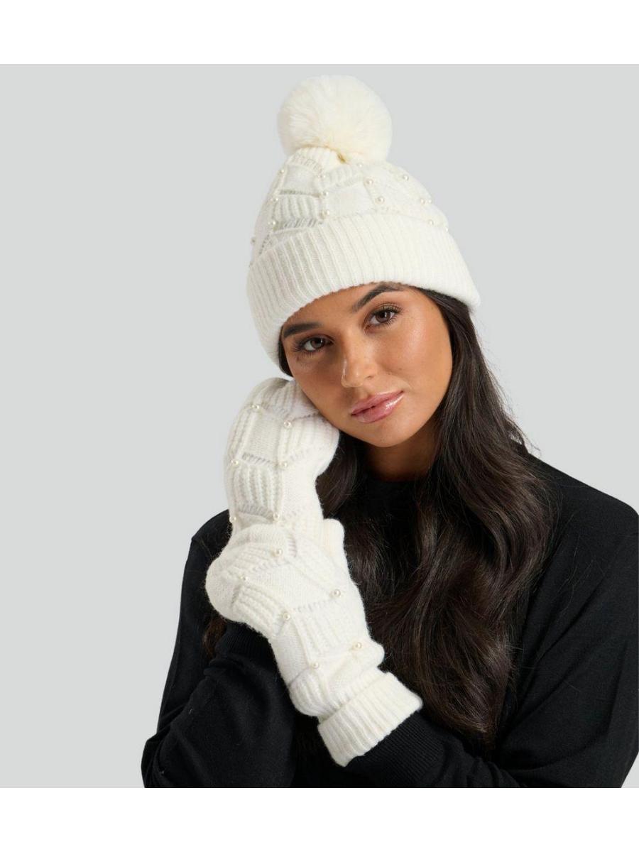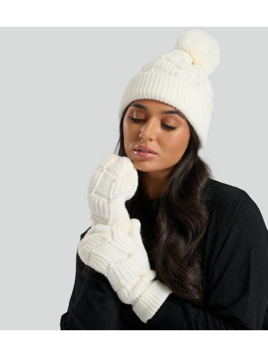 South Beach Cream Embellished Pom Pom Beanie Hat and Mittens