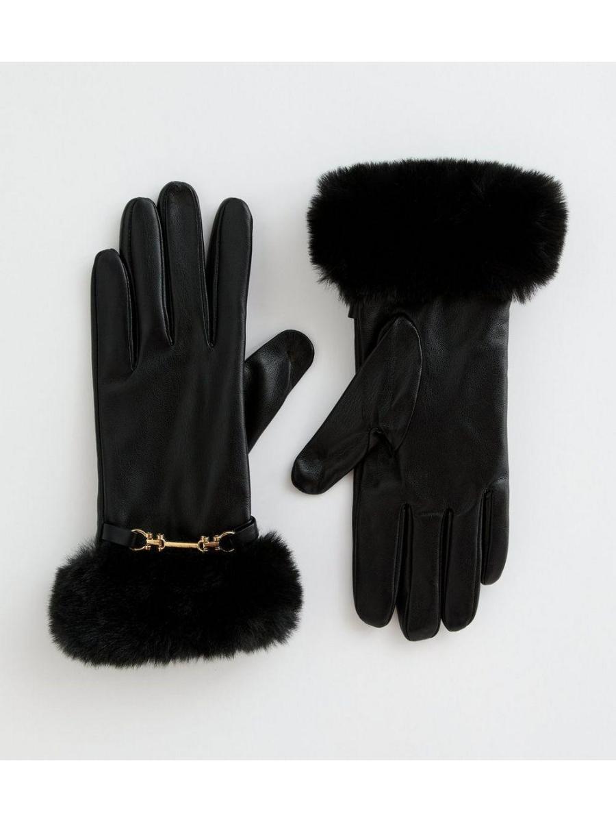 Black Faux Fur Trimmed Faux Leather Gloves with Chain