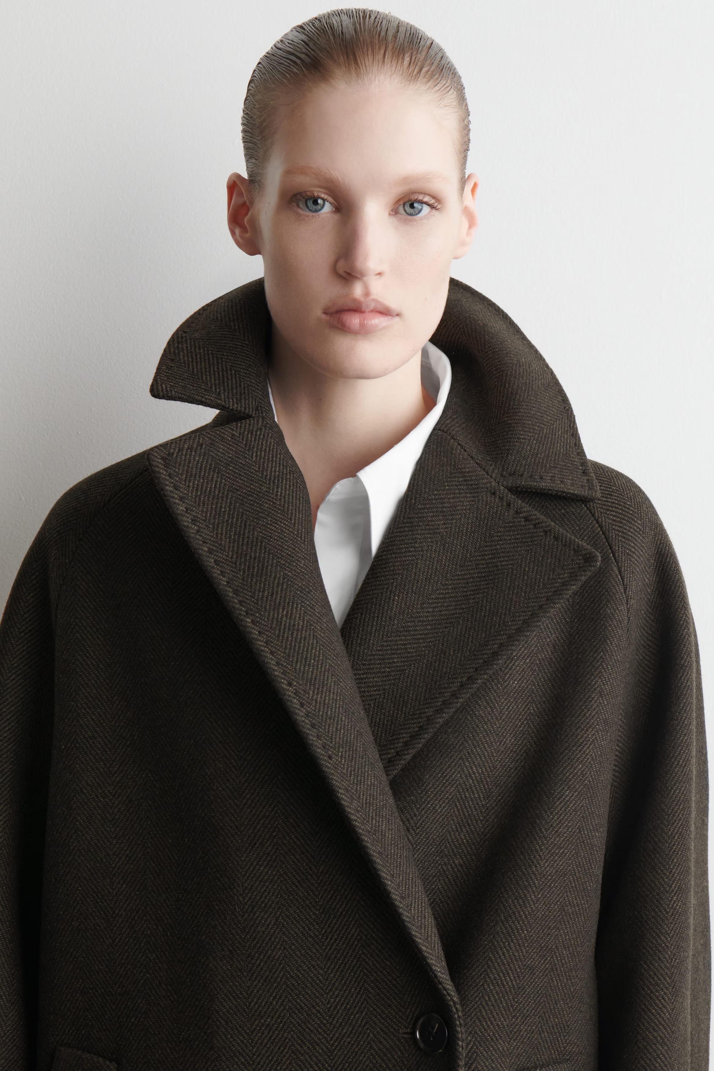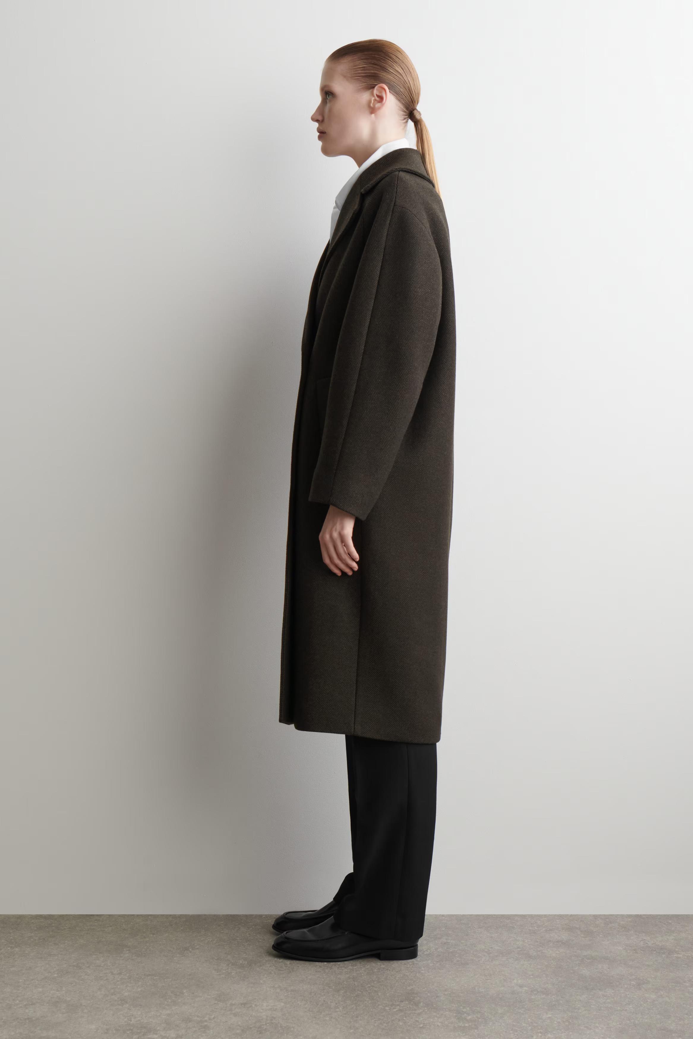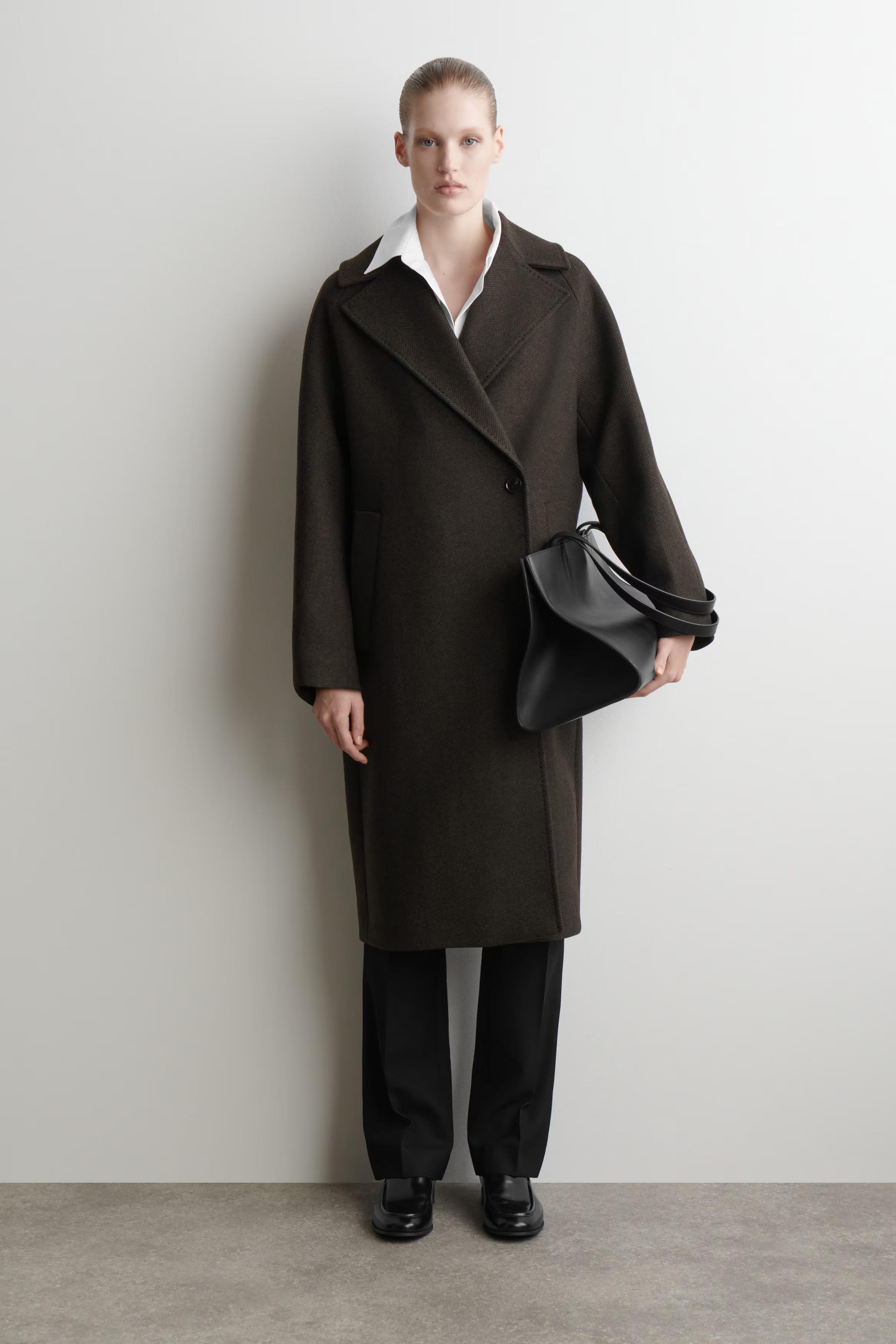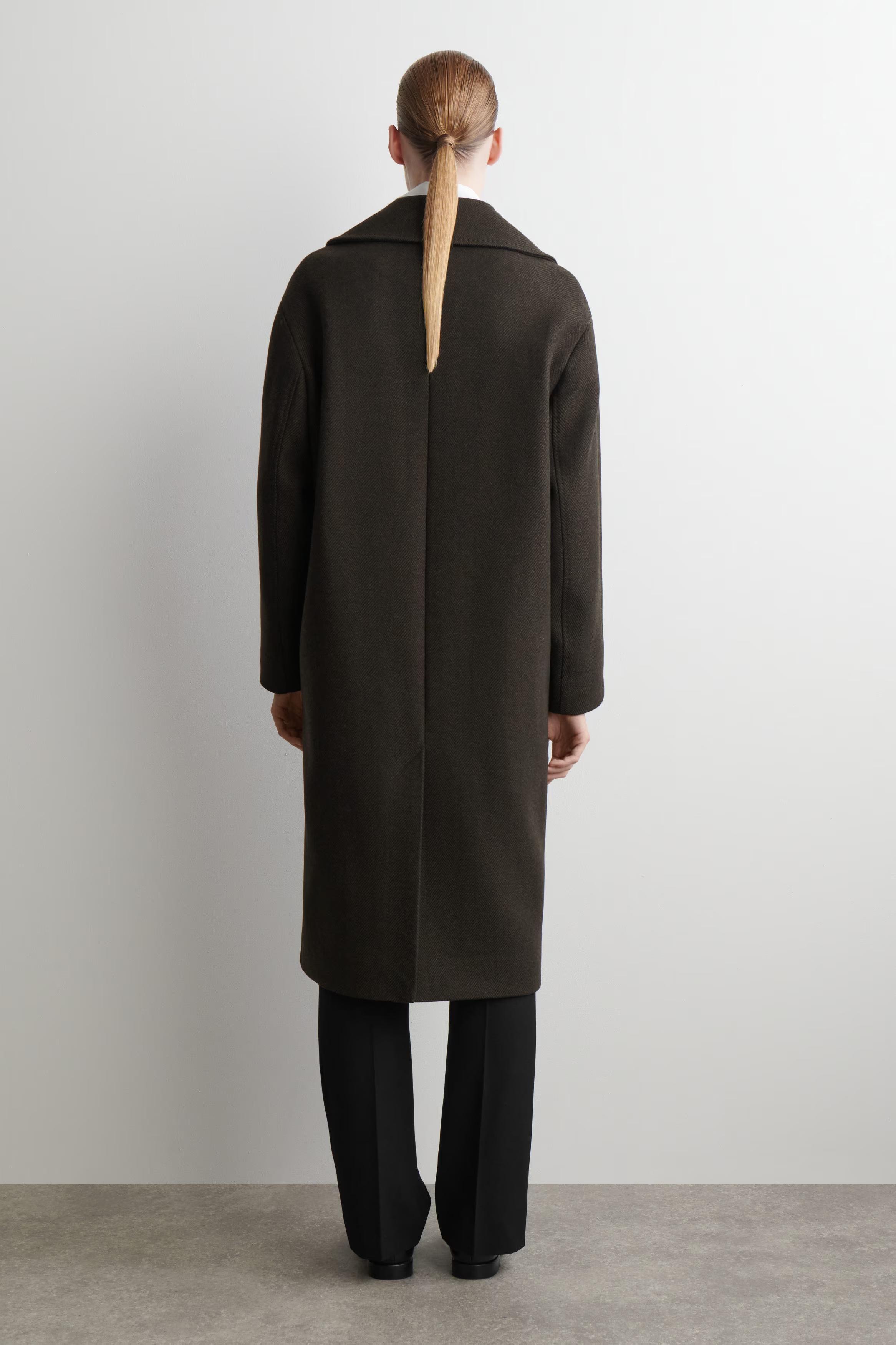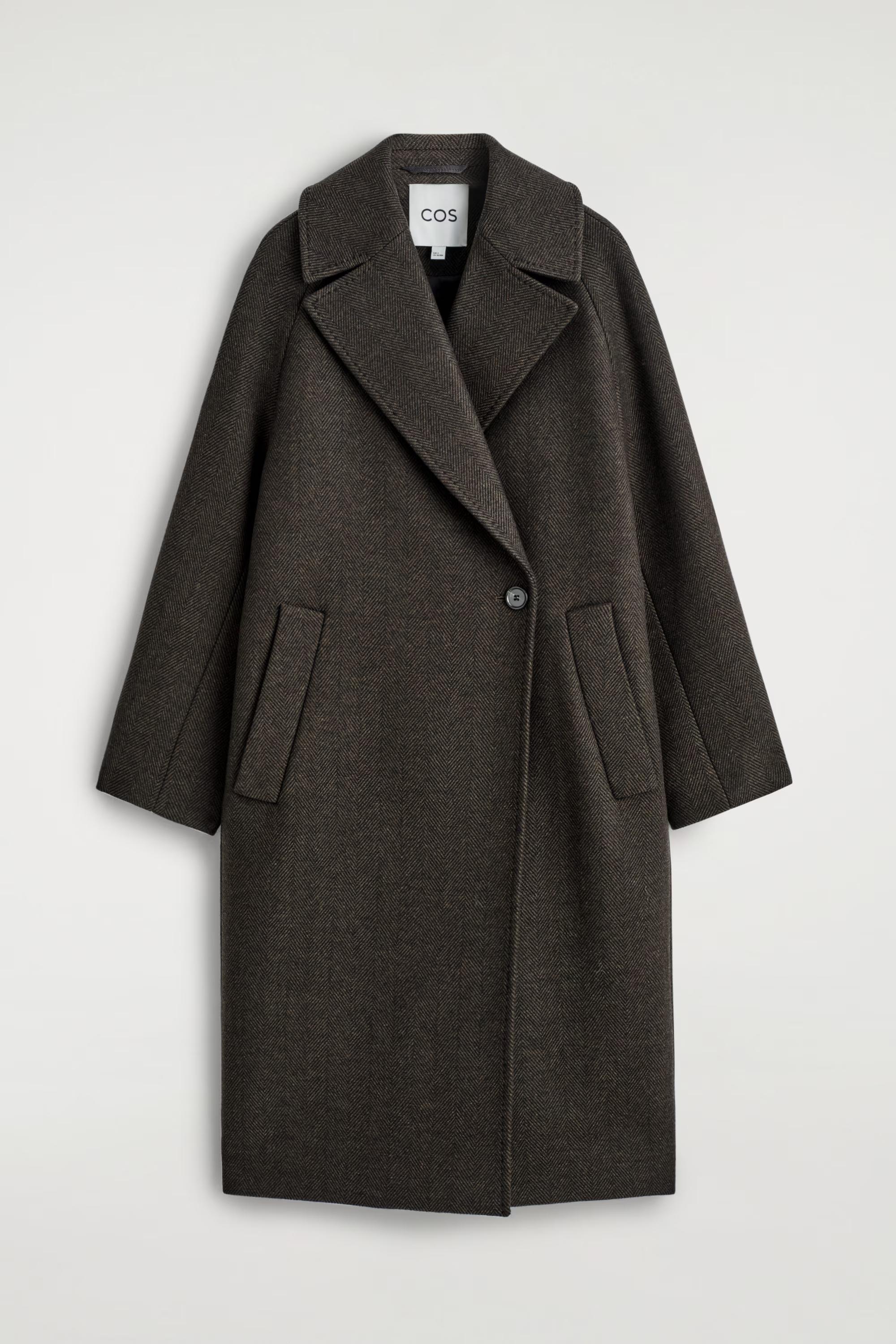 The enduring appeal of this coat ensures you'll reach for it season after season. Tailored in an oversized shape, it's crafted from recycled wool-blend herringbone sourced from Italian luxury textile makers, Manteco, and features exaggerated lapels, soft shoulders and a back vent with premium pick stitching.\u0026nbsp;Oversized fitButton closureRecycled wool is made from yarn-spinning waste, yarn overstock, production-cutting waste and post-consumer garments \u0026ndash; creating new pieces without waste\u0026nbsp;\u0026nbsp;Shell: 70% Recycled wool, 30% Recycled polyamide (Recycled nylon). Lining: 100% Viscose. Excluding trims / Dry clean\u0026nbsp;Back length of size S is 112cm / Model wears a size S