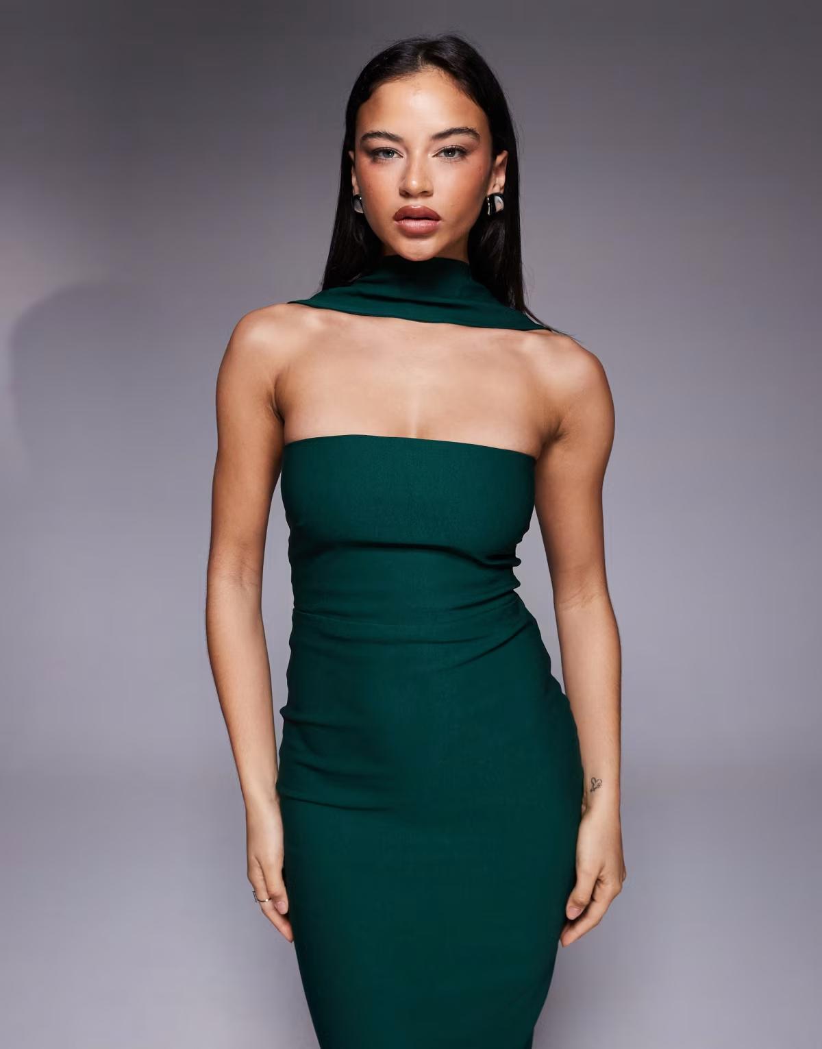 Vesper bengaline bandeau choker detail back button detail maxi dress in forest green
