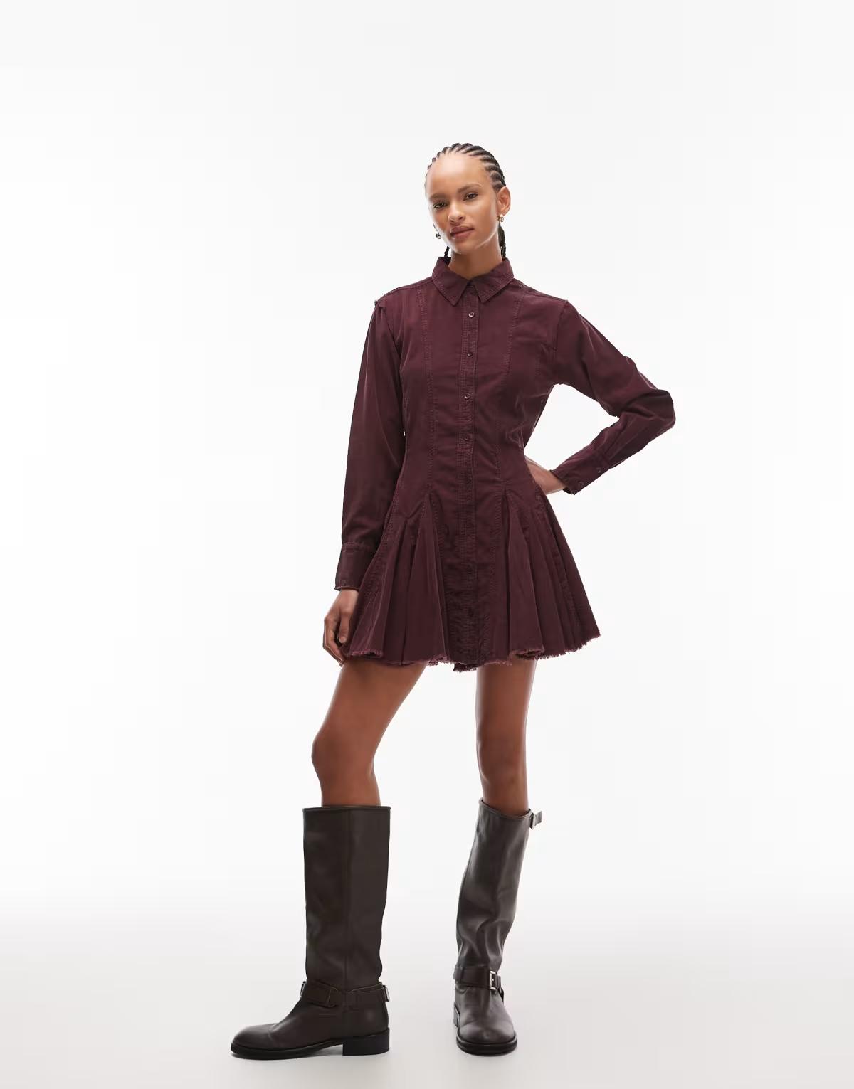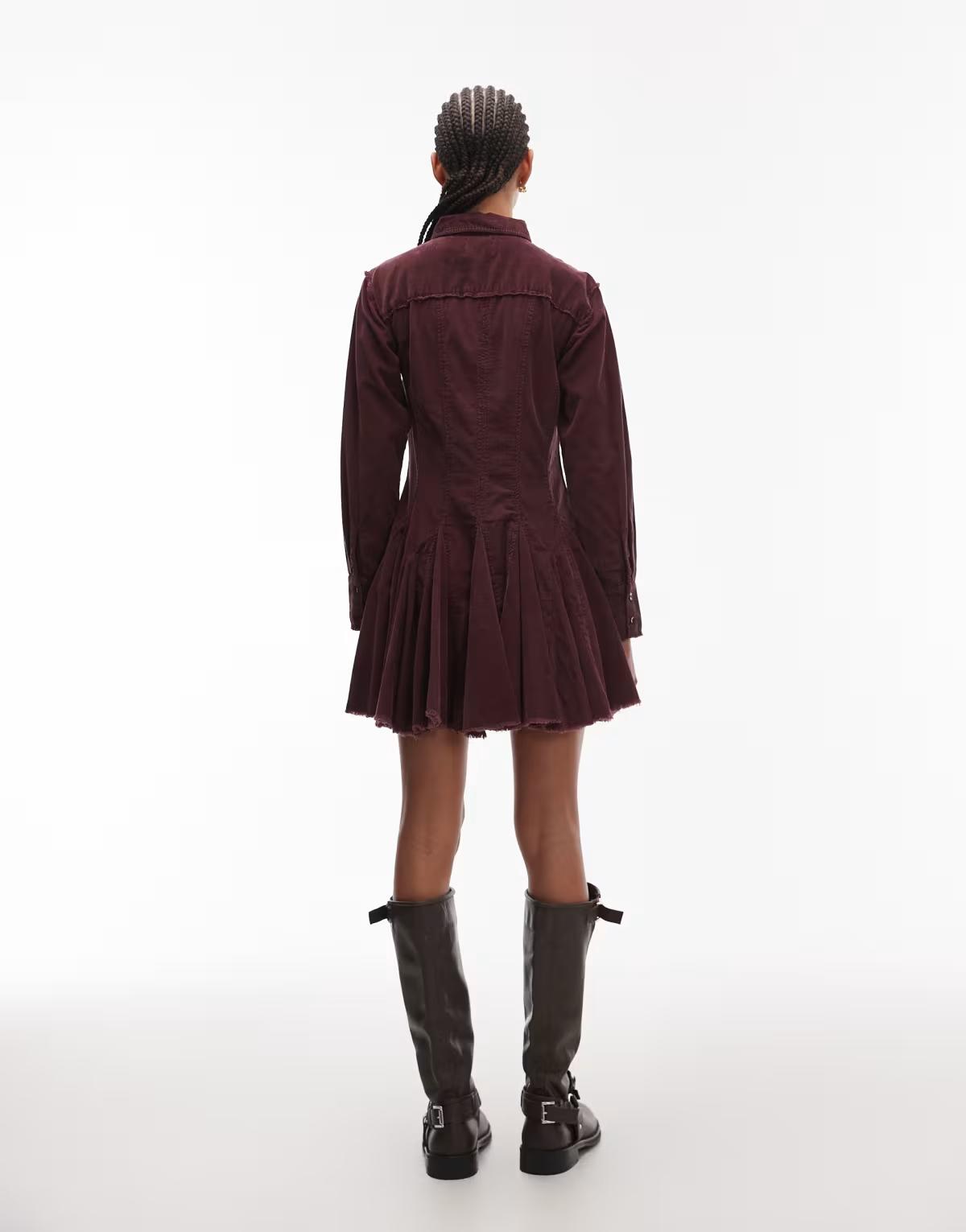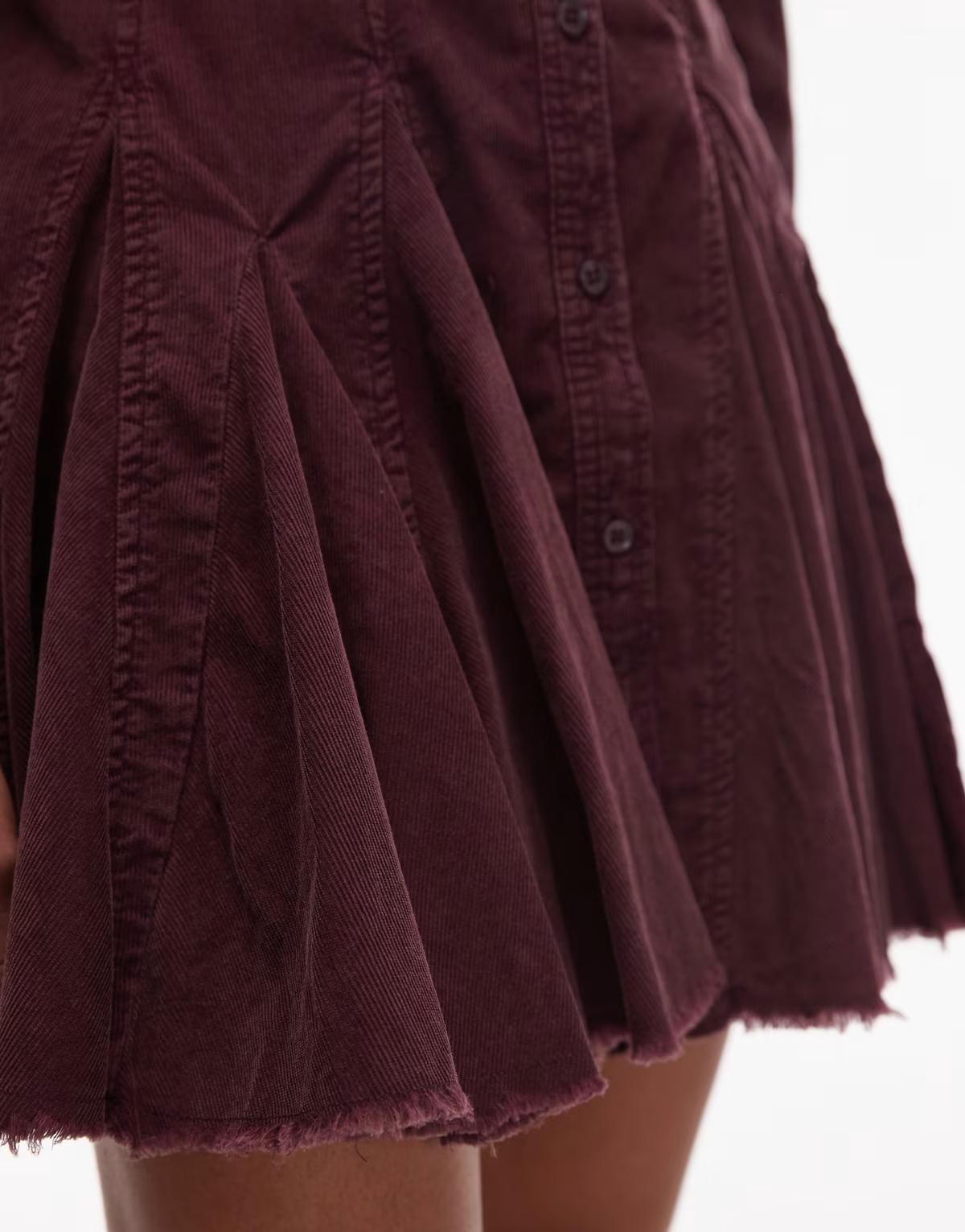 ASOS DESIGN cord shirt dress with nipped in waist and godets in washed burgundy