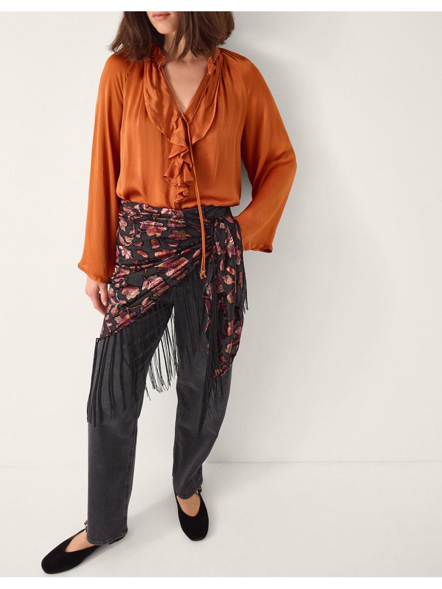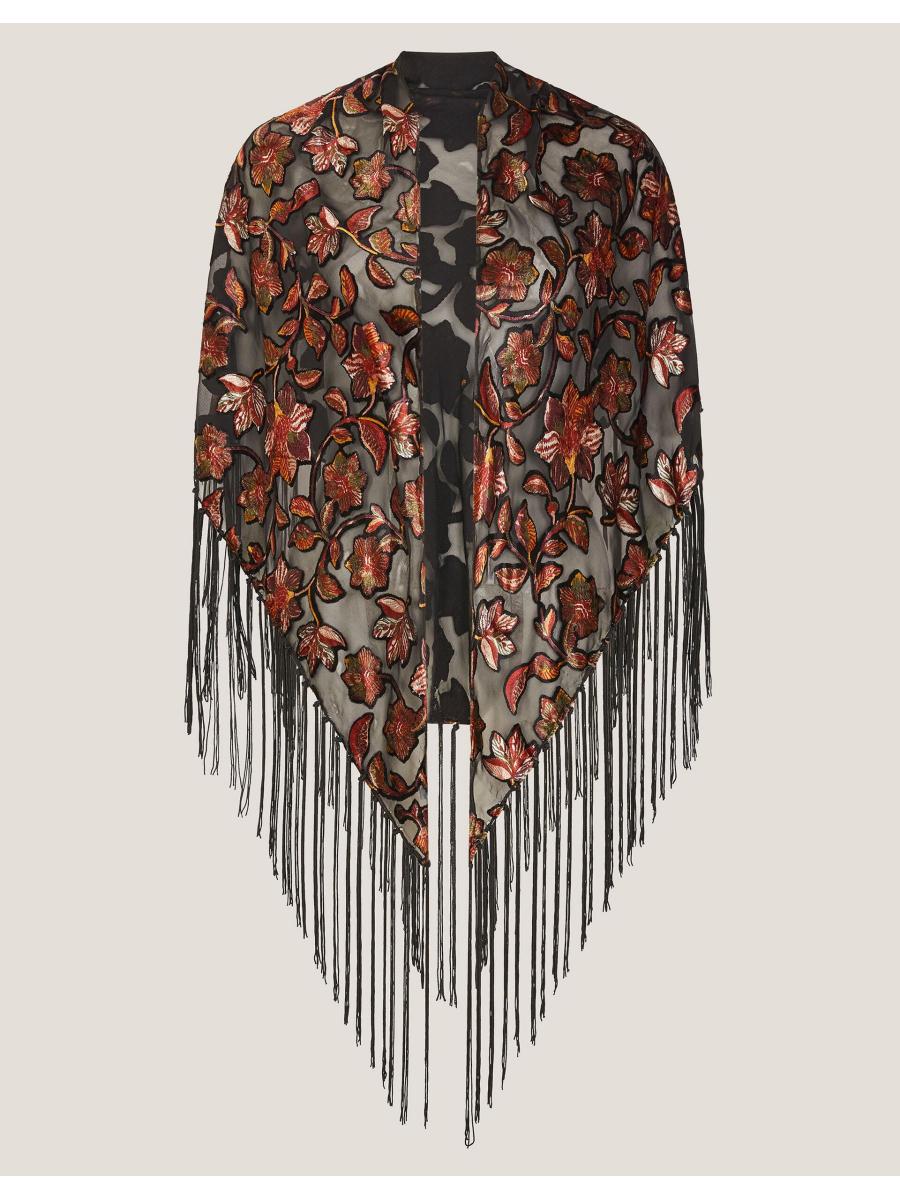 Main character energy. Covered in velvet Autumnal florals and finished with fringe cascading through the hem, this scarf is the accessory to elevate an evening look. Drape over a dress and you'll be getting all the compliments.