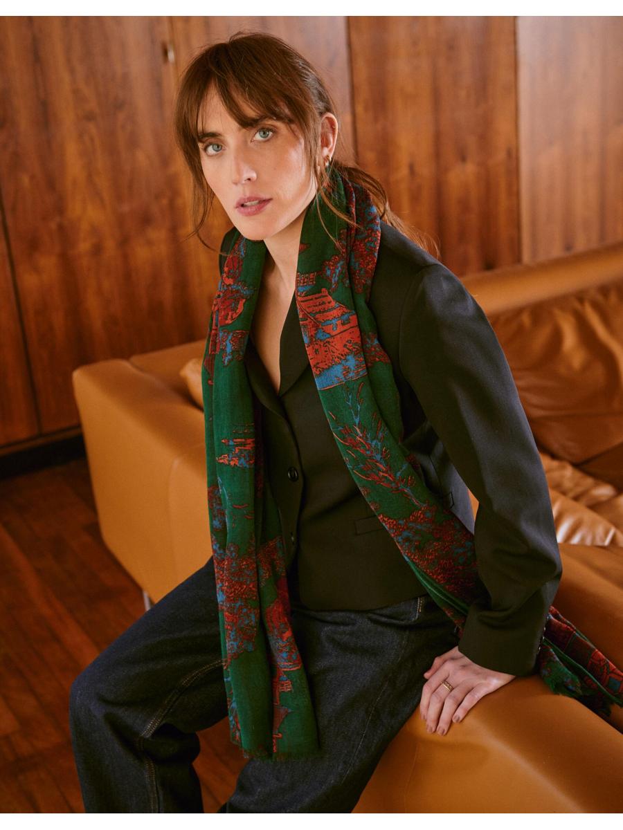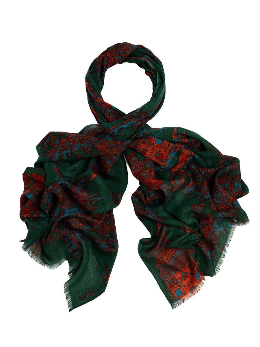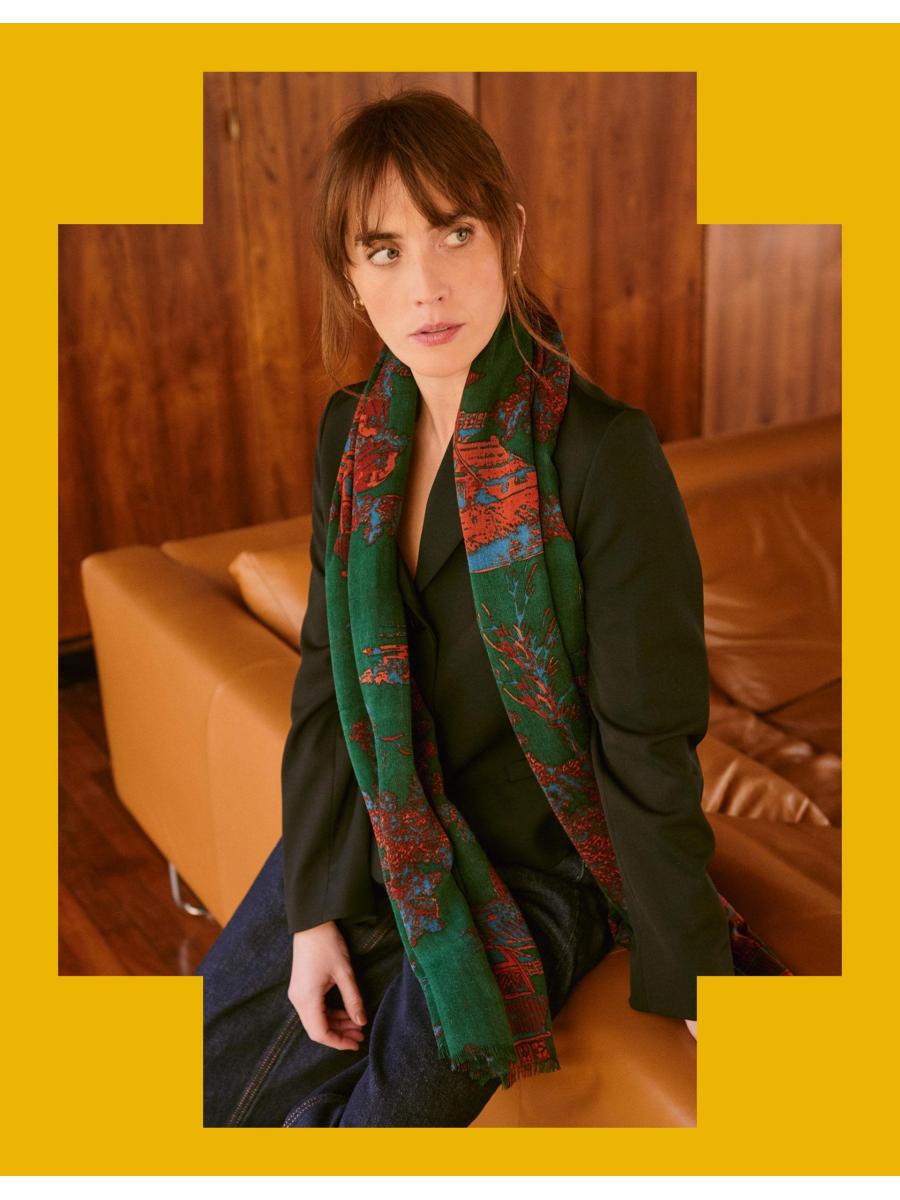 The product: Nothing says wintertime like a wool scarf. Drawing inspiration from East Asian Pagoda forests, this scarf showcases illustrative designs of temple buildings and trees in saturated tones over the forest green backdrop.
