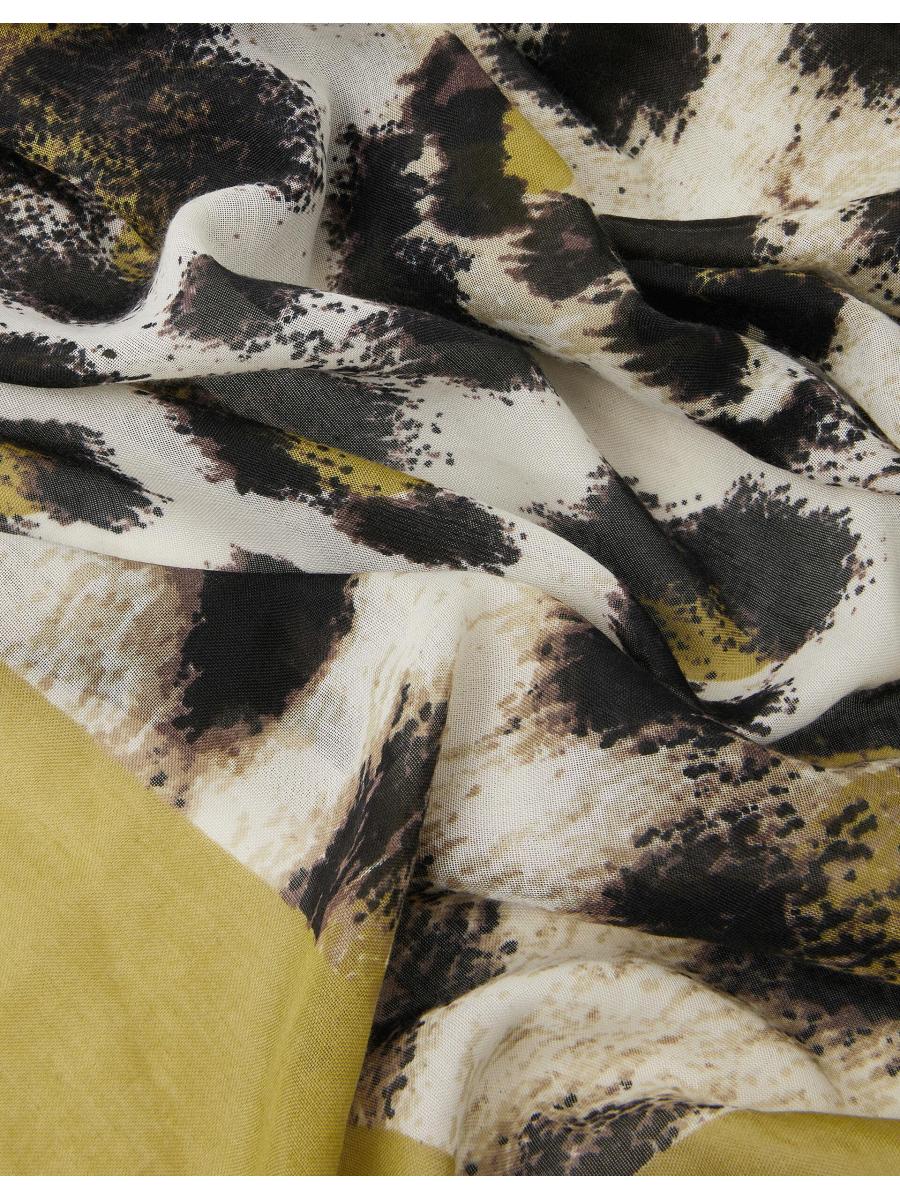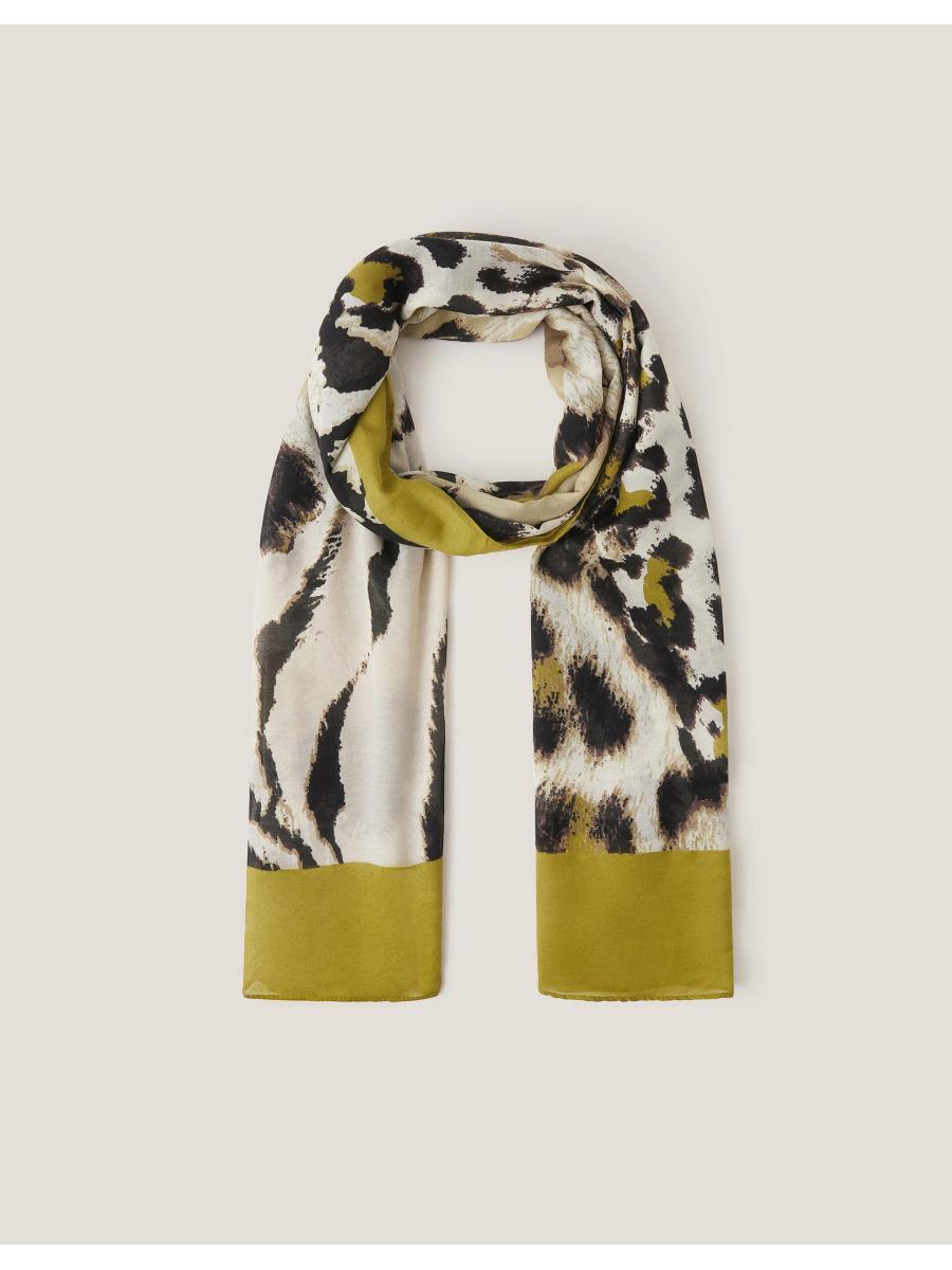 Feline fierce? Whisked from soft, lightweight yarns, this scarf is perfect for styling across the seasons. Patterned with a mix of animal spots and stripes, it's finished with a colourblock frame in a dreamy olive hue.