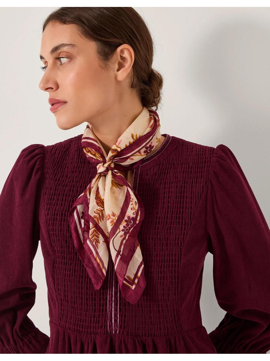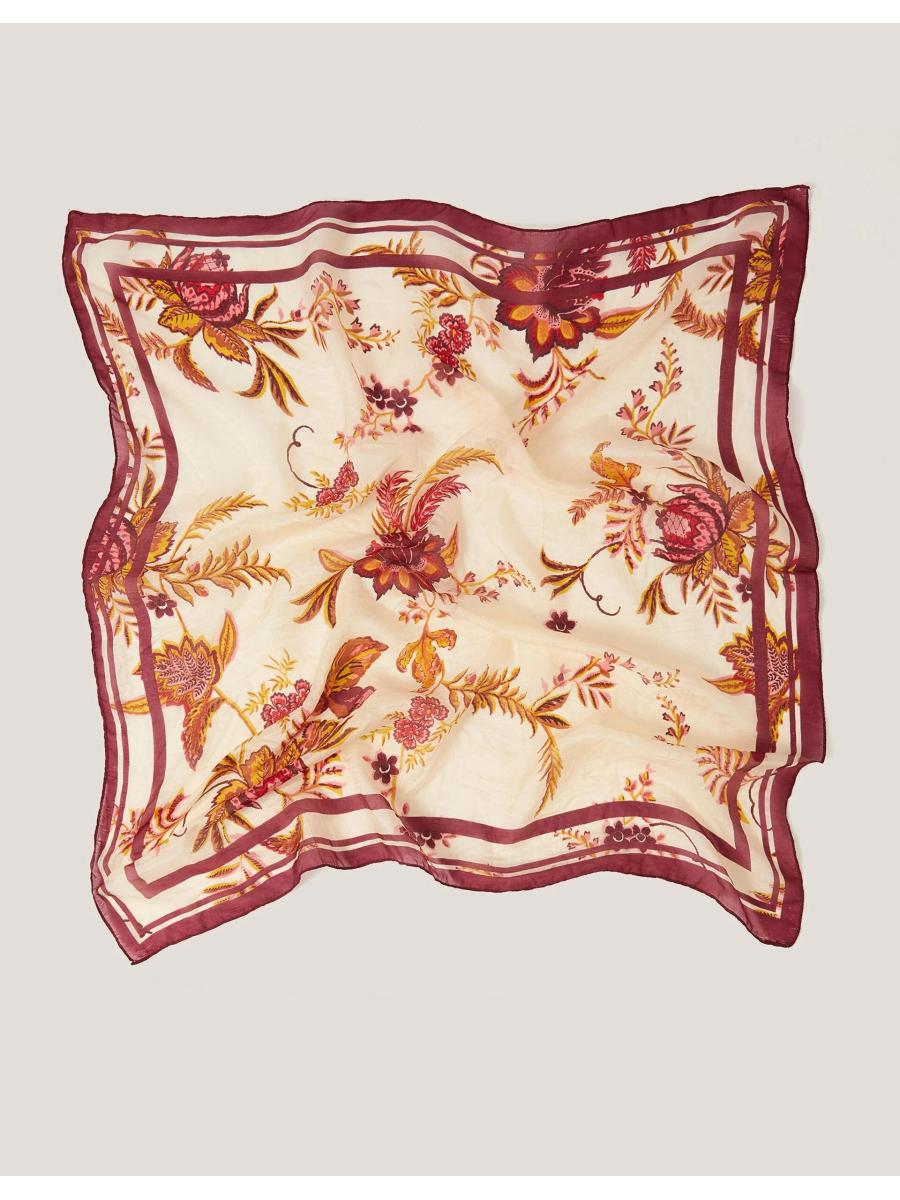 Invest in luxe accessories, once and flor-al. Whisked from soft silk yarns, this scarf is patterned with ornate florals in a mix of fiery, feminine hues. Perfect for wearing like a neckerchief or wrapping round your bag handles.
