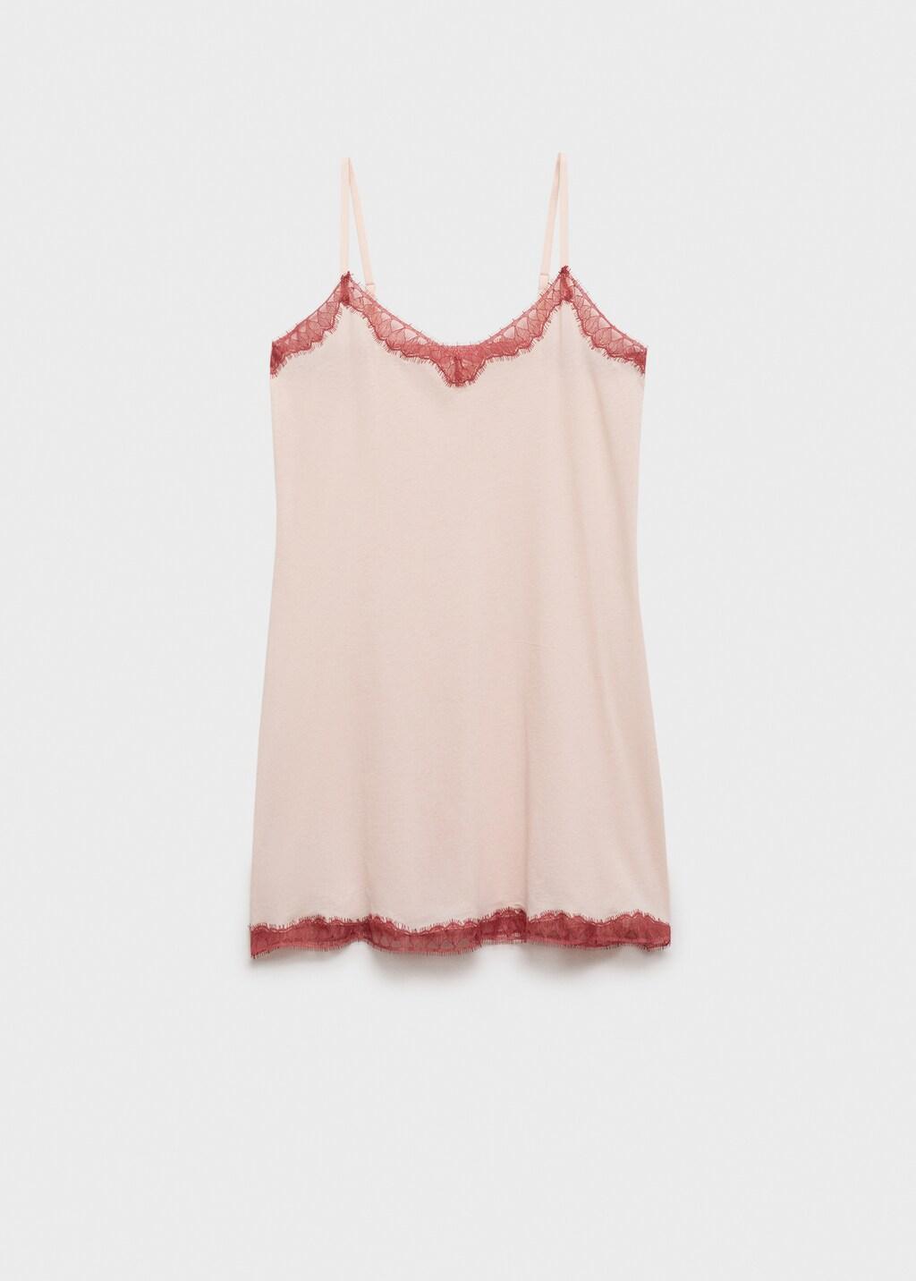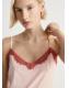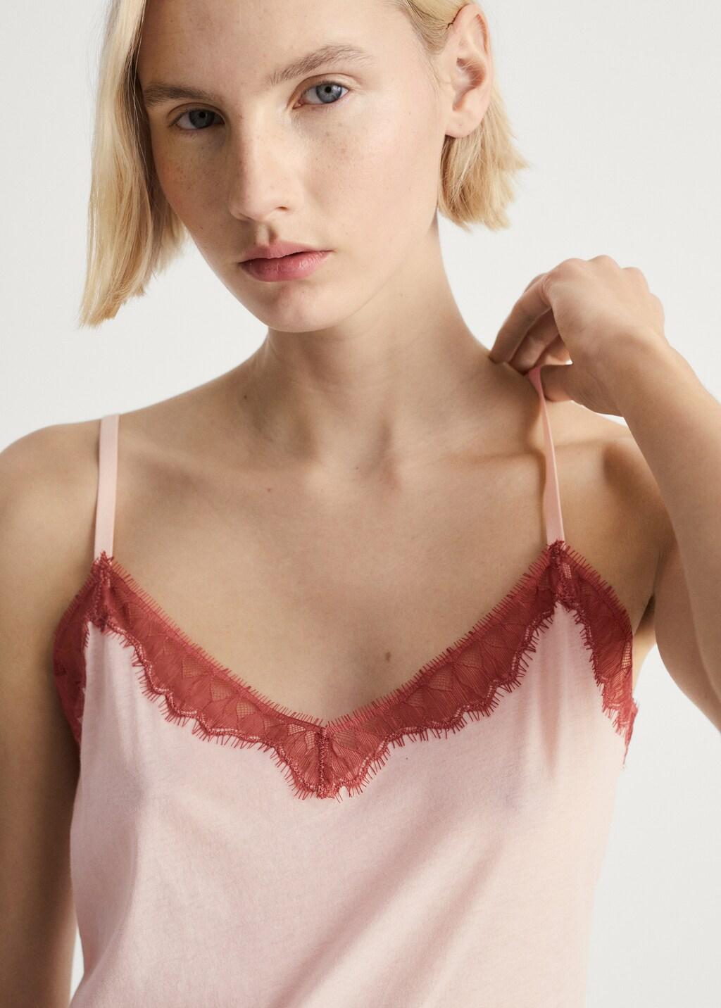 Camisón. Diseño corto. 100% Algodón. Detalle encaje. Tirantes finos. Cuello pico. Textura suave. La composición 100% algodón sugiere que es un tejido natural, transpirable y cómodo, ideal para ofrecer una sensación de frescura y confort durante el uso. Disponible en distintos colores