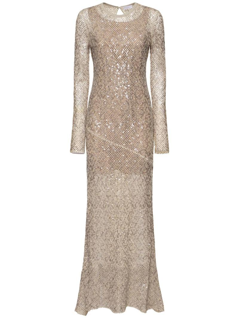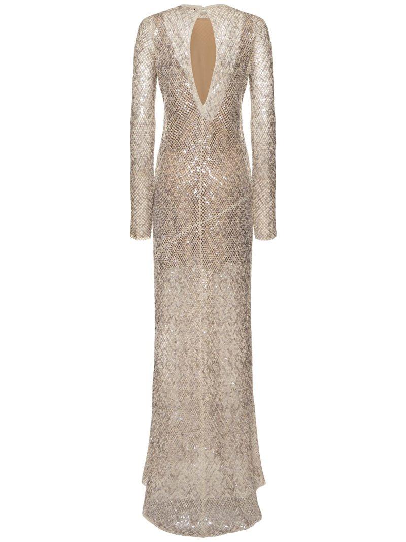 亮片露背长款连衣裙 - 米黄色 - 女士 - Brunello Cucinelli - 背面纽扣开合.