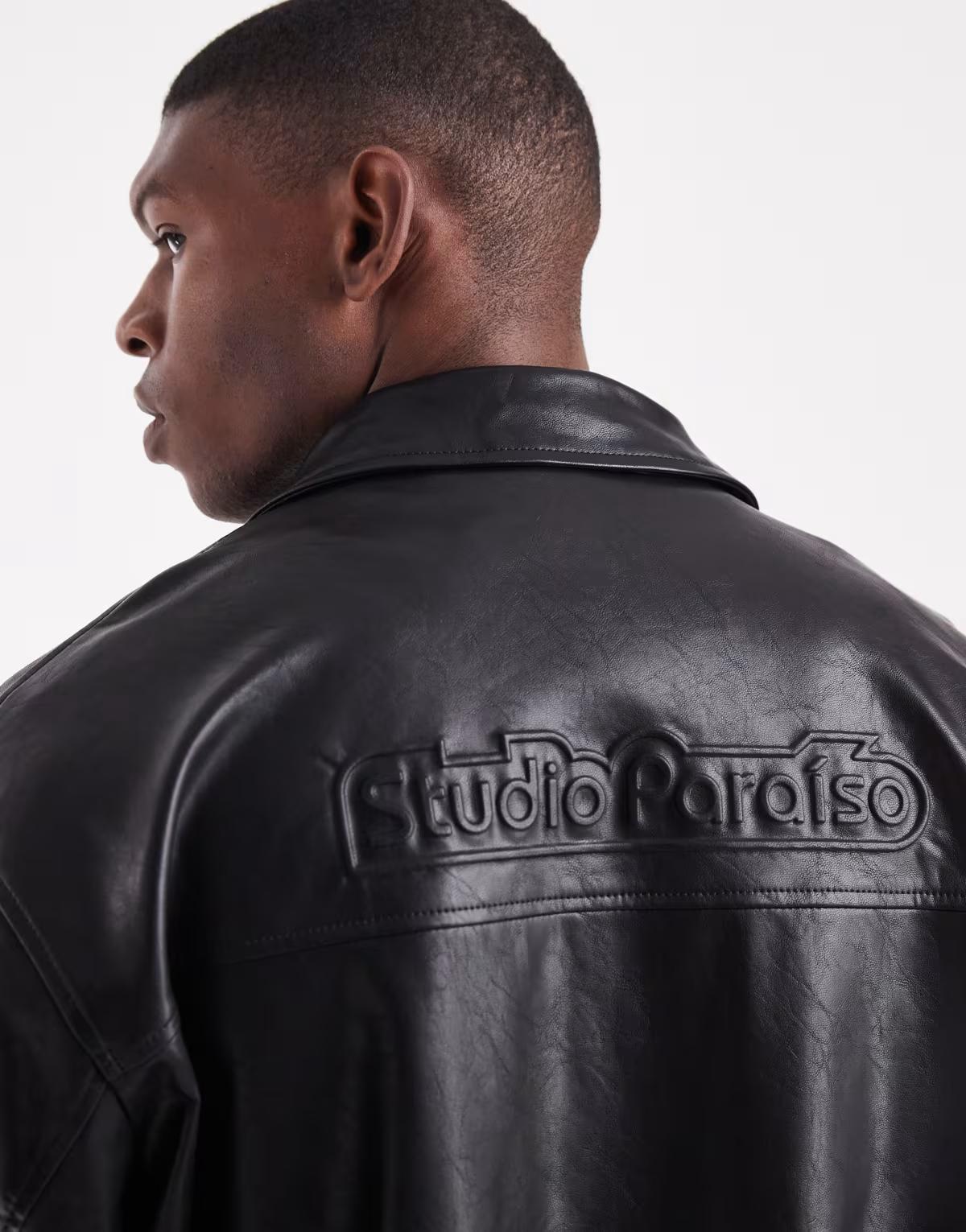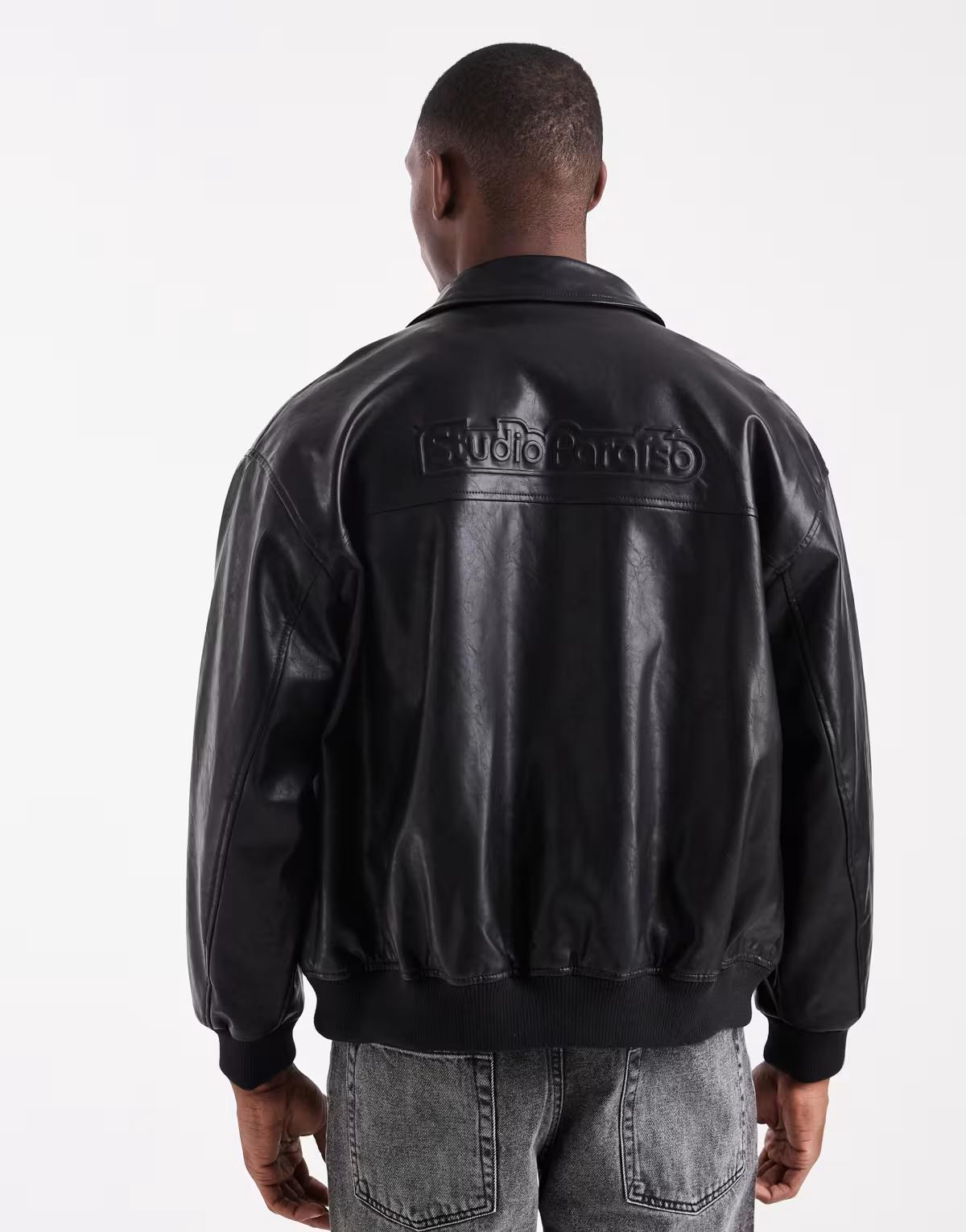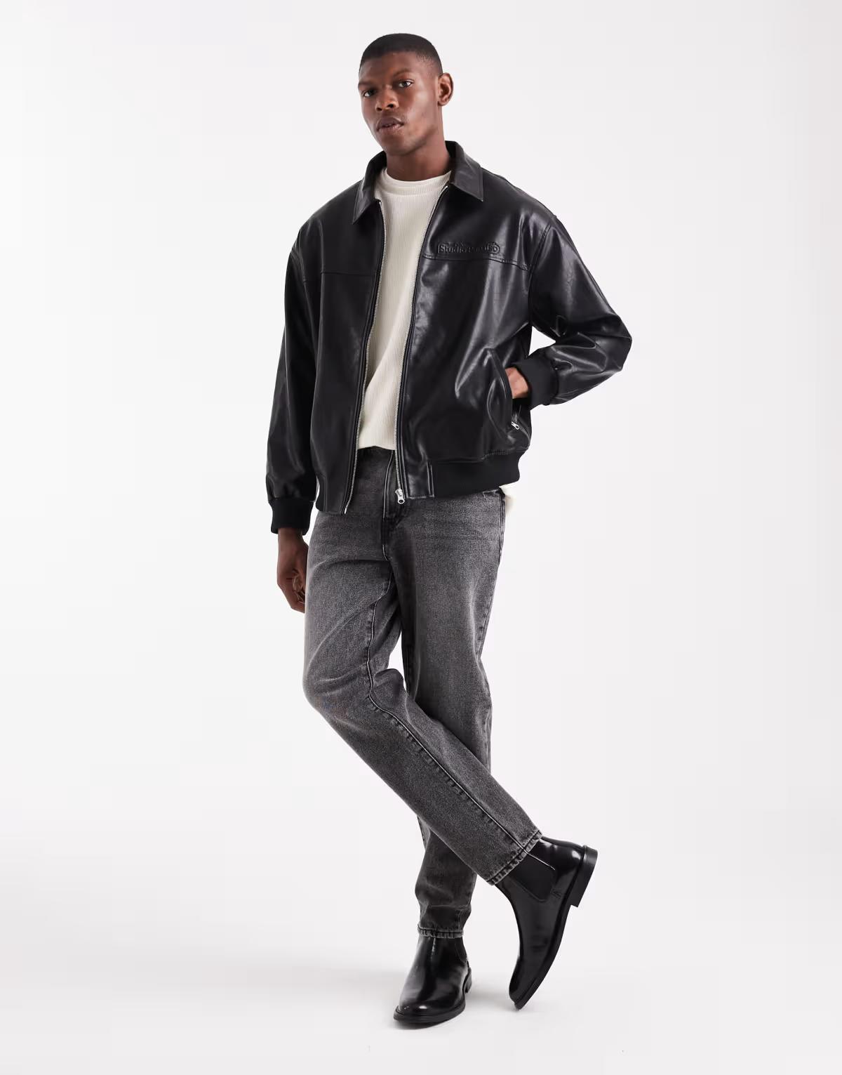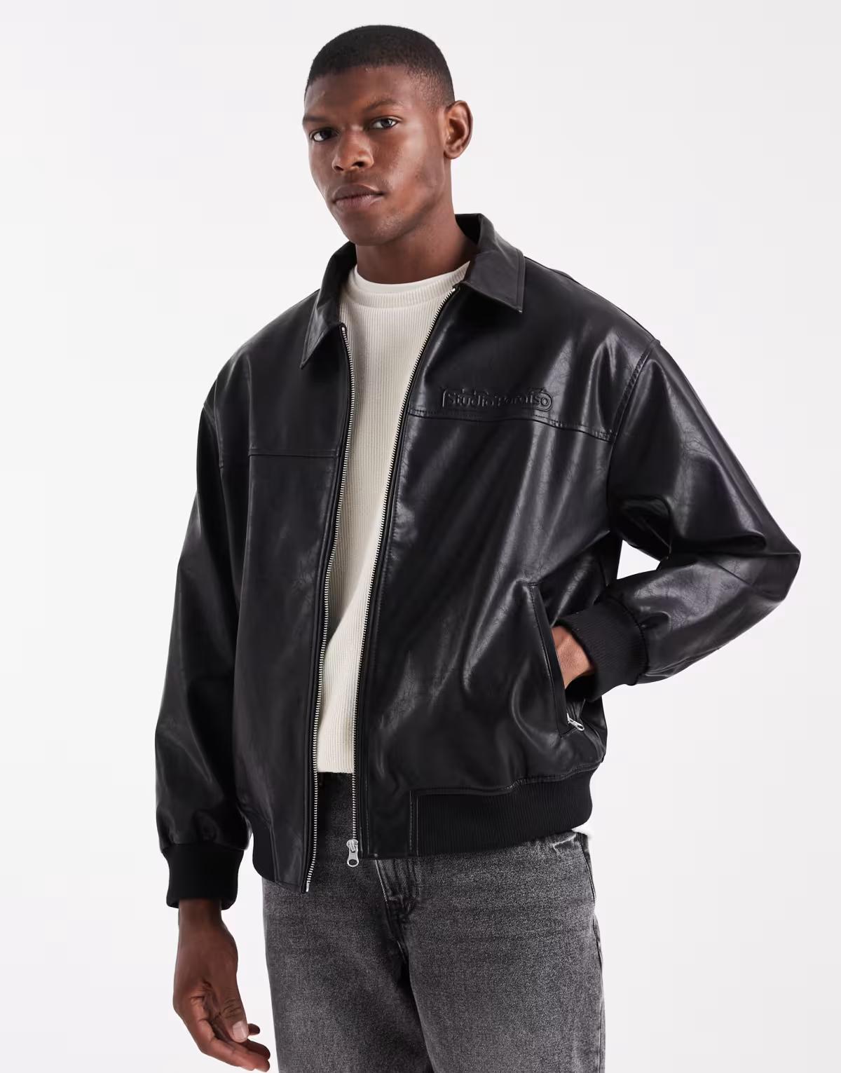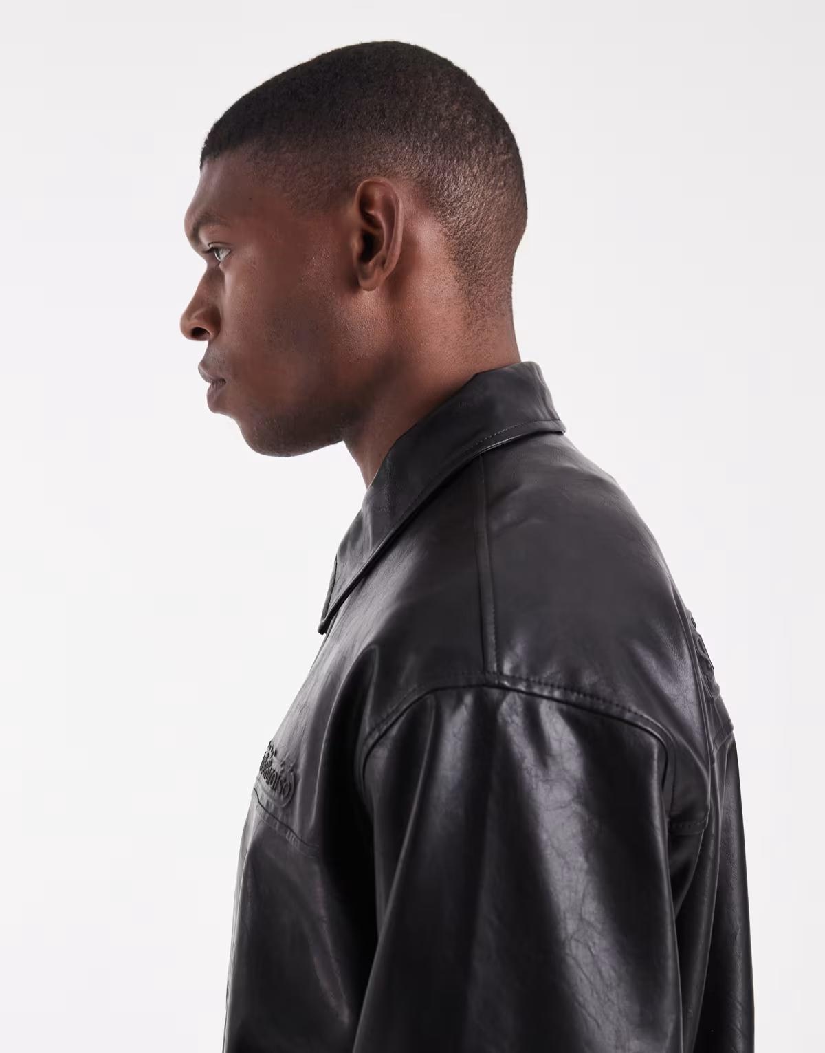ASOS DESIGN bomber jacket in faux leather with print detail in black