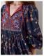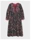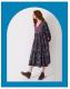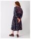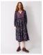 The product: Bloom in bohemia. Cloaked with winding florals in Autumnal hues over a dark backdrop, this dress is the perfect pattern to show off this season. Designed with long sleeves and a midi hem, the bib is embroidered with symmetrical flower designs for an elevated finish.