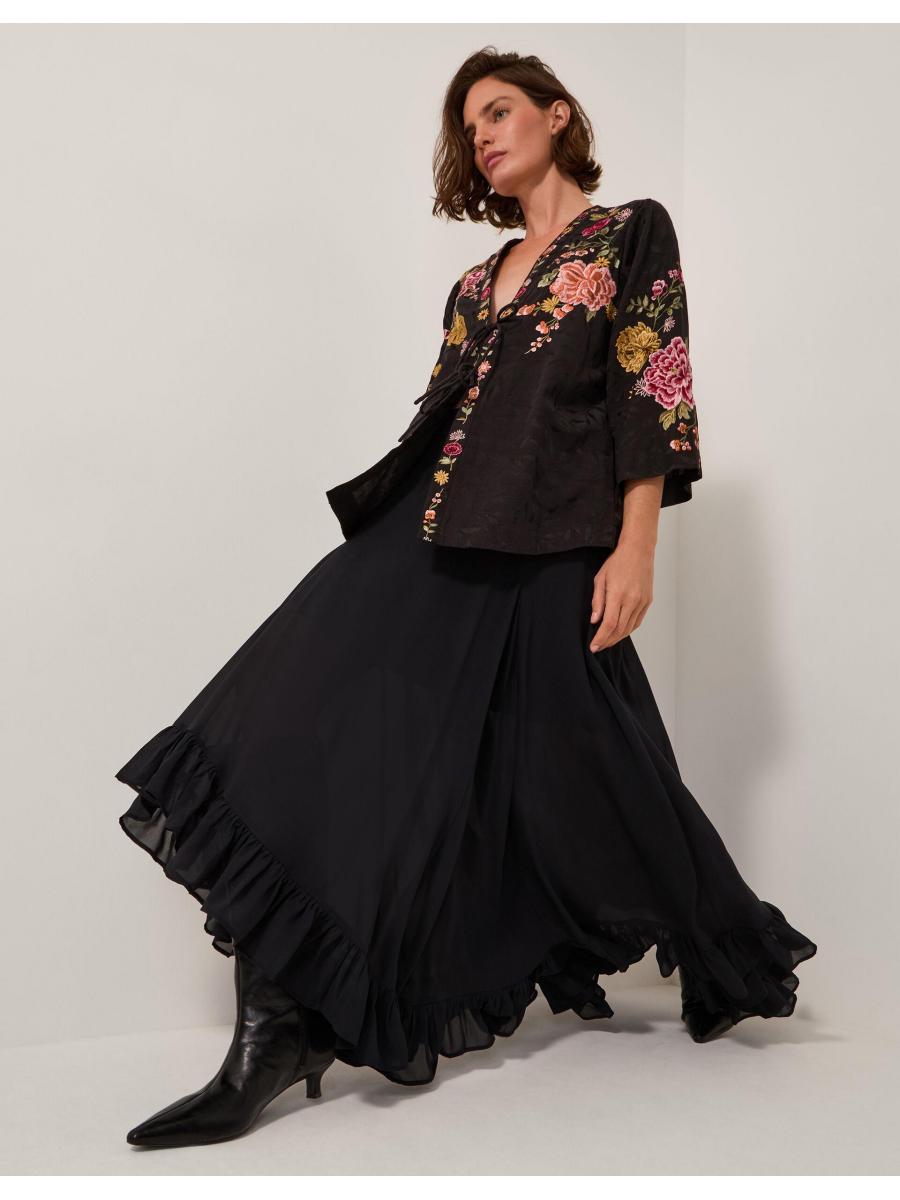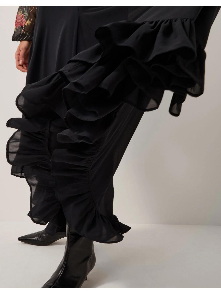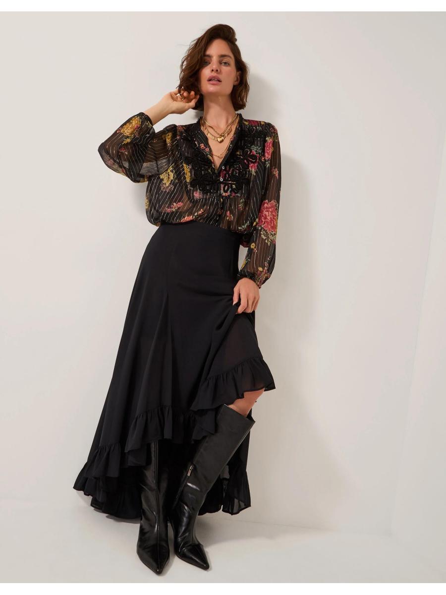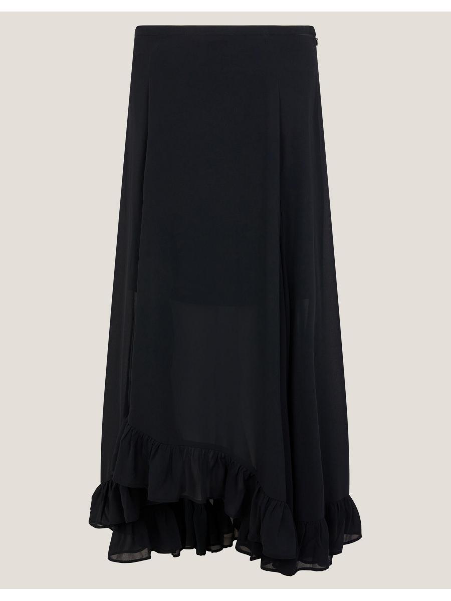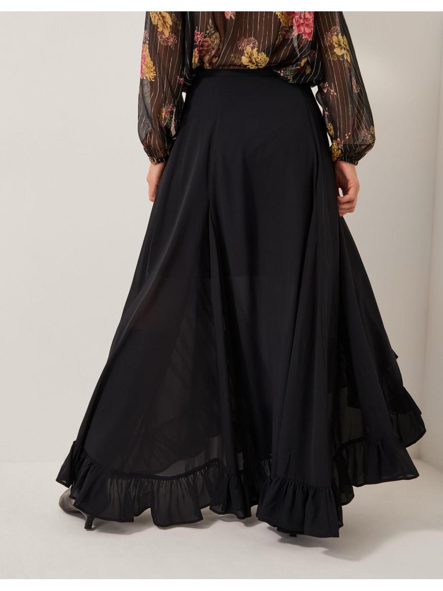Ooh la la! Feminine, flowy and fabulous, this maxi skirt was made for showing off. Featuring a breezy sheer overlay and a frilly hem, it's guaranteed to sway with every step. Pair it with a blouse and knee-high boots, and get ready to strut your stuff! Black