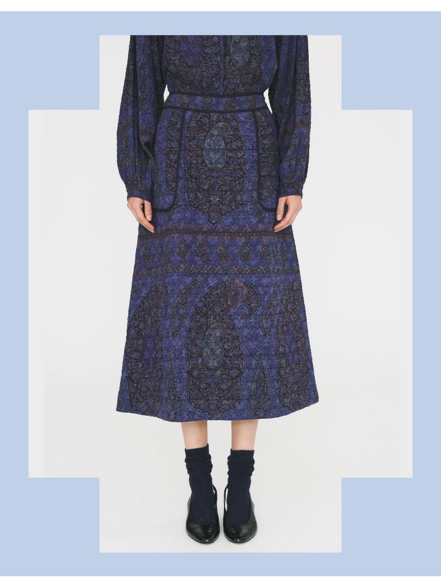 The product: Bohème dream. Ready to tuck in all the blouses, tops and T-shirts in your wardrobe, this skirt is a patterned piece of perfection. Printed with decorative paisley motifs, it's woven with a fil-coupé effect, giving raw texture to the jacquard fabric. Design features include an A-line silhouette and navy piping to define the waist and side pockets.