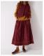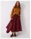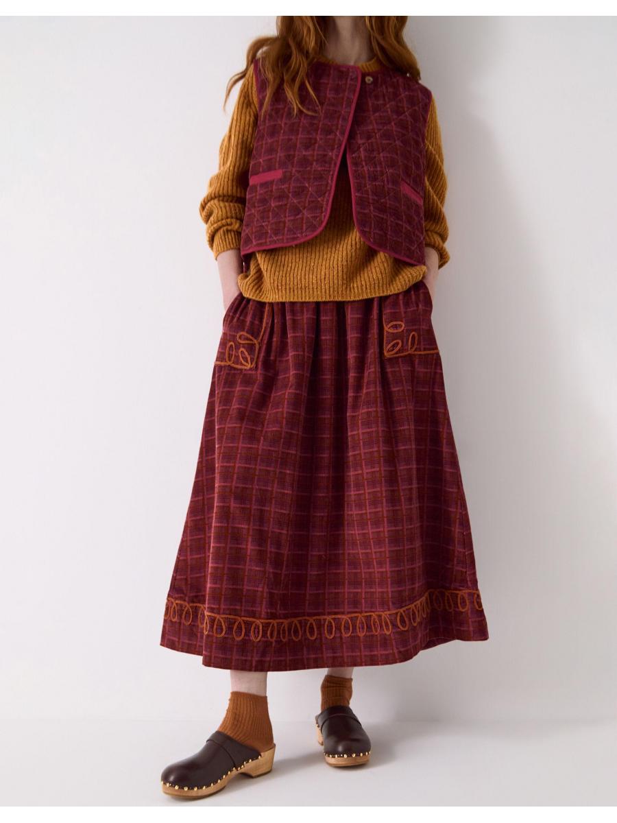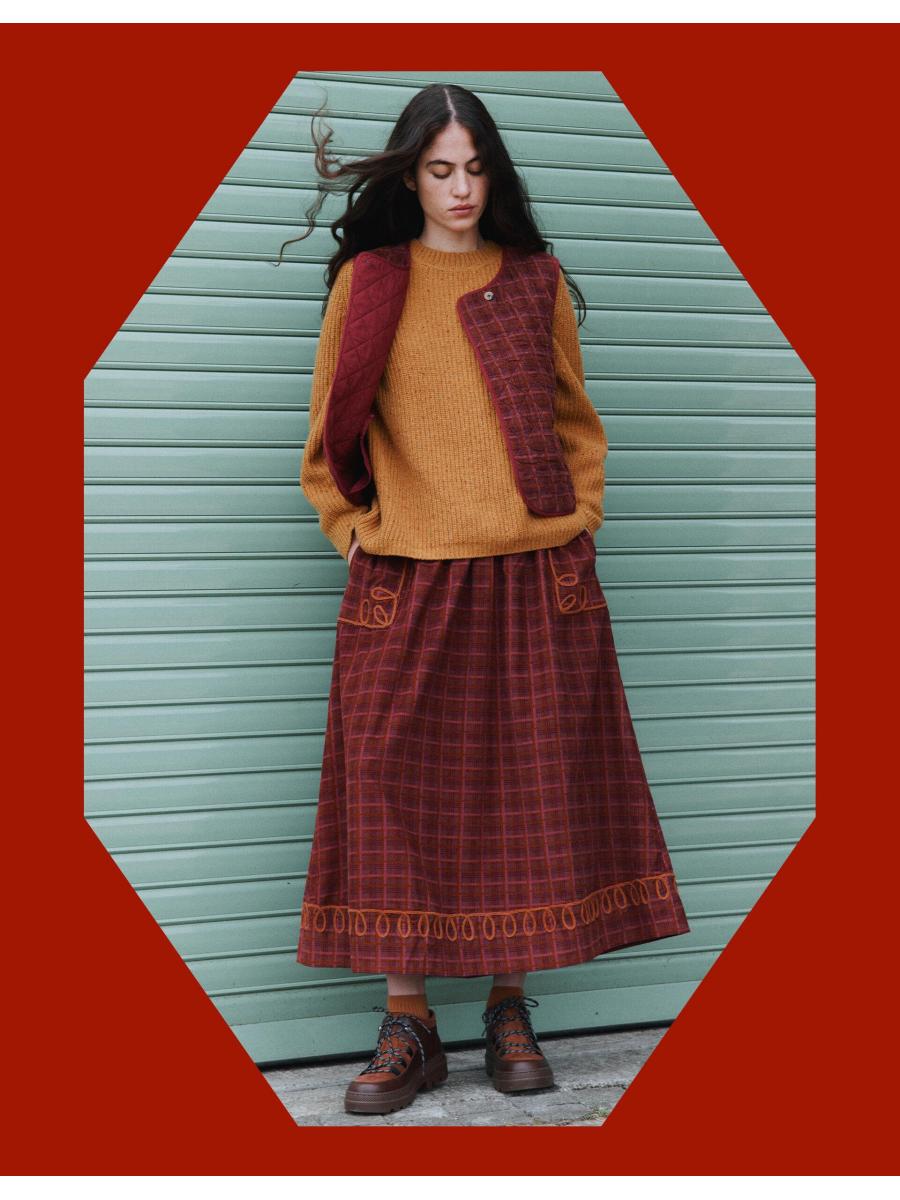 The product: Checkmate. Showcasing a dreamy cherry red tone and classic checkered pattern, this corduroy midi skirt *screams* Autumn. Our favourite parts? The curly embroidered detailing at the side pockets and hem.