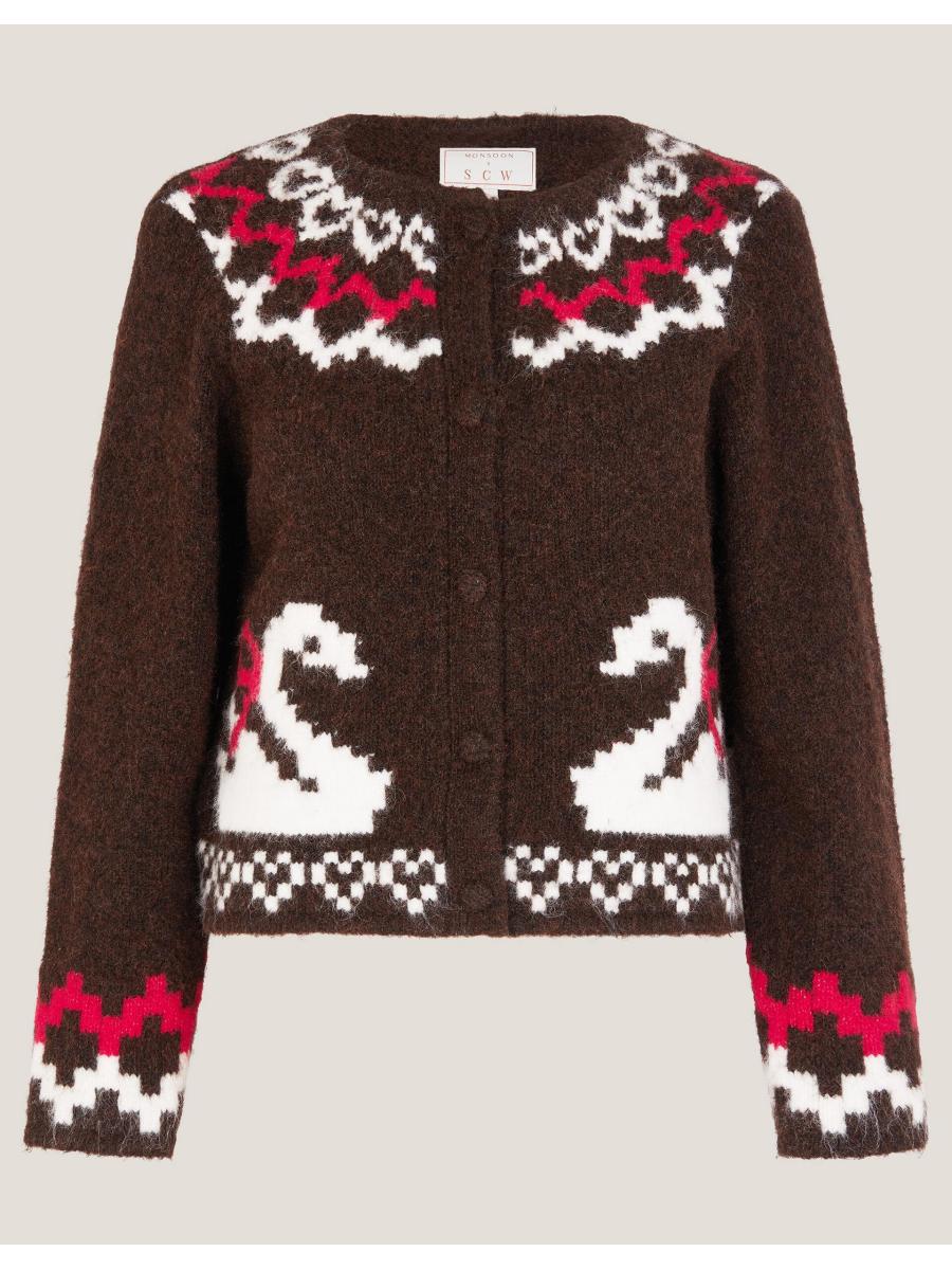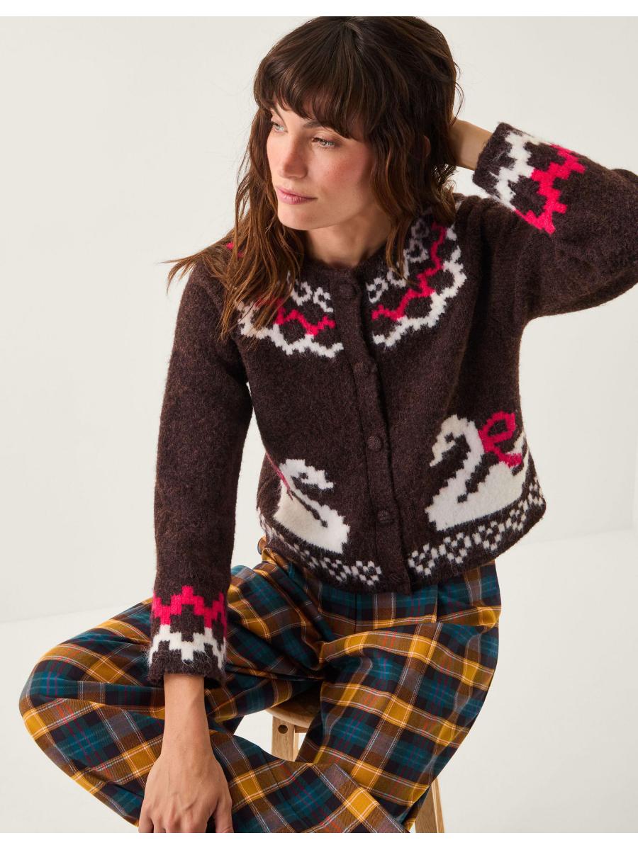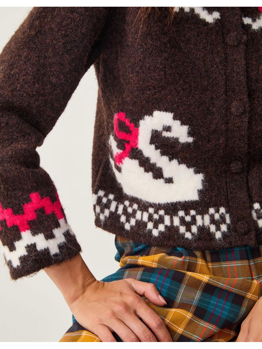 The swan and only. Stitched with cosy yarns in a delicious chocolate tone, this cardigan showcases bold Fair Isle patterns around the neckline and cuffs, whilst majestic swan motifs glides across the hem. With knitwear this cute, you'll be wishing for colder weather. Brown Details Fabric & Details Outer: Acrylic 39% , Elastane 3% , Polyester (Recycled) 53% , Wool (Sheep) 5% L 60 CM 30 degree wash Button fastening Crew Long sleeves Print Weight: 430.0 ID: 10013540063b-details__content-item"> Outer: Acrylic 39% , Elastane 3% , Polyester (Recycled) 53% , Wool (Sheep) 5%