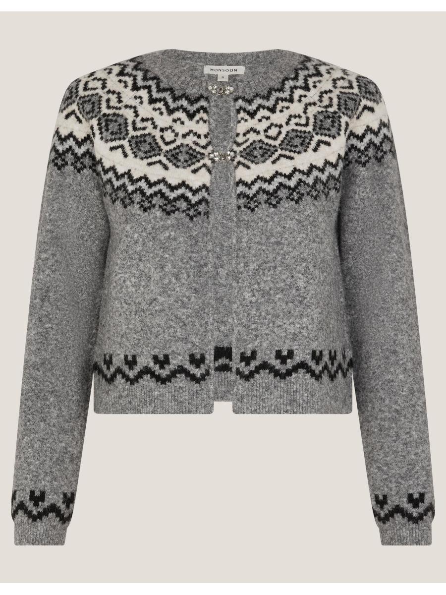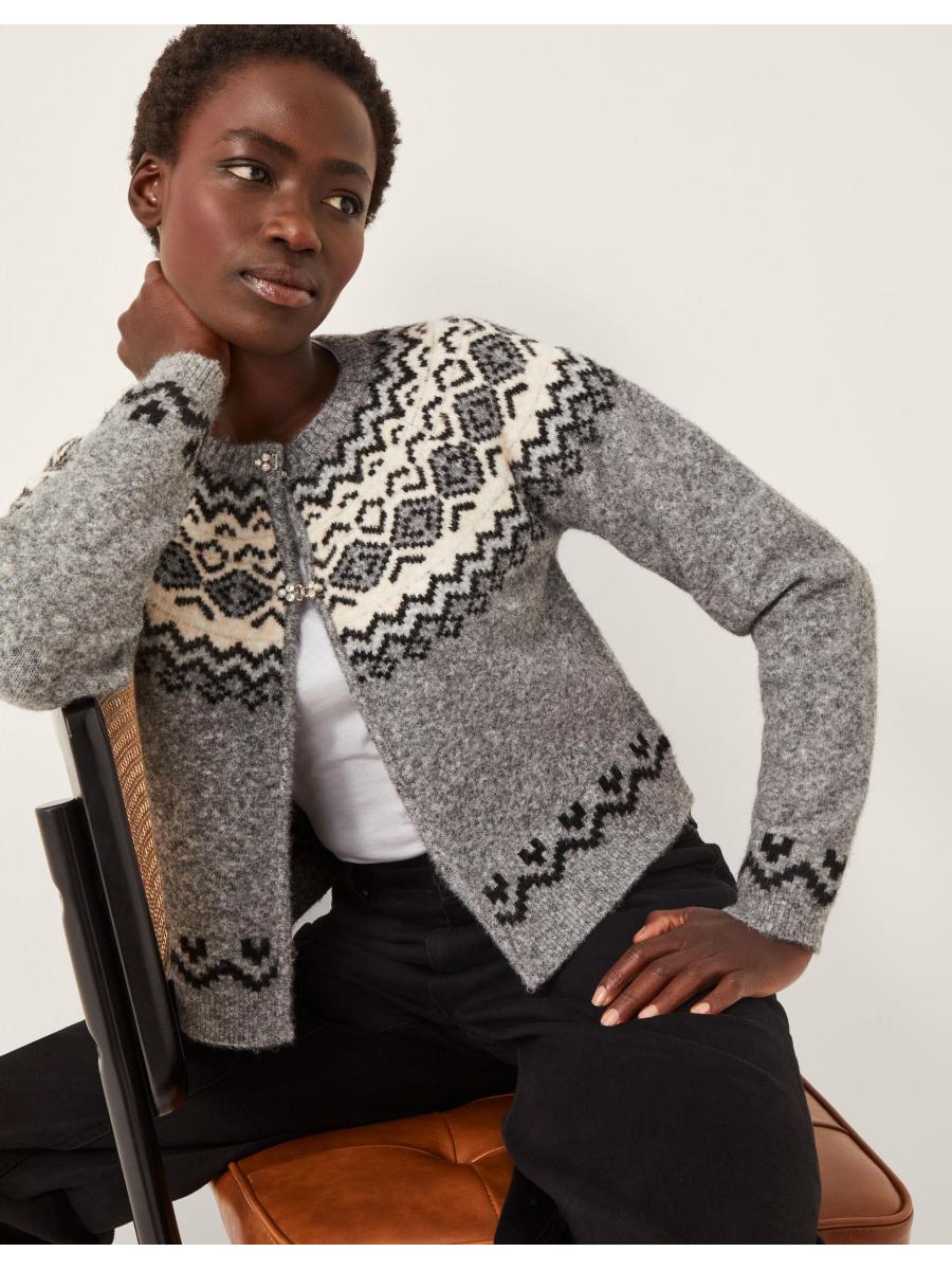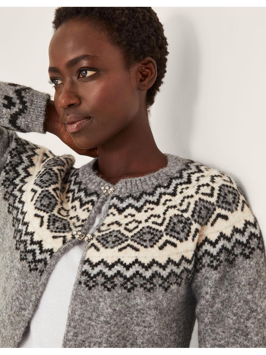 Description Monochrome has never looked better. Designed with a classic fair isle print, this cardigan features two diamanté fastenings so you can stay warm while still showing off your outfit. Layer on top of a plain tee and style with trousers, jeans or a skirt- whatever you're fancying... Grey Details Fabric & Details Outer: Acrylic 39% , Elastane 3% , Polyester (Recycled) 53% , sheep wool 5% L 60 CM machine wash Button fastening Crew Long sleeves Print Regular fit Weight: 230.0 ID: 10013500004b-details__content-item"> Outer: Acrylic 39% , Elastane 3% , Polyester (Recycled) 53% , sheep wool 5%