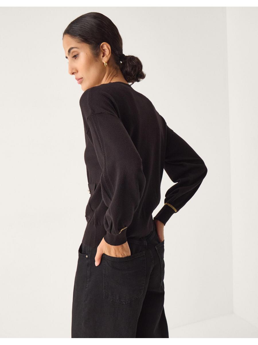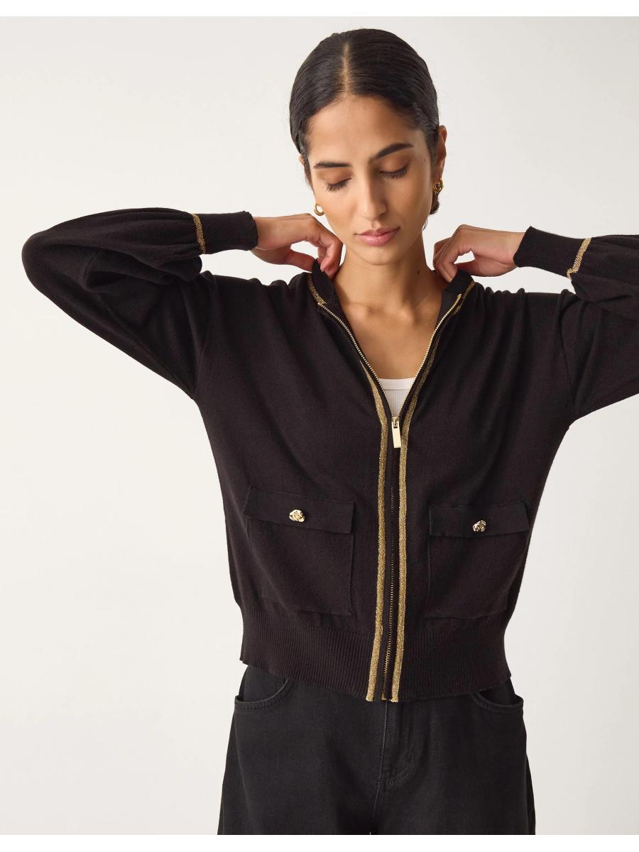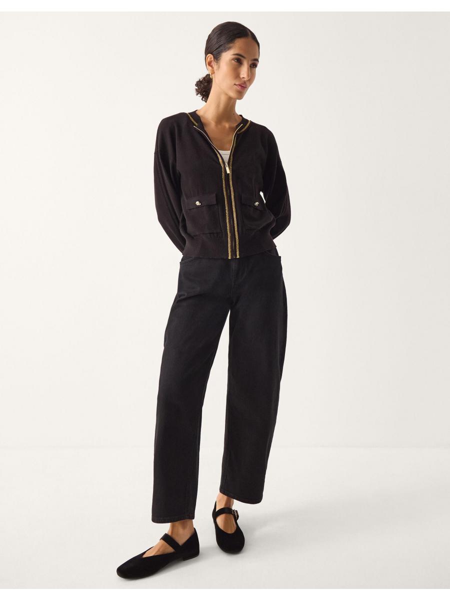 Make every layer count. Designed with a sparkle trim and front pockets, this super soft knit bomber is your styling hack to looking cute and staying cosy. Pairing perfectly with denim, it'll become your go-to for running errands, going shopping and grabbing a latte. Black