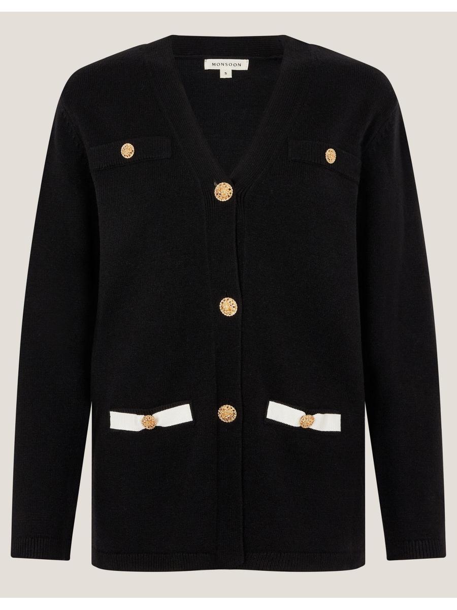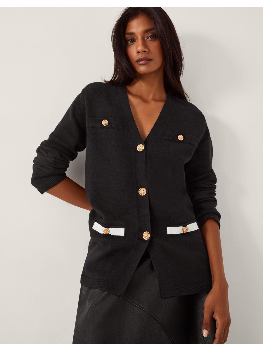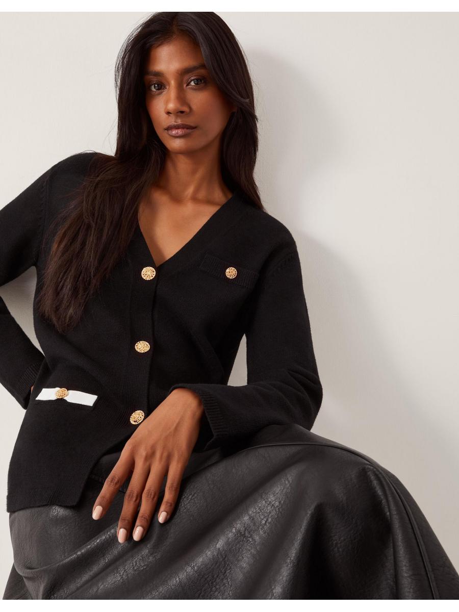 Description Make every layer count. Designed with gold-tone textured buttons and soft white details, this cardigan is perfect for slipping on top of blouses and t-shirts. Cosy and cute, it'll be your go-to for in-office days and weekend brunch. Black Details Fabric & Details Outer: Polyamide 2 22% , Polyester 28% , Viscose 50% L 70 CM machine wash Button fastening Vneck Long sleeves Plain Weight: 560.0 ID: 10013360001b-details__content-item"> Outer: Polyamide 2 22% , Polyester 28% , Viscose 50%
