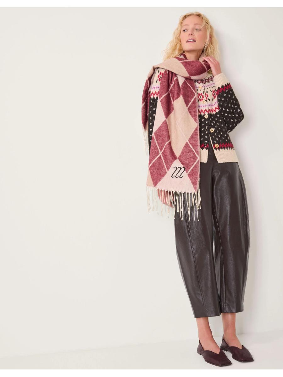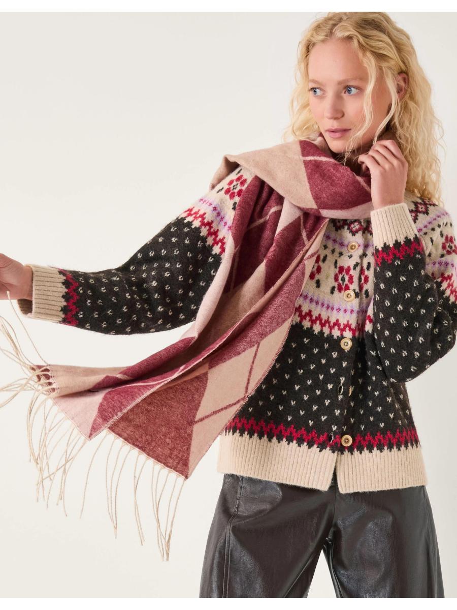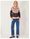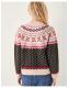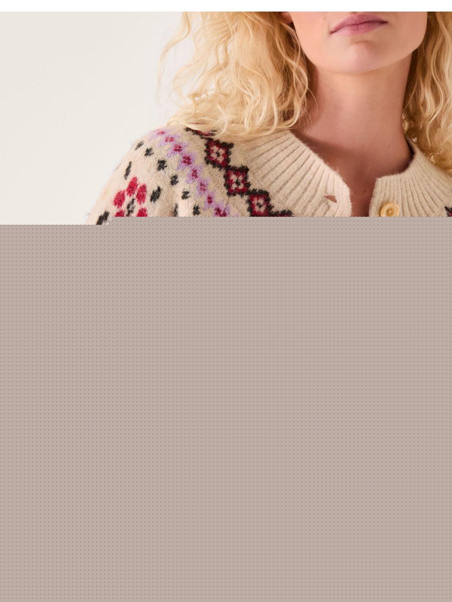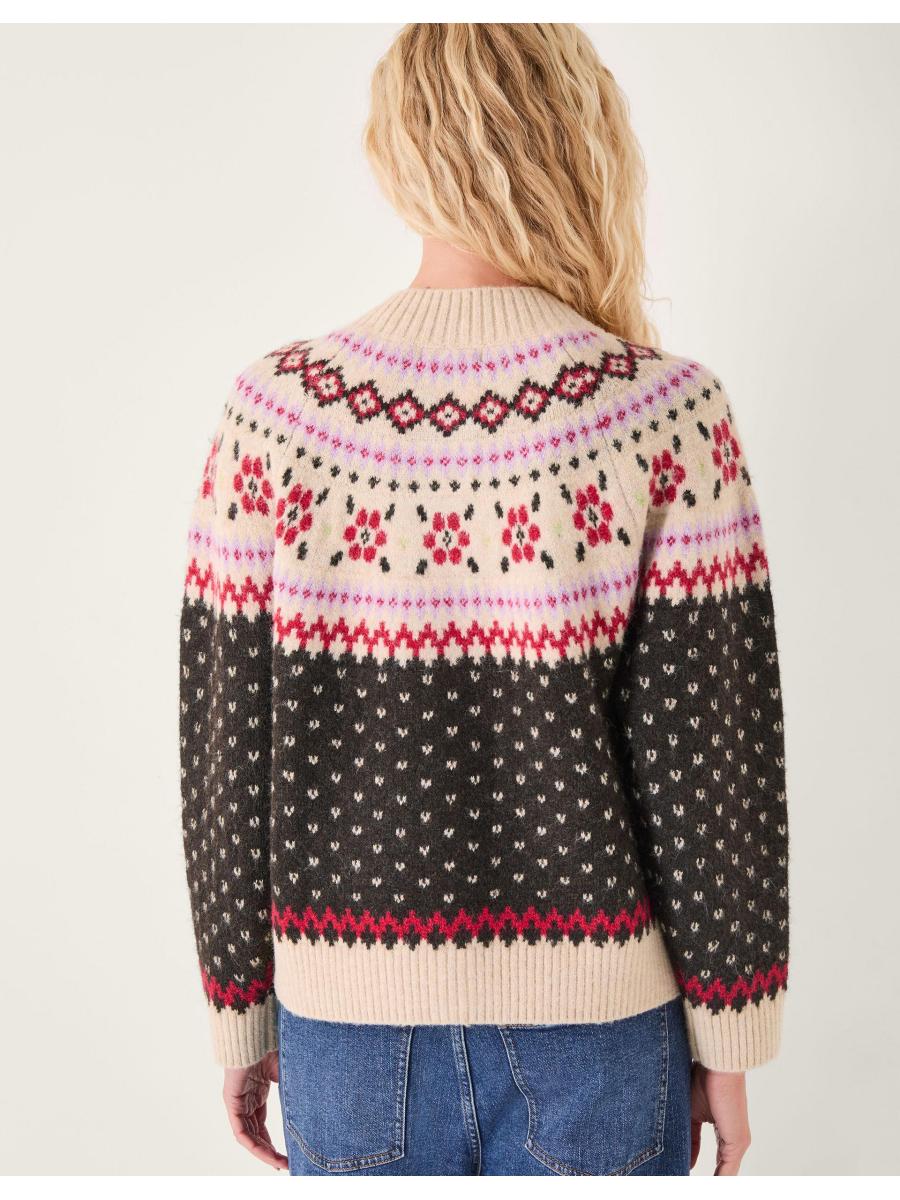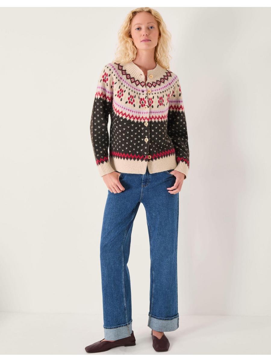 Cosy casual. Welcome this transitional staple into your autumn wardrobe, best styled with light layers or as a solo piece. Stitched with a decorative Fair Isle pattern, this knitted cardigan is framed with a round neckline and ribbed hems. Brown