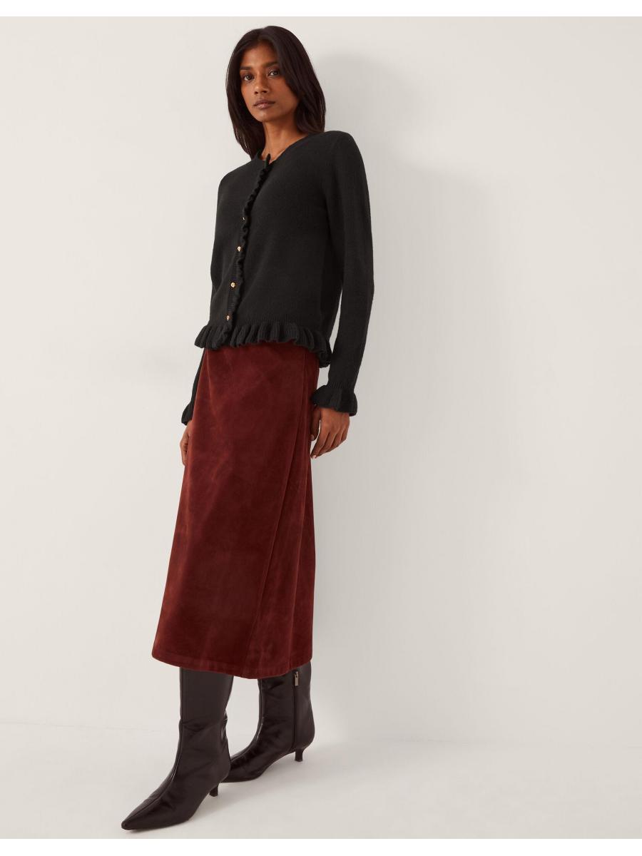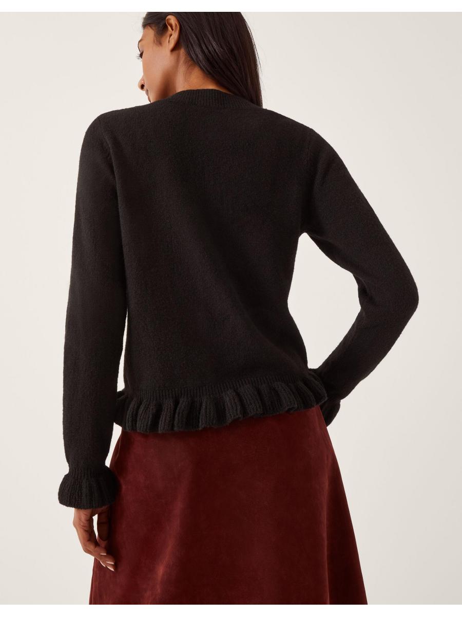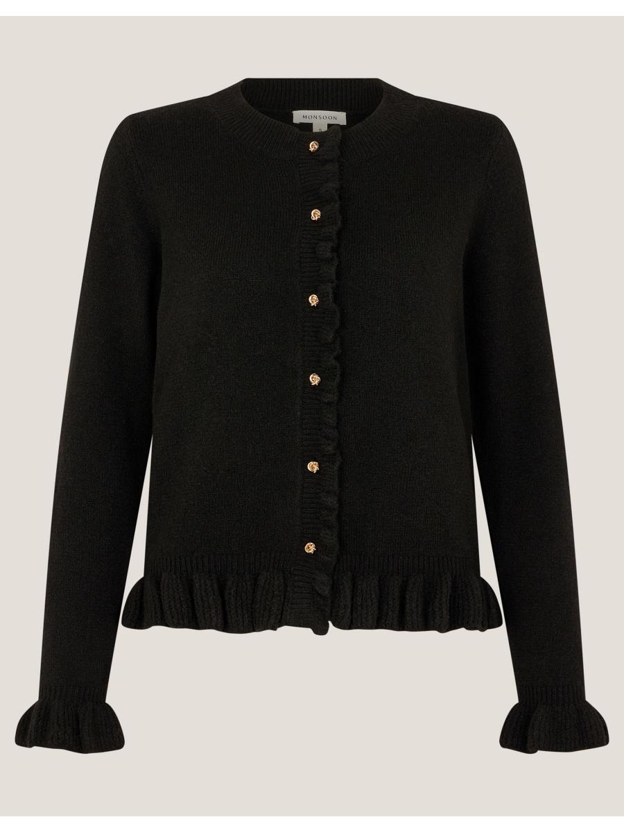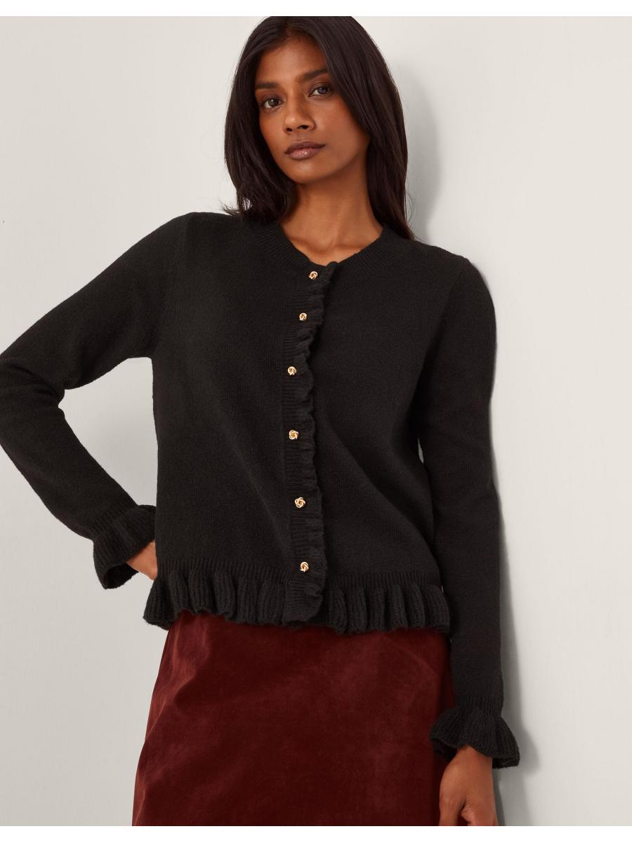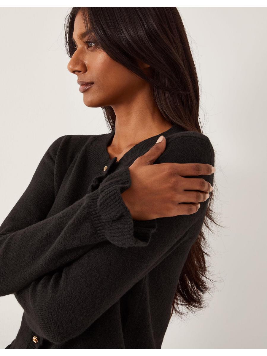 Here for the frills. Bringing a playful vibe to your knitwear collection, this cardi is stitched with super-soft yarns and ruffles around the cuffs and hem. Complete with gold knot button fastenings for an elevated finish. Black
