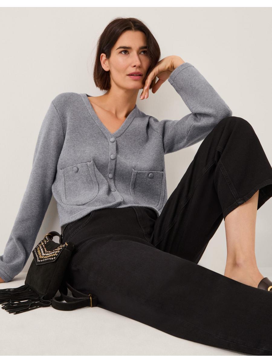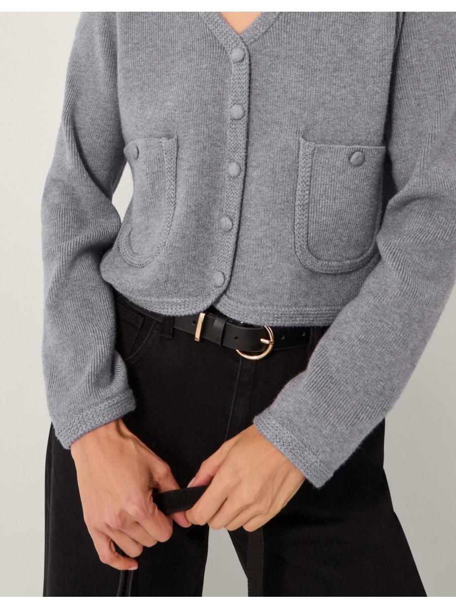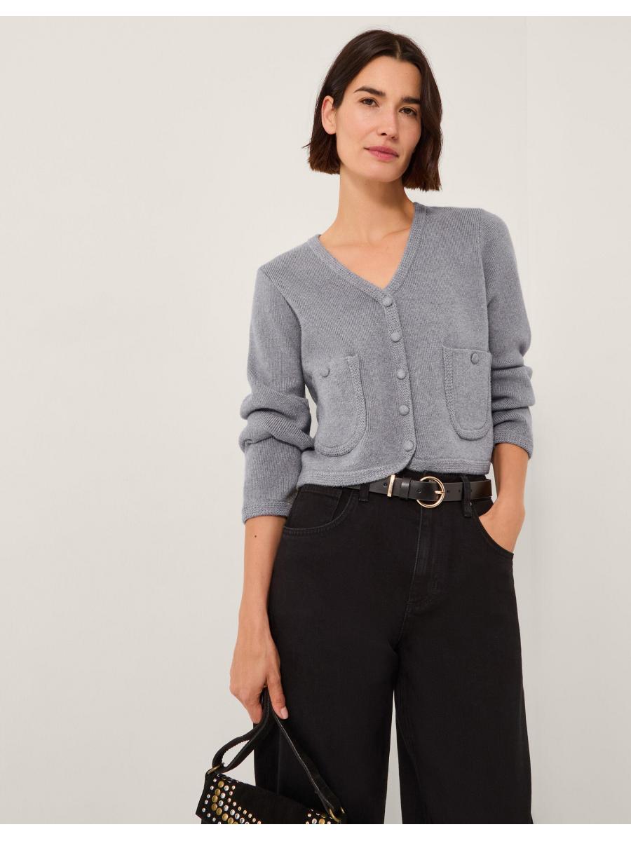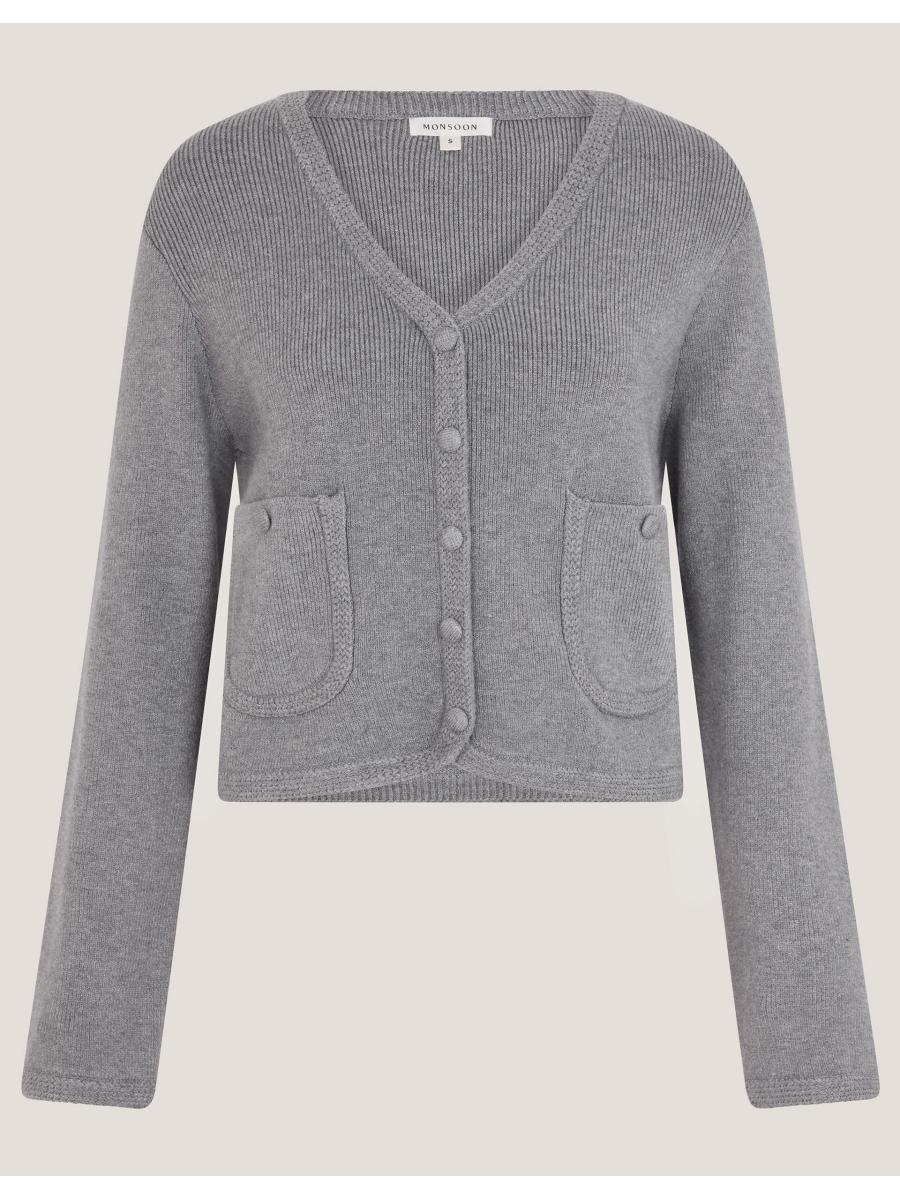 Description Looks like your high waist jeans have got a new bestie. Designed with a v-neckline and slightly cropped hem, this cardi is a timeless pick for your A/W looks. Finished with patch pockets and front button fastenings. Grey Details Fabric & Details Outer: Polyamide 2 22% , Polyester 28% , Viscose 50% L 60 CM 30 degree wash Button fastening Vneck Long sleeves Plain Relaxed fit Weight: 440.0 ID: 10012920004b-details__content-item"> Outer: Polyamide 2 22% , Polyester 28% , Viscose 50%