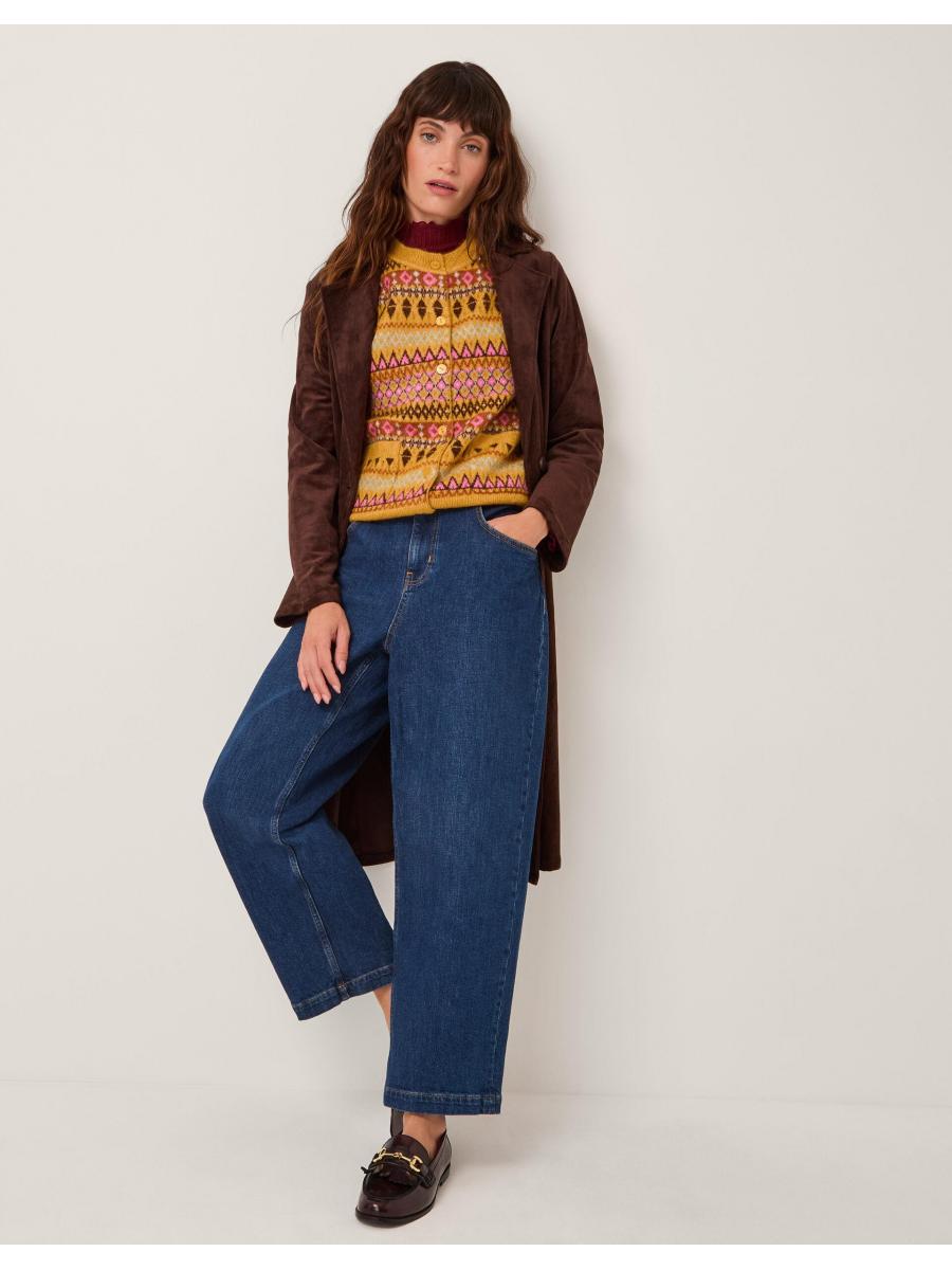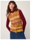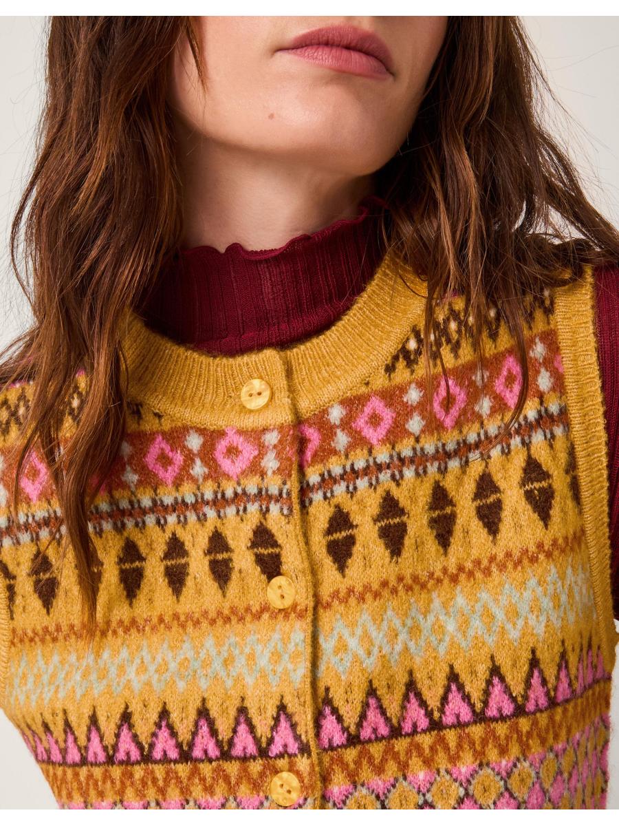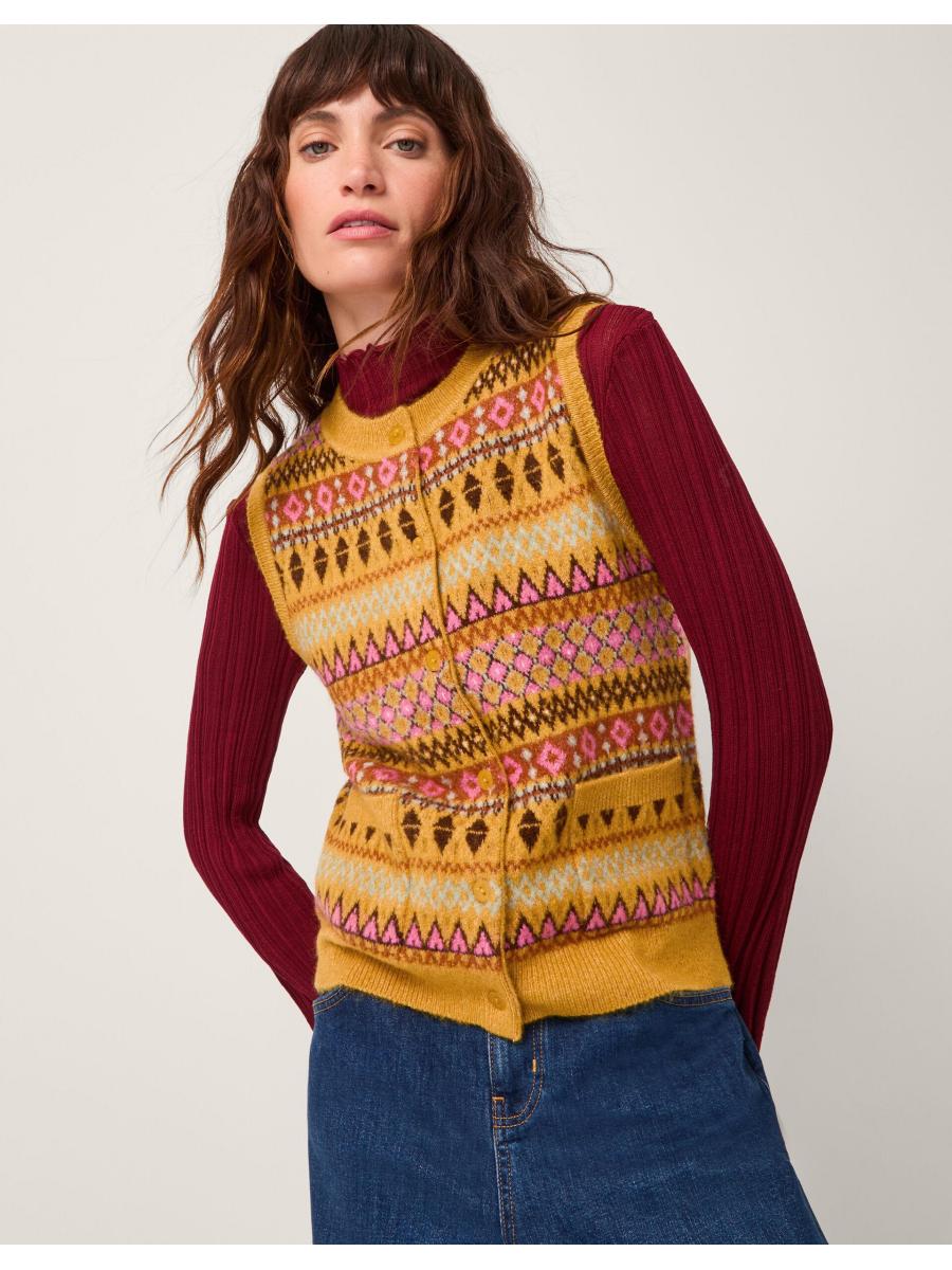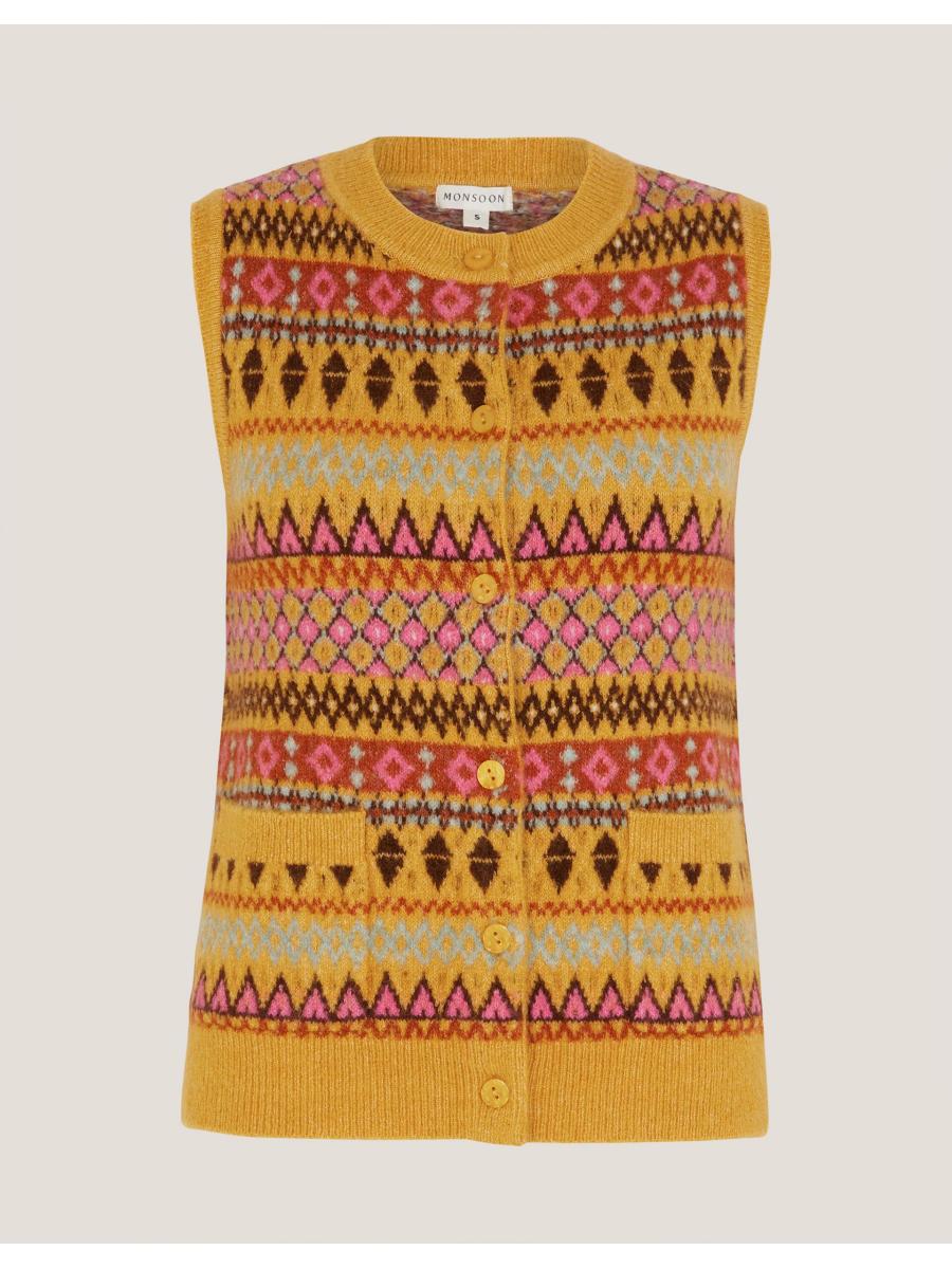 Knit happens. A cosy layer to style over T-shirts and long sleeve tops, this knitted vest is stitched with a decorative fair isle pattern in a mix of mustard and baby pink hues. Finished with front button fastenings and two patch pockets. Yellow
